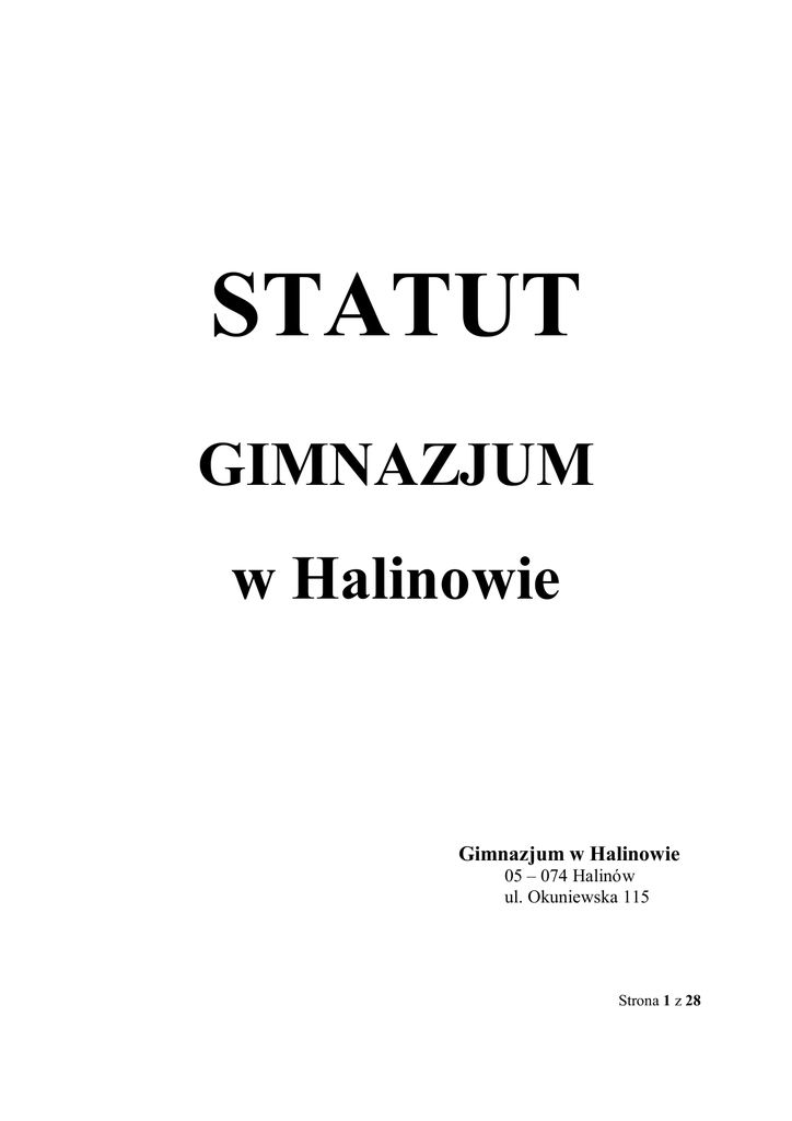 STATUT GIMNAZJUM w Halinowie Gimnazjum w Halinowie 05 – 074 Halinów ul. Okuniewska 115 Strona 1 z 28 Rozdział I WSTĘP Podstawą prawną opracowania Statutu Gimnazjum w Halinowie są: 1. Ustawa z dnia 20 lutego 2015 r. o systemie oświaty oraz niektórych innych ustaw ( Dz. U. z 2015 r., poz. 357 zwana dalej „ustawą zmieniającą”. 2. Rozporządzenie Ministra Edukacji Narodowej z dnia 21 maja 2001r. w sprawie ramowego statutu publicznego przedszkola oraz publicznych szkół, z późniejszymi zmianami ( Dz. U. Nr 61 poz. 624 ze zmianami). 3. Rozporządzenie Ministra Kultury i Dziedzictwa Narodowego w sprawie ramowych statutów publicznych szkół i placówek artystycznych z 11 grudnia 2014 r. (Dz. U z 2014 r. poz. 1646). 4. Rozporządzenie Ministra Edukacji Narodowej i Sportu w sprawie ramowych statutów placówek publicznych (Dz. U. 2005 Nr 52 poz.466). 5. Rozporządzenie Ministra Edukacji Narodowej z dnia 30 kwietnia 2007 r. w sprawie warunków i sposobu oceniania, klasyfikowania i promowania uczniów i słuchaczy oraz przeprowadzania sprawdzianów i egzaminów w szkołach publicznych(Dz. U. Nr 83 poz.562 ze zm.). 6. Rozporządzenie Ministra Edukacji Narodowej z dnia 30 kwietnia 2013 r. w sprawie zasad udzielania i organizacji pomocy psychologiczno-pedagogicznej w publicznych przedszkolach, szkołach i placówkach (Dz. U. Nr 228 poz1487). 7. Rozporządzenie Ministra Edukacji Narodowej z dnia 14.04.1992r. w sprawie warunków i sposobu organizowania nauki religii w publicznych szkołach i przedszkolach, zmienione rozporządzeniem z dnia 25.03.2014r. (Dz.U. nr 478) od dnia 01.09.2014r. Rozdział II POSTANOWIENIA OGÓLNE §1 1. Szkoła nosi nazwę: Gimnazjum w Halinowie. 2. Skreślony §2 Siedzibą Gimnazjum jest budynek położony przy ul. Okuniewskiej 115, 05-074 Halinów. §3 1. Organem prowadzącym Gimnazjum jest Gmina Halinów. 2. Organem sprawującym nadzór pedagogiczny jest Kuratorium Oświaty w Warszawie. Strona 2 z 28 §4 1. Gimnazjum używa nazwy: „Gimnazjum w Halinowie”. 2. Skreślony. §5 Gimnazjum prowadzi i przechowuje dokumentację zgodnie z odrębnymi przepisami. §6 Zasady prowadzenia obsługi finansowo – księgowej Gimnazjum określają odrębne przepisy i uchwały Rady Miejskiej. Rozdział III ORGANIZACJA SZKOŁY §7 1. Terminy przerw świątecznych oraz ferii zimowych i letnich określają przepisy w sprawie organizacji roku szkolnego. 2. W szkole zajęcia dydaktyczne rozpoczynają się w pierwszym powszednim dniu września (z wyjątkiem soboty), a kończą się w ostatni piątek czerwca. §8 Rok szkolny dzieli się na dwa semestry. Semestr I trwa od początku roku szkolnego do ostatniego piątku stycznia następnego roku. Semestr II trwa do ostatniego piątku czerwca. W Gimnazjum przeprowadza się klasyfikację śródroczną podsumowująca semestr I. §9 1. Szczegółową organizację nauczania, wychowania i opieki w danym roku szkolnym określa arkusz organizacji opracowany przez dyrektora, z uwzględnieniem szkolnego planu nauczania, o którym mowa w przepisach w sprawie ramowych planów nauczania - do dnia 30 kwietnia każdego roku. Arkusz organizacji zatwierdza organ prowadzący do dnia 30 maja danego roku. 2. Arkusz organizacji szkoły określa w szczególności: 1) liczbę pracowników pedagogicznych oraz pracowników nie będących nauczycielami; 2) ogólną liczbę godzin edukacyjnych finansowanych ze środków przydzielonych przez organ prowadzący; 3) przewidywaną liczbę wychowanków, uczniów i oddziałów; 4) przewidywaną liczbę zajęć pozalekcyjnych Strona 3 z 28 3. Organizację stałych, obowiązkowych i nadobowiązkowych i wychowawczych określa tygodniowy rozkład zajęć. zajęć dydaktycznych 4. Tygodniowy rozkład zajęć jest ustalony przez dyrektora szkoły z uwzględnieniem: 1) podstawowych zasad higieny umysłowej; 2) potrzeb eksperymentów i innowacji realizowanych w szkole; 3) możliwości zapewnienia zastępstw za nieobecnych nauczycieli. 5. Skreślony 6. Za szczegółową organizację nauczania, wychowania i opieki w Gimnazjum w postaci zatwierdzonego przez organ prowadzący arkusza organizacyjnego odpowiada Dyrektor szkoły. § 10 Podstawową jednostką organizacyjną Gimnazjum jest oddział złożony z uczniów. § 11 1. Cykl kształcenia w Gimnazjum: 1.1. do Gimnazjum przyjmowani są uczniowie, którzy posiadają świadectwo ukończenia szkoły podstawowej; 1.2. w Gimnazjum cykl kształcenia trwa 3 lata i w ostatnim roku nauki przeprowadza się egzamin, dający możliwość dalszego kształcenia w szkołach ponadgimnazjalnych; 1.3. uczeń, który ukończył gimnazjum posiada wykształcenie gimnazjalne. 1.4. obowiązek szkolny w gimnazjum trwa do ukończenia przez ucznia 18 roku życia. 1.5. uczeń może spełniać obowiązek szkolny poza szkołą pod warunkiem uzyskania przez rodziców zezwolenia dyrektora szkoły. Rodzice na podstawie pisemnego oświadczenia są zobowiązani do zapewnienia dziecku warunków umożliwiających realizację podstawy programowej. § 12 1. Podstawowymi formami działalności dydaktyczno-wychowawczej szkoły są: 1.1. obowiązkowe zajęcia edukacyjne, do których zalicza się zajęcia edukacyjne z zakresu kształcenia ogólnego; 1.2. zajęcia edukacyjne z religii, etyki, wychowania do życia w rodzinie; 1.3. dodatkowe zajęcia edukacyjne, do których nie została ustalona podstawa programowa, lecz program nauczania tych zajęć został włączony do szkolnego zestawu programów nauczania. Zajęcia te organizuje dyrektor szkoły z zgodą organu prowadzącego szkołę po zasięgnięciu rady pedagogicznej i rady rodziców; 1.4. zajęcia rewalidacyjne dla uczniów niepełnosprawnych; 1.5. zajęcia prowadzone w ramach pomocy psychologiczno-pedagogicznej; 1.6. zajęcia rozwijające zainteresowania i uzdolnienia uczniów; 2. Skreślony 3. W Gimnazjum godzina lekcyjna trwa 45 minut. Strona 4 z 28 4. Dopuszcza się prowadzenie zajęć edukacyjnych w czasie od 30 do 60 minut, przy zachowaniu ustalonego