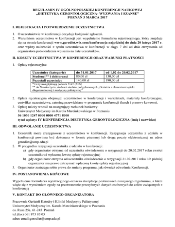 REGULAMIN IV OGÓLNOPOLSKIEJ KONFERENCJI NAUKOWEJ „DIETETYKA GERONTOLOGICZNA- WYZWANIA I SZANSE” POZNAŃ 3 MARCA 2017 I. REJESTRACJA I POTWIERDZENIE UCZESTNICTWA 1. O uczestnictwie w konferencji decyduje kolejność zgłoszeń. 2. Warunkiem uczestnictwa w konferencji jest wypełnienie formularza rejestracyjnego, który znajduje się na stronie konferencji www.gerodiet.wix.com/konferencja najpóźniej do dnia 20 lutego 2017 r. oraz wpłaty należności z tytułu uczestnictwa w konferencji w ciągu 7 dni od dnia otrzymania od organizatora potwierdzenia wpisania na listę uczestników. II. KOSZTY UCZESTNICTWA W KONFERENCJI ORAZ WARUNKI PŁATNOŚCI 1. Opłaty rejestracyjne: Uczestnicy (kategorie) Studenci** i doktoranci Pozostali uczestnicy do 31.01.2017 80,00 zł 140,00 zł od 1.02 do 20.02.2017 130,00 zł 190,00 zł * Ceny uwzględniają podatek VAT (23%) ** do 26 roku życia; studenci studiów podyplomowych „Geriatria z elementami opieki długoterminowej i medycyny paliatywnej” 2. Opłata rejestracyjna obejmuje: uczestnictwo w konferencji i warsztatach, materiały konferencyjne, certyfikat uczestnictwa, catering przewidziany w programie konferencji (lunch i przerwy kawowe). 3. Opłatę należy wnosić na następujący rachunek bankowy: Uniwersytet Medyczny im Karola Marcinkowskiego w Poznaniu 56 1030 1247 0000 0000 4771 8000 tytuł wpłaty: IV KONFERENCJA DIETETYKA GERONTOLOGICZNA (imię i nazwisko) III. ODWOŁANIE UCZESTNICTWA 1. Uczestnik może zrezygnować z uczestnictwa w konferencji. Rezygnacja uczestnika z udziału w konferencji powinna być dokonana w formie pisemnej lub drogą poczty elektronicznej na adres [email protected] 2. W przypadku rezygnacji uczestnika z udziału w konferencji: a) gdy organizator otrzyma od uczestnika oświadczenie o rezygnacji do 20.02.2017 roku zwróci uczestnikowi wpłaconą kwotę opłaty rejestracyjnej b) gdy organizator otrzyma od uczestnika oświadczenie o rezygnacji 21.02.2017 roku lub później organizator ma prawo zatrzymać wpłaconą kwotę opłaty rejestracyjnej 3. Organizator zastrzega sobie prawa do zmiany programu, jak również odwołania Konferencji. IV. POSTANOWIENIA KOŃCOWE Wypełnienie formularza rejestracyjnego oznacza akceptację postanowień niniejszego regulaminu, a także wiąże się z wyrażeniem zgody na przetwarzanie przesyłanych danych osobowych do celów związanych z konferencją V. KONTAKT DO GŁÓWNEGO ORGANIZATORA Pracownia Geriatrii Katedry i Kliniki Medycyny Paliatywnej Uniwersytet Medyczny im. Karola Marcinkowskiego w Poznaniu os. Rusa 25a, 61-245 Poznań tel.(fax) 061 873 83 03 adres email:[email protected]