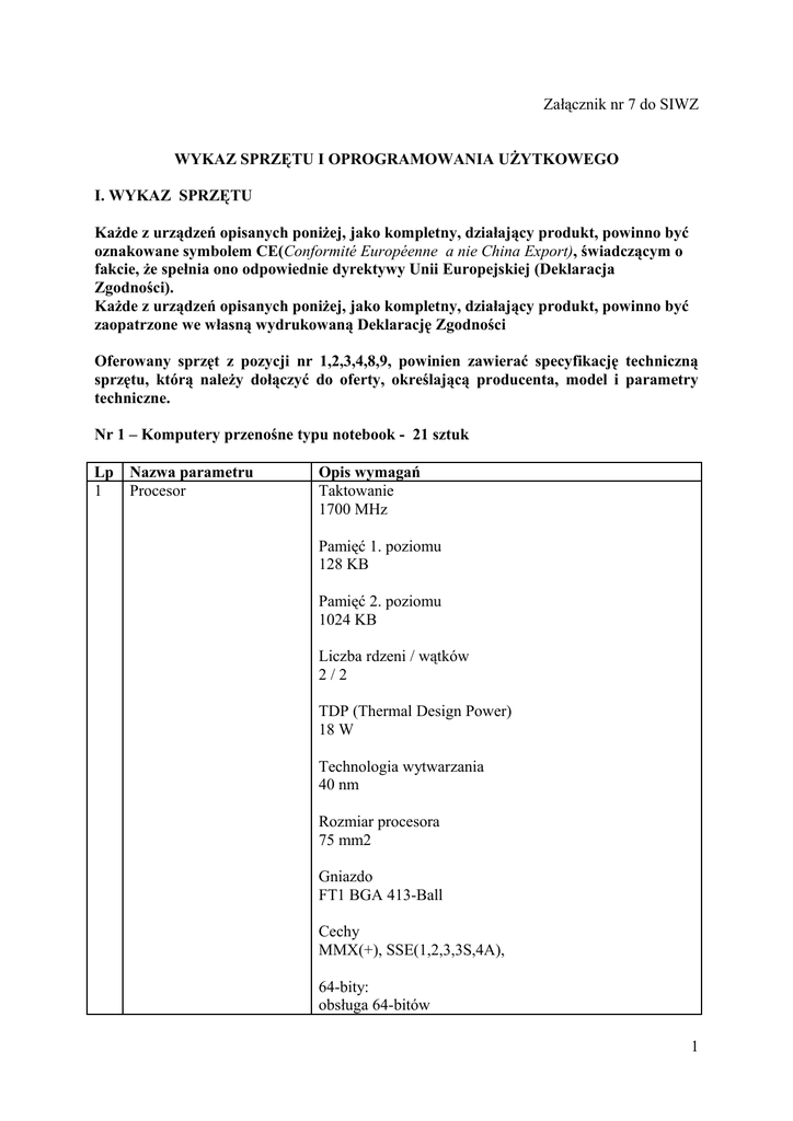 Załącznik nr 7 do SIWZ WYKAZ SPRZĘTU I OPROGRAMOWANIA UŻYTKOWEGO I. WYKAZ SPRZĘTU Każde z urządzeń opisanych poniżej, jako kompletny, działający produkt, powinno być oznakowane symbolem CE(Conformité Européenne a nie China Export), świadczącym o fakcie, że spełnia ono odpowiednie dyrektywy Unii Europejskiej (Deklaracja Zgodności). Każde z urządzeń opisanych poniżej, jako kompletny, działający produkt, powinno być zaopatrzone we własną wydrukowaną Deklarację Zgodności Oferowany sprzęt z pozycji nr 1,2,3,4,8,9, powinien zawierać specyfikację techniczną sprzętu, którą należy dołączyć do oferty, określającą producenta, model i parametry techniczne. Nr 1 – Komputery przenośne typu notebook - 21 sztuk Lp 1 Nazwa parametru Procesor Opis wymagań Taktowanie 1700 MHz Pamięć 1. poziomu 128 KB Pamięć 2. poziomu 1024 KB Liczba rdzeni / wątków 2/2 TDP (Thermal Design Power) 18 W Technologia wytwarzania 40 nm Rozmiar procesora 75 mm2 Gniazdo FT1 BGA 413-Ball Cechy MMX(+), SSE(1,2,3,3S,4A), 64-bity: obsługa 64-bitów 1 1a Chipset, szyna 2 3 Pamięć RAM minimum Ekran 4 5 Grafika Urządzenie wskazujące 6 7 Klawiatura Dźwięk Powyższe wymagania lub równoważne (przez „produkt równoważny” Zamawiający rozumie procesor o parametrach takich samych bądź wyższych od podanych przez Zamawiającego). Częstotliwość szyny pamięci: 1600 MHz Chipset: A68M 4 GB pamięci DDR3 SDRAM 1600 MHz, do 8GB max wyświetlacz HD 39,6 cm (15,6") z podświetleniem LED i powłoką przeciwodblaskową (1366x768) HD 7340M z układem dwurdzeniowym Tabliczka dotykowa z przewijaniem, jeden dwuczęściowy przycisk wyboru z funkcją lewego i prawego przycisku myszy; Obsługa sterowania palcami Standardowa klawiatura o pełnowymiarowych klawiszach • Obsługa High Definition Audio • Wbudowany mikrofon • Wbudowany głośnik stereo Wyjście słuchawek/wyjście sygnałowe audio • • 8 9 10 Dysk twardy minimum Napęd DVD Łączność 11 Akumulator 12 Wyjścia/Wejścia Wejście mikrofonu Dysk SATA 500 GB 5400 obr./min DVD+/-RW SuperMulti DL Karta sieciowa Ethernet (10/100/1000), Karta sieciowa 802.11b/g/n (1x1) oraz Bluetooth Combo, wbudowana kamera internetowa HD 6-komorowy Litowo-Jonowy • 3 porty USB 2.0 • 1 port HDMI • 1 gniazdo RJ-45 1 wyjście słuchawek stereo/wyjście sygnałowe audio • 13 14 Gniazda Preinstalowane oprogramowanie • 1 wejście mikrofonu stereo • 1 port VGA • 1 gniazdo zasilania Kensington Lock, 1 gniazdo kart SD/MMC Windows 8 64-bit PL lub równoważny1) Pakiet biurowy Office 2010 PL w wersji Starter lub równoważny 3) 2 15 16 Zasilacz sieciowy Gwarancja 230V, standard producenta, załączony do produktu min. 12 miesięcy w autoryzowanym serwisie producenta Nr 2 – Komputer przenośne typu notebook - 1 sztuka Lp 1 Nazwa parametru Procesor Opis wymagań Liczba rdzeni 2 Liczba wątków 4 Szybkość zegara 2.5 GHz Maks. częstotliwość turbo 3.1 GHz Cache 3 MB Współczynnik magistrala/rdzeń 25 DMI 5 GT/s Zestaw instrukcji 64-bit Rozszerzony zestaw instrukcji AVX Litografia 32 nm Maks. TDP 35 W Współpraca z pamięcią komputera: Maks. wielkość pamięci (w zależności od rodzaju pamięci) 16 GB Rodzaje pamięci DDR3-1066/1333 Liczba kanałów pamięci 3 2 Maks. przepustowość pamięci 21,3 GB/s Obsługa pamięci z korekcją błędów ECC: Nie Grafika wbudowana w procesor: tak Częstotliwość podstawowa układu graficznego: 650 MHz Maks. częstotliwość dynamiczna układu graficznego: 1.3 GHz Wyjście do grafiki: eDP/DP/HDMI/SDVO/CRT Wersja PCI Express 2.0 Konfiguracje PCI Express 1x16, 2x8, 1x8 2x4 Liczba linii PCI Express 16 Maks. konfiguracja procesora 1 TJUNCTION 100 C Wymiary obudowy 37.5mmx37.5mm (rPGA988B); 31mm x 24mm (BGA1023) Układ graficzny i litografia IMC 32 nm Obsługiwane gniazda FCBGA1023, PPGA988 Częstotliwość Turbo procesora [MHz]: 3100 Powyższe wymagania lub równoważne (przez „produkt równoważny” Zamawiający rozumie procesor o parametrach takich samych bądź wyższych od podanych 4 1a Chipset, szyna 2 3 Pamięć RAM Ekran przez Zamawiającego). Częstotliwość szyny pamięci: 1333 MHz Chipset: HM76 Express 8GB SODIMM DDR3 (1333 MHz) Przekątna ekranu [cal] 17.3 Natywna rozdzielczość 1600 x 900 Technologia LED High Definition Powłoka antyrefleksyjna Przekątna 43.9 cm 4 5 6 Grafika Urządzenie wskazujące Klawiatura HD, pamięć grafiki: minimum 1024 MB Touchpad z dodatkowym dwukierunkowym przewijaniem Układ QWERTY Z wydzieloną częścią numeryczną, pełnowymiarowa, wodoodporna 7 Dźwięk SRS Premium Sound Effect, HD Audio Wbudowane głośniki stereo Wbudowany mikrofon 8 9 10 Dysk twardy Napęd DVD Łączność 11 12 Akumulator Wyjścia/Wejścia 750 GB, 7200 obr./min, SATA II DVD+/- RW-Super Multi DL Bluetooth 4.0+ EDR WiFi 802.11 b/g/n 8-ogniwowy, litowy 13 14 Gniazda Preinstalowane oprogramowanie Zasilacz sieciowy Gwarancja 15 16 Wyjście D-Sub (VGA) Wyjście słuchawkowe Wejście mikrofonowe Wyjście HDMI, 2xUSB 2.0, 2xUSB 3.0, RJ-45 LAN 10/100/1000, kamera internetowa 1.3 Mpix HD Kensington Lock, czytnik kart pamięci SD/MMC Windows 7 Home Premium PL 64-bit lub równoważny 2) MS Office 2010PL starter lub równoważny 3) 230V, standard producenta, załączony do produktu min. 2 lata w serwisie zewnętrznym Nr 3 – Komputer PC – 1 sztuka Lp 1 Nazwa parametru Procesor Opis wymagań Liczba rdzeni 4 Liczba wątków 4 5 Szybkość zegara 3.3 GHz Maks. częstotliwość turbo 3.7 GHz Cache 6 MB Współczynnik magistrala/rdzeń 33 DMI 5 GT/s Zestaw instrukcji 64-bit Rozszerzony zestaw instrukcji SSE4.1/4.2, AVX Litografia 32 nm Maks. TDP 95 W Grafika wbudowana w procesor: tak Częstotliwość podstawowa układu graficznego 850 MHz Maks. częstotliwość dynamiczna układu graficznego 1.1 GHz Maks. konfiguracja procesora 1 TCASE 72.6°C Wymiary obudowy 37.5mm x 37.5mm Obsługiwane gniazda LGA1155 Współpraca z pamięcią komputera: Maks. wielkość pamięci (w zależności od rodzaju 