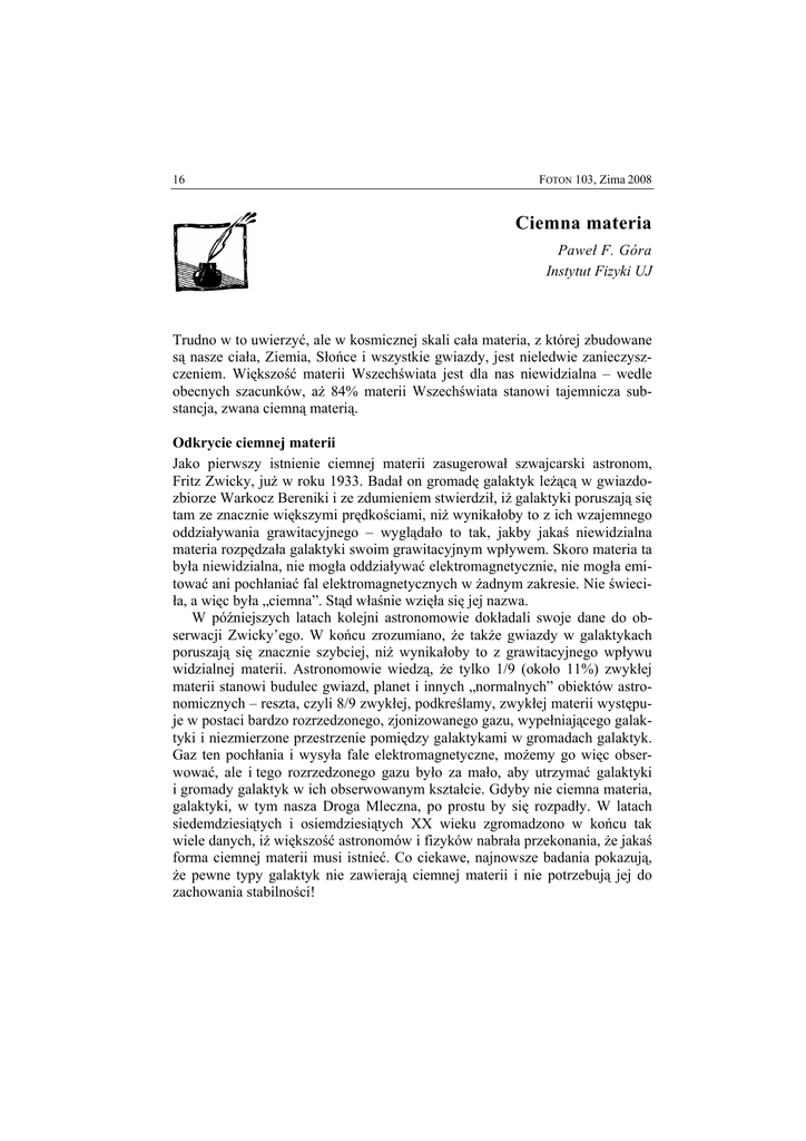 16 FOTON 103, Zima 2008 Ciemna materia Paweł F. Góra Instytut Fizyki UJ Trudno w to uwierzyć, ale w kosmicznej skali cała materia, z której zbudowane są nasze ciała, Ziemia, Słońce i wszystkie gwiazdy, jest nieledwie zanieczyszczeniem. Większość materii Wszechświata jest dla nas niewidzialna – wedle obecnych szacunków, aż 84% materii Wszechświata stanowi tajemnicza substancja, zwana ciemną materią. Odkrycie ciemnej materii Jako pierwszy istnienie ciemnej materii zasugerował szwajcarski astronom, Fritz Zwicky, już w roku 1933. Badał on gromadę galaktyk leżącą w gwiazdozbiorze Warkocz Bereniki i ze zdumieniem stwierdził, iż galaktyki poruszają się tam ze znacznie większymi prędkościami, niż wynikałoby to z ich wzajemnego oddziaływania grawitacyjnego – wyglądało to tak, jakby jakaś niewidzialna materia rozpędzała galaktyki swoim grawitacyjnym wpływem. Skoro materia ta była niewidzialna, nie mogła oddziaływać elektromagnetycznie, nie mogła emitować ani pochłaniać fal elektromagnetycznych w żadnym zakresie. Nie świeciła, a więc była „ciemna”. Stąd właśnie wzięła się jej nazwa. W późniejszych latach kolejni astronomowie dokładali swoje dane do obserwacji Zwicky’ego. W końcu zrozumiano, że także gwiazdy w galaktykach poruszają się znacznie szybciej, niż wynikałoby to z grawitacyjnego wpływu widzialnej materii. Astronomowie wiedzą, że tylko 1/9 (około 11%) zwykłej materii stanowi budulec gwiazd, planet i innych „normalnych” obiektów astronomicznych – reszta, czyli 8/9 zwykłej, podkreślamy, zwykłej materii występuje w postaci bardzo rozrzedzonego, zjonizowanego gazu, wypełniającego galaktyki i niezmierzone przestrzenie pomiędzy galaktykami w gromadach galaktyk. Gaz ten pochłania i wysyła fale elektromagnetyczne, możemy go więc obserwować, ale i tego rozrzedzonego gazu było za mało, aby utrzymać galaktyki i gromady galaktyk w ich obserwowanym kształcie. Gdyby nie ciemna materia, galaktyki, w tym nasza Droga Mleczna, po prostu by się rozpadły. W latach siedemdziesiątych i osiemdziesiątych XX wieku zgromadzono w końcu tak wiele danych, iż większość astronomów i fizyków nabrała przekonania, że jakaś forma ciemnej materii musi istnieć. Co ciekawe, najnowsze badania pokazują, że pewne typy galaktyk nie zawierają ciemnej materii i nie potrzebują jej do zachowania stabilności! FOTON 103, Zima 2008 17 Pierwsze próby wyjaśnienia Czym jest ciemna materia? Początkowo przypuszczano, że ciemna materia to mniej więcej normalne obiekty astronomiczne, których dotąd po prostu nie udało się zaobserwować, gdyż emitują one zbyt mało światła. Mogły to być brązowe karły, gwiazdy neutronowe lub czarne dziury, rezydujące na obrzeżach galaktyk, w tak zwanym halo. Nadano im wobec tego nazwę MACHO (Massive – Compact Halo Object – masywny, zwarty obiekt halo), zgodnie z coraz bardziej popularną zasadą, iż połowa sukcesu w fizyce polega na wymyśleniu chwytliwej nazwy dla badanych zjawisk 1 . Skrupulatne, wieloletnie poszukiwania MACHOs pokazały, że choć w galaktycznych halo występują obiekty tego typu, najwyraźniej jest ich o wiele za mało, aby ich sumaryczny wpływ mógł odpowiadać ciemnej materii. Zaczęto zatem przypuszczać, iż ciemną materię stanowią jakieś cząstki elementarne, być może nieznane ziemskiej nauce. Cząstkom tym nadano nazwę WIMP 2 (Weakly Interacting Massive Particle – słabo oddziałująca masywna cząstka). Kosmologowie uświadomili też sobie, iż ciemna materia musiała wywrzeć wpływ na bardzo wczesne etapy ewolucji Wszechświata. Cenne informacje o anizotropii promieniowania reliktowego, zdobyte przez satelitę COBE (Nagroda Nobla w roku 2006) i jego następcę, satelitę WMAP, narzuciły pewne ograniczenia na modele ciemnej materii. Po licznych dyskusjach i kontrowersjach, większość specjalistów – choć bynajmniej nie wszyscy! – zgodziła się, że ciemną materię stanowią pewne cząstki elementarne, obdarzone masą i poruszające się raczej powoli. Model taki nazywa się modelem zimnej ciemnej materii. W modelu tym ciemna materia w normalnych warunkach oddziałuje ze zwykłą materią, i z sobą samą, tylko grawitacyjnie. Jeśli jednak energia oddziaływania jest dostatecznie duża, ciemna materia może dodatkowo oddziaływać z materią zwykłą – efekty takiego oddziaływania mogą być widoczne za pomocą zwykłych (choć bardzo czułych) metod. Można powiedzieć, że przy dostatecznie wysokich energiach ciemna materia nieco się rozjaśnia. I to właściwie wszystko, co o ciemnej materii można zakładać od strony teoretycznej. Soczewkowanie grawitacyjne Jedną z konsekwencji Ogólnej Teorii Względności jest zakrzywienie toru promieni świetlnych przelatujących koło masywnego obiektu. Masywne, rozległe przestrzennie obiekty astronomiczne, takie jak gromady galaktyk, mogą działać jak soczewki – mogą zniekształcać, a nawet rozszczepiać obraz jakiegoś odległego obiektu, którego światło przez nie przechodzi. Choć możliwość tę prze1 Macho oznacza silnego mężczyznę, skłonnego do dominacji nad innymi, ale na ogół niezbyt rozgarniętego. 2 Wimp (ang.) – słabeusz, tchórz, ciamajda. 18 FOTON 103, Zima 2008 widziano już w latach trzydziestych XX wieku, przy udziale Alberta Einsteina i znanego już nam Fritza Zwicky’ego, soczewkowanie grawitacyjne po raz pierwszy zaobserwowano dopiero w roku 1979. Od tego czasu stało się ono jednym z najważniejszych narzędzi badawczych astronomii pozagalaktycznej. Narzędzia tego możemy użyć także niejako w drugą stronę: jeśli wiemy, jak powinno wyglądać to, czego zniekształcony na skutek soczewkowania grawitacyjnego obraz oglądamy, możemy na tej podstawie obliczyć rozkład masy obiektu, który zadziałał jako soczewka. Tego właśnie sposobu użyto do potwierdzenia istnienia ciemnej materii. W sierpniu 2006 ogłoszono wyniki 