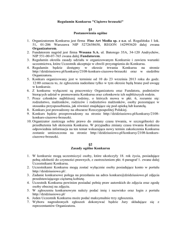 Regulamin Konkursu "Ciążowe brzuszki" §1 Postanowienia ogólne 1. Organizatorem Konkursu jest firma Fine Art Media sp. z o.o. ul. Rogalińska 1 lok. 51, 01-206 Warszawa NIP 5272658650, REGON 142993620 dalej zwana Organizatorem. 2. Fundatorem nagród jest firma Wosana S.A. ul. Batorego 35A, 34-120 Andrychów, NIP 551-00-07-765 zwana dalej Fundatorem. 3. Regulamin określa zasady udziału w organizowanym Konkursie i zawiera warunki uczestnictwa, które Uczestnik akceptuje w chwili przystąpienia do Konkursu. 4. Regulamin będzie dostępny w okresie trwania Konkursu na stronie http://dzidziusiowo.pl/konkursy/2108-konkurs-ciazowe-brzuszki oraz w siedzibie Organizatora. 5. Konkurs organizowany jest w terminie od 10 do 23 września 2013 roku do godz. 12:00 oznacza to, że zgłoszenia nadesłane tylko w tym okresie będą brane pod uwagę w konkursie. 6. Z konkursu wyłączeni są pracownicy Organizatora oraz Fundatora, podmiotów biorących udział w promowaniu Konkursu oraz członkowie ich najbliższych rodzin. 7. Przez członków najbliższej rodziny, o których mowa w pkt. 6, rozumie się: rodzeństwo, małżonków, rodziców i rodzeństwo małżonków, osoby pozostające w stosunku przysposobienia, jak również znajdujące się pod opieką lub kuratelą. 8. Konkurs jest prowadzony na obszarze Rzeczypospolitej Polskiej. 9. Konkurs będzie przeprowadzony na stronie http://dzidziusiowo.pl/konkursy/2108konkurs-ciazowe-brzuszki. 10. Organizator zastrzega sobie prawo do zmiany czasu trwania, w szczególności do przedłużenia lub skrócenia Konkursu. W przypadku zmiany czasu trwania Konkursu odpowiednia informacja na ten temat wskazująca nowy termin zakończenia Konkursu zostanie umieszczona na stronie http://dzidziusiowo.pl/konkursy/2108-konkursciazowe-brzuszki. §2 Zasady ogólne Konkursu 1. W konkursie mogą uczestniczyć osoby, które ukończyły 18. rok życia, posiadające pełną zdolność do czynności prawnych, z zastrzeżeniem pkt. 6 paragraf 1. zwane dalej Uczestnikami Konkursu. 2. Uczestnikami Konkursu mogą zostać wyłącznie osoby posiadające konto w portalu http://dzidziusiowo.pl/. 3. Zadanie konkursowe polega na przesłaniu na adres [email protected] zdjęcia przedstawiającego ciężarną kobietę. 4. Uczestnik Konkursu powinien posiadać pełnię praw autorskich do zdjęcia oraz zgodę osoby obecnej na zdjęciu. 5. W zgłoszeniu konkursowym należy podać imię i nazwisko oraz login z portalu http://dzidziusiowo.pl/ 6. Jeden Uczestnik Konkursu może podać maksymalnie trzy zgłoszenia. 7. Wyboru nagrodzonych zgłoszeń dokonywać będzie Jury składające się z reprezentantów Organizatora. 8. Przesłane pliki nie będą zwracane. Z chwilą nadesłania fotografie przechodzą na własność organizatorów konkursu, którzy przejmują prawa autorskie i majątkowe do nadesłanych prac oraz zastrzegają sobie prawo do publikacji prac (oraz ich ewentualnych zmian) w serwisie http://www.dzidziusiowo.pl oraz na stronie http://www.facebook.com/dzidziusiowo. 9. Zabrania się przesyłania i publikacji treści: o innej tematyce niż tematyka Konkursu, o treści naruszającej prawo, bądź godzącej w dobre obyczaje, powszechnie obowiązujące normy obyczajowe i społeczne. 10. Organizator oraz podmioty biorące udział w obsłudze Konkursu nie odpowiadają za treści przesłanych lub umieszczonych na stronach internetowych przez Uczestników. W przypadku gdyby Uczestnik naruszył prawa osób trzecich, ponosi on wyłączną odpowiedzialność za to naruszenie. Organizator zastrzega sobie prawo usunięcia zdjęć w sytuacji, gdy umieszczono je niezgodnie z regulaminem oraz gdyby uzasadnione stało się przypuszczenie, iż naruszają one prawa osób trzecich, jak również w przypadku gdyby ich treść była nieprzyzwoita lub mogła naruszać dobre obyczaje. 11. Uczestnicy Konkursu są identyfikowani według adresów e-mail, loginu oraz imienia i nazwiska podanych podczas zgłoszenia do Konkursu. 12. Warunkiem prawidłowego zgłoszenia do konkursu jest podanie poprawnego adresu email. 13. Nie będą uwzględniane zgłoszenia, które nie spełniają wymogów opisanych w niniejszym Regulaminie. §3 Nagrody w konkursie 1. W Konkursie nagradzanych zostanie sześciu Uczestników Konkursu. Jeden uczestnik Konkursu, może otrzymać tylko jedną nagrodę. 2. Nagrodą w Konkursie jest zestaw składający się z: - kubka „Mama i ja”, - ręcznika z kapturem, - gąbki do masażu, - książeczki z imionami, - parasola, - pacynki dla dziecka. 3. Jury rozpocznie obrady po zakończeniu Konkursu, a zakończy nie później niż 26 września 2013 roku. 4. Jury składa się z dwóch osób reprezentujących Organizatora. 5. Wyniki konkursu zostaną opublikowane na stronie http://dzidziusiowo.pl/konkursy/2108-konkurs-ciazowe-brzuszki. 6. Zwycięzcy zostaną powiadomieni o wygranej w terminie do tygodnia od daty zakończenia obrad Jury. 7. Warunkiem otrzymania nagrody jest podanie poprawnych danych adresowych potrzebnych do wysłania nagrody oraz danych osobowych do przygotowania protokołu odbioru nagrody (imię, nazwisko, adres zameldowania, numer PESEL). 8. Organizator Konkursu podejmie maksymalnie trzy próby skontaktowania się z nagrodzonym Uczestnikiem, w ciągu 5 dni roboczych od przyznania nagród. Kontakt nawiązywany będzie drogą e-mail na adres e-mail podany podczas zgłoszenia do konkursu. Po terminie 5 dni roboczych, Organizator Konkursu nie będzie podejmować dalszych prób nawiązania kontaktu z Uczestnikiem, a Uczestnikowi nie przysługuje w takim przypadku roszczenie o wydanie nagrody. 9. W razie braku możliwość skontaktowania się z nagrodzonym Uczestnikiem, Organizator zastrzega sobie możliwość przyznania nagrody innemu wybranemu Uczestnikowi. 10. Organizator zastrzega sobie prawo do nieprzyznania nagrody, jeśli żadne z nadesłanych zgłoszeń nie będzie spełniało zasad opisanych w paragrafie 2. W takim przypadku nagroda przechodzi na własność Fundatora. §4 Dystr