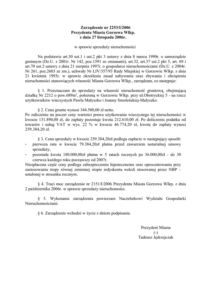 Zarządzenie nr 2253/I/2006 Prezydenta Miasta Gorzowa Wlkp. z dnia 27 listopada 2006r. w sprawie sprzedaży nieruchomości Na podstawie art.30 ust.1 i ust.2 pkt 3 ustawy z dnia 8 marca 1990r. o samorządzie gminnym (Dz.U. z 2001r. Nr 142, poz.1591 ze zmianami), art.32, art.37 ust.2 pkt 5, art. 69 i art.70 ust.2 ustawy z dnia 21 sierpnia 1997r. o gospodarce nieruchomościami (Dz.U. z 2004r. Nr 261, poz.2603 ze zm.), uchwały Nr LIV/357/93 Rady Miejskiej w Gorzowie Wlkp. z dnia 21 kwietnia 1993r. w sprawie określenia zasad nabywania oraz zbywania i obciążenia nieruchomości stanowiących własność Miasta Gorzowa Wlkp., zarządzam, co następuje: § 1. Przeznaczam do sprzedaży na własność nieruchomość gruntową, obejmującą działkę Nr 2212 o pow.689m2, położoną w Gorzowie Wlkp. przy ul.Obotryckiej 5 - na rzecz użytkowników wieczystych Pawła Małyszko i Joanny Smoleńskiej-Małyszko. § 2. Cena gruntu wynosi 344.500,00 zł netto. Po zaliczeniu na poczet ceny wartości prawa użytkowania wieczystego tej nieruchomości w kwocie 131.890,00 zł, do zapłaty pozostaje kwota 212.610,00 zł. Po doliczeniu podatku od towarów i usług VAT w wys. 22 % w kwocie 46.774,20 zł, kwota do zapłaty wynosi 259.384,20 zł. § 3. Cena sprzedaży w kwocie 259.384,20zł podlega zapłacie w następujący sposób: pierwsza rata w kwocie 79.384,20zł płatna przed zawarciem notarialnej umowy sprzedaży, - pozostała kwota 180.000,00zł płatna w 5 ratach rocznych po 36.000,00zł - do 30 czerwca każdego roku począwszy od 2007r. Niespłacona część ceny podlega zabezpieczeniu hipotecznemu oraz oprocentowaniu przy zastosowaniu stopy równej zmiennej stopie redyskonta weksli stosowanej przez NBP – ustalonej w stosunku rocznym. - § 4. Traci moc zarządzenie nr 2151/I/2006 Prezydenta Miasta Gorzowa Wlkp. z dnia 2 października 2006r. w sprawie sprzedaży nieruchomości. § 5. Wykonanie zarządzenia powierzam Naczelnikowi Wydziału Gospodarki Nieruchomościami. § 6. Zarządzenie wchodzi w życie z dniem podpisania. Prezydent Miasta (-) Tadeusz Jędrzejczak