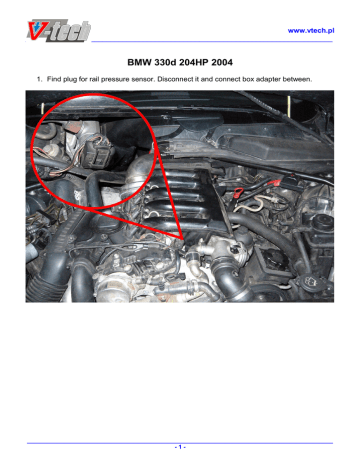 www.vtech.pl ____________________________________________________________________________ BMW 330d 204HP 2004 1. Find plug for rail pressure sensor. Disconnect it and connect box adapter between. ___________________________________________________________________________________________ -1-