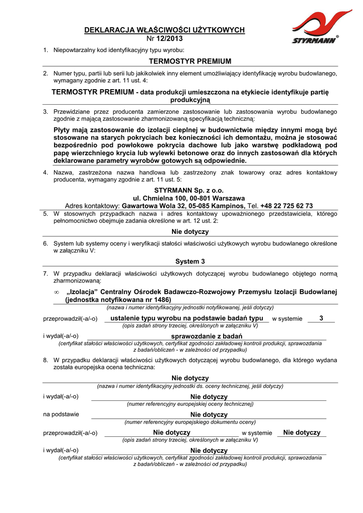 DEKLARACJA WŁAŚCIWOŚCI UŻYTKOWYCH Nr 12/2013 1. Niepowtarzalny kod identyfikacyjny typu wyrobu: TERMOSTYR PREMIUM 2. Numer typu, partii lub serii lub jakikolwiek inny element umożliwiający identyfikację wyrobu budowlanego, wymagany zgodnie z art. 11 ust. 4: TERMOSTYR PREMIUM - data produkcji umieszczona na etykiecie identyfikuje partię produkcyjną 3. Przewidziane przez producenta zamierzone zastosowanie lub zastosowania wyrobu budowlanego zgodnie z mającą zastosowanie zharmonizowaną specyfikacją techniczną: Płyty mają zastosowanie do izolacji cieplnej w budownictwie między innymi mogą być stosowane na starych pokryciach bez konieczności ich demontażu, można je stosować bezpośrednio pod powłokowe pokrycia dachowe lub jako warstwę podkładową pod papę wierzchniego krycia lub wylewki betonowe oraz do innych zastosowań dla których deklarowane parametry wyrobów gotowych są odpowiednie. 4. Nazwa, zastrzeżona nazwa handlowa lub zastrzeżony znak towarowy oraz adres kontaktowy producenta, wymagany zgodnie z art. 11 ust. 5: STYRMANN Sp. z o.o. ul. Chmielna 100, 00-801 Warszawa Adres kontaktowy: Gawartowa Wola 32, 05-085 Kampinos, Tel. +48 22 725 62 73 5. W stosownych przypadkach nazwa i adres kontaktowy upoważnionego przedstawiciela, którego pełnomocnictwo obejmuje zadania określone w art. 12 ust. 2: Nie dotyczy 6. System lub systemy oceny i weryfikacji stałości właściwości użytkowych wyrobu budowlanego określone w załączniku V: System 3 7. W przypadku deklaracji właściwości użytkowych dotyczącej wyrobu budowlanego objętego normą zharmonizowaną: • „Izolacja” Centralny Ośrodek Badawczo-Rozwojowy Przemysłu Izolacji Budowlanej (jednostka notyfikowana nr 1486) (nazwa i numer identyfikacyjny jednostki notyfikowanej, jeśli dotyczy) przeprowadził(-a/-o) ustalenie typu wyrobu na podstawie badań typu w systemie 3 (opis zadań strony trzeciej, określonych w załączniku V) i wydał(-a/-o) sprawozdanie z badań (certyfikat stałości właściwości użytkowych, certyfikat zgodności zakładowej kontroli produkcji, sprawozdania z badań/obliczeń - w zależności od przypadku) 8. W przypadku deklaracji właściwości użytkowych dotyczącej wyrobu budowlanego, dla którego wydana została europejska ocena techniczna: Nie dotyczy (nazwa i numer identyfikacyjny jednostki ds. oceny technicznej, jeśli dotyczy) i wydał(-a/-o) Nie dotyczy (numer referencyjny europejskiej oceny technicznej) na podstawie Nie dotyczy (numer referencyjny europejskiego dokumentu oceny) przeprowadził(-a/-o) Nie dotyczy w systemie Nie dotyczy (opis zadań strony trzeciej, określonych w załączniku V) i wydał(-a/-o) Nie dotyczy (certyfikat stałości właściwości użytkowych, certyfikat zgodności zakładowej kontroli produkcji, sprawozdania z badań/obliczeń - w zależności od przypadku) 9. Deklarowane właściwości użytkowe Uwagi do tabeli: 1. Kolumna 1 zawiera wykaz zasadniczych charakterystyk określonych w zharmonizowanych specyfikacjach technicznych dla zamierzonego zastosowania lub zamierzonych zastosowań wskazanych w pkt 3 powyżej. 2. Dla każdej zasadniczej charakterystyki wymienionej w kolumnie 1 i zgodnie z wymaganiami art. 6 kolumna 2 zawiera deklarowane właściwości użytkowe wyrażone jako poziom lub klasa, lub w sposób opisowy, powiązane z odpowiednimi zasadniczymi charakterystykami. Zawiera litery „NPD” (właściwości użytkowe nieustalone; ang. No Performance Determined), o ile właściwości użytkowe nie zostały zadeklarowane. 3. Dla każdej zasadniczej charakterystyki wymienionej w kolumnie 1 kolumna 3 zawiera: a) datowane odniesienie do odpowiedniej normy zharmonizowanej oraz w stosownych wypadkach numer referencyjny zastosowanej specjalnej lub odpowiedniej dokumentacji technicznej; lub b) datowane odniesienie do odpowiedniego europejskiego dokumentu oceny, w przypadku gdy jest on dostępny, oraz numer referencyjny zastosowanej europejskiej oceny technicznej. Zasadnicze charakterystyki (zob. uwaga 1) Długość Szerokość Grubość Prostokątność Płaskość Reakcja na ogień Ciągłe spalanie w postaci żarzenia Długotrwała nasiąkliwość wodą Absorpcja wody przy długotrwałej dyfuzji Uwalnianie się substancji niebezpiecznych do środowiska wewnętrznego Wskaźnik izolacyjności od dźwięków powietrznych przenoszonych drogą bezpośrednią Wskaźnik pochłaniania dźwięku Wskaźnik izolacyjności od dźwięków uderzeniowych (dla podłóg) Opór cieplny Współczynnik przewodzenia ciepła Przepuszczalność pary wodnej Naprężenie ściskające przy 10 % odkształceniu Wytrzymałość na zginanie Wytrzymałość na rozciąganie prostopadle do powierzchni czołowych Trwałość reakcji na ogień w funkcji ciepła, warunków atmosferycznych, starzenia/degradacji Trwałość oporu cieplnego w funkcji ciepła, warunków atmosferycznych, starzenia/degradacji Stabilność wymiarowa w określonych warunkach temperaturowych Stabilność wymiarowa w określonych warunkach temperaturowych i wilgotnościowych Trwałość właściwości Odkształcenie w określonych warunkach obciążenia ściskającego i temperatury Trwałość wytrzymałości na ściskanie w funkcji starzenia i degradacji Właściwości użytkowe (zob. uwaga 2) L(3) W(3) T(2) S(5) P(10) E NPD NPD NPD NPD NPD NPD NPD RD - tabela niżej Nie więcej niż 0,036 W/m⋅K NPD CS(10)200 BS250 NPD Brak zmian Brak zmian DS(N)5 DS(70,-)2 Brak zmian DLT(1)5 NPD Zharmonizowana specyfikacja techniczna (zob. uwaga 3) EN 13163:2012 Właściwości użytkowe (zob. uwaga 2) NPD NPD Zasadnicze charakterystyki (zob. uwaga 1) Odporność na zamrażanie-odmrażanie Długotrwała redukcja grubości Zharmonizowana specyfikacja techniczna (zob. uwaga 3) Deklarowany opór cieplny RD [m ⋅K/W]: 2 PŁYTY GŁADKIE Grubość [mm] 10 Deklar. opór cieplny RD [m2K/W] 20 30 40 50 60 70 80 100 120 140 150 160 180 200 0,278 0,556 0,833 1,111 1,389 1,667 1,944 2,222 2,778 3,333 3,889 4,167 4,444