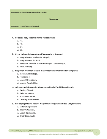 Egzamin dla kandydatów na przewodników miejskich Warszawa 19.07.2010 r. — część pisemna (wersja B) 1. Ile stacji liczy obecnie metro warszawskie: a. 17, b. 18, c. 21, d. 22. 2. Czym był w międzywojennej Warszawie — Annopol: a. targowiskiem produktów rolnych, b. targowiskiem dla koni, c. osiedlem slumsów dla bezrobotnych i bezdomnych, d. wsią rolniczą. 3. Nagrobek ostatnich książąt mazowieckich został ufundowany przez: a. Konrada III Rudego, b. Trojdena I, c. Annę Odrowążową, d. Annę z Radziwiłłów. 4. Jak nazywał się premier pierwszego Rządu Polski Niepodległej: a. Walery Sławek, b. Wincenty Witos, c. Kazimierz Bartel, d. Jędrzej Moraczewski. 5. Kto zaprojektował kościół Wszystkich Świętych na Placu Grzybowskim: a. Alfons Kropiwnicki, b. Henryk Marconi, c. Józef Dziekoński, d. Piotr Białostocki. Oddział Międzyuczelniany PTTK w Warszawie http://szkolenia.om.pttk.pl Opracowano na podstawie materiałów udostępnionych przez urzędy wojewódzkie 1 19.07.2010 Egzamin dla kandydatów na przewodników miejskich — Warszawa 6. Przy jakiej staromiejskiej ulicy mieszkał Jan Kiliński: a. Świętojańskiej, b. św. Marcina, c. na Szerokim Dunaju, d. na Wąskim Dunaju. 7. Gdzie przechowywane jest Archiwum Getta Warszawskiego: a. w Żydowskim Instytucie Historycznym w Warszawie, b. w Instytucie Yad Vashem w Jerozolimie, c. w Muzeum Holocaustu w Waszyngtonie, d. w Instytucie Pamięci Narodowej w Warszawie 8. Na którym cmentarzu pochowany został piewca Warszawy — Mieczysław Fog: a. Cmentarz Bródnowski, b. Cmentarz Ewangelicko-Augsburski, c. Cmentarz Karaimski, d. Powązki Wojskowe. 9. Który warszawski pomnik został zniszczony przez hitlerowców w 1940 r. jako pierwszy: a. Kolumna Zygmunta, b. Kopernika, c. Chopina, d. księcia Józefa Poniatowskiego. 10. Emil Wedel pochowany jest na cmentarzu: a. nie jest pochowany w Warszawie, b. Starych Powązkach, c. Ewangelicko–Augsburskim, d. Ewangelicko– Reformowanym. 11. Roman Dmowski pochowany jest na cmentarzu: a. Ewangelicko-Augsburskim, b. Ewangelicko -Reformowanym, c. Starych Powązkach, d. Bródnowskim. 2 http://szkolenia.om.pttk.pl Oddział Międzyuczelniany PTTK w Warszawie Opracowano na podstawie materiałów udostępnionych przez urzędy wojewódzkie Egzamin dla kandydatów na przewodników miejskich — Warszawa 19.07.2010 12. Na którym cmentarzu znajduje się zbiorowa bezimienna mogiła żołnierzy poległych w Zamachu Majowym w 1926 r.: a. na Starych Powązkach, b. na Cmentarzu Prawosławnym, c. na Powązkach Wojskowych, d. na Cmentarzu Bródnowskim. 13. Prezydent na Uchodźstwie Ryszard Kaczorowski pochowany jest: a. na Cmentarzu w Białymstoku, b. na Cmentarzu Wojskowym na Powązkach, c. w Archikatedrze Warszawskiej, d. w Świątyni Opatrzności. 14. Festiwal Mozartowski w Warszawie jest organizowany przez: a. Kościół Ewangelicko–Augsburski, b. Teatr Wielki, c. Warszawską Operę Kameralną, d. Filharmonię Narodową. 15. Jaki architekt zaprojektował kaplicę w Pałacu Belwederskim: a. Jakub Kubicki, b. Jerzy Kalina, c. Bohdan Pniewski, d. Jerzy Białostocki. 16. Armia Krajowa została utworzona w roku: a. 1940, b. 1941, c. 1942, d. 1943. 17. Według czyjego projektu wzniesiono budynek Liceum im. Stefana Batorego w Warszawie: a. B. Pniewskiego, b. S. Jankowskiego, c. T. Tołwińskiego, d. T. Białostockiego. Oddział Międzyuczelniany PTTK w Warszawie http://szkolenia.om.pttk.pl.pl Opracowano na podstawie materiałów udostępnionych przez urzędy wojewódzkie 3 19.07.2010 Egzamin dla kandydatów na przewodników miejskich — Warszawa 18. Prezydent Stefan Starzyński: a. powołał Akademię Rolniczą, b. został zamordowany w obozie koncentracyjnym w Dachau, c. zaprojektował tereny wystawowe na terenie dzisiejszego Stadionu X-lecia, d. podpisał umowę z General Motors w 1938 r. 19. Serce króla Michała Korybuta Wiśniowieckiego znajduje się: a. w krypcie katedralnej św. Jana, b. w kościele św. Krzyża, c. w kościele na Bielanach, d. w kościele Kapucynów. 20. Kto posługiwał się „laską marszałkowską” w sejmie doby szlacheckiej: a. marszałek Senatu, b. król, c. marszałek Sejmu, d. kanclerz. 21. W jakiej sali Pałacu Prezydenckiego nadawane są ordery i odznaczenia, nominacje generalskie itp. a. w Sali Niebieskiej, b. w Sali Kolumnowej, c. w Sali Białej, d. w Sali Konferencyjnej. 22. W Pałacu Belwederskim Sala Pompejańska to dawna sala: a. niebieska, b. żółta, c. zielona, d. malinowa. 23. Od którego roku ratusz miejski w Warszawie znajdował się w Pałacu Jabłonowskich: a. 1817, b. 1818, c. 1830, d. 1835. 24. Pałacyk Cukrowników — „Instytut A. Mickiewicza” znajduje się przy: a. ul. Białostockiej, b. ul. Brackiej, c. ul. Wilczej, d. ul. Mokotowskiej. 4 http://szkolenia.om.pttk.pl Oddział Międzyuczelniany PTTK w Warszawie Opracowano na podstawie materiałów udostępnionych przez urzędy wojewódzkie Egzamin dla kandydatów na przewodników miejskich — Warszawa 19.07.2010 25. Kto był pierwszym przywódcą powstania listopadowego: a. Piotr Wysocki, b. Michał Radziwiłł, c. Józef Chłopicki, d. Józef Gostyński. 26. Warszawska rezydencja G. G. Hansa Franka mieściła się w czasie okupacji: a. w Pałacu Radziwiłłowskim, b. na Zamku Królewskim, c. w Pałacu Belwederskim, d. w Pałacu Krasińskich. 27. Do jakiego zgromadzenia zakonnego należał kiedyś Kościół Garnizonowy: a. oo. Paulinów, b. oo. Jezuitów, c. oo. Pijarów, d. oo. Franciszkanów. 28. Jak brzmi napis na pomniku Bohaterów Getta: a. Żydzi swym bohaterom i męczennikom, b. Naród żydowski swym bojownikom i męczennikom, c. W hołdzie męczennikom i bohaterom, d. W hołdzie męczennikom i bohaterom Narodu Żydowskiego. 29. Piękna Joanna Grudzińska była żoną: a. księcia Łowickiego, b. księcia Konstantego, c. księcia Radziwiłła, d. hrabiego Grudzińskiego. 30. Kto zaprojektował gmach Sejmu w 1928 r. a. Kazimierz Skórewicz, b. Bohdan Pniewski, c. Jakub Kubicki