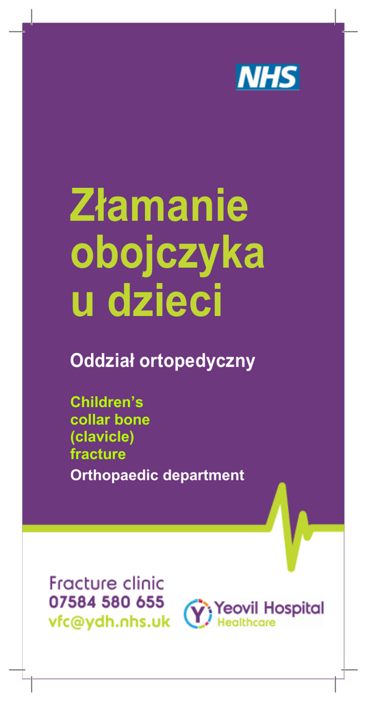 Złamanie obojczyka u dzieci Oddział ortopedyczny Children’s collar bone (clavicle) fracture Orthopaedic department Twoje dziecko złamało obojczyk. Ten typ złamania jest powszechny wśród dzieci. Złamania te goją się dobrze przy odpowiednim odpoczynku i upływie czasu Dla większej wygody, a także by zmniejszyć ryzyko wystąpienia kolejnych obrażeń, zapewniliśmy Twojemu dziecku temblak. Należy go nosić przez okres dwóch do trzech tygodni. Można go ściągać do kąpieli bez obawy o pogorszenie złamania. Przez kilka pierwszych dni po wypadku dziecku może być wygodniej spać w pozycji siedzącej, podparte większą ilością poduszek. Temblak pomoże ograniczyć ból, choć konieczne może być podanie dziecku środków przeciwbólowych. Można regularnie podawać mu paracetamol i ibuprofen, dopóki nie poczuje się lepiej, a potem tylko w razie potrzeby. Proszę uważnie przeczytać i przestrzegać zaleceń producenta odnośnie dawkowania leków. Zazwyczaj około dwóch tygodni od urazu można wysunąć bark i ramię z temblaka, choć można też spróbować wcześniej, jeśli nie sprawia to dziecku bólu. Należy zachęcać dziecko do poruszania ręką w stawie łokciowym, dłonią i palcami w trakcie korzystania z temblaka. Czasami dzieci nie chcą nosić temblaka już po kilku dniach od urazu, kiedy złamanie przestaje im bardzo dokuczać. Nie spowoduje to dalszego uszkodzenia obojczyka, dlatego należy kierować się poziomem bólu u dziecka. Dziecko może wrócić do uprawiania sportów takich jak pływanie, jak tylko ustąpi ból. Należy jednak unikać sportów urazowych, takich jak piłka nożna czy rugby, przez okres 6 do 8 tygodni. Złamanie występuje na ogół w środkowym odcinku kości. Dla wygody można nosić temblak na ramię przez okres 2 do 3 tygodni. Jeśli po 3 miesiącach objawy u dziecka nie ustąpią i nie będzie ono odczuwać żadnej poprawy, skontaktuj się z kliniką ortopedyczną (fracture clinic): Telefon: 07584 580 655 E-mail: [email protected] Jeśli chciałbyś otrzymać tę ulotkę w innym formacie, np. napisaną dużą czcionką, lub w innym języku, zapytaj nasz personel.