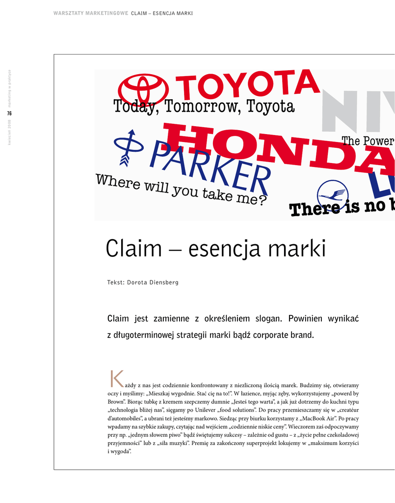 marketing w praktyce warsztaty marketingowe CLAIM – ESENCJA MARKI Today, Tomorrow, Toyota kwiecień 2008 76 The Power Where w ill you ta ke me? There is no b Claim – esencja marki Tekst: Dorota Diensberg Claim jest zamienne z określeniem slogan. Powinien wynikać z długoterminowej strategii marki bądź corporate brand. K ażdy z nas jest codziennie konfrontowany z niezliczoną ilością marek. Budzimy się, otwieramy oczy i myślimy: „Mieszkaj wygodnie. Stać cię na to!”. W łazience, myjąc zęby, wykorzystujemy „powerd by Brown”. Biorąc tubkę z kremem szepczemy dumnie „Jesteś tego warta”, a jak już dotrzemy do kuchni typu „technologia bliżej nas”, sięgamy po Unilever „food solutions”. Do pracy przemieszczamy się w „creatéur d’automobiles”, a ubrani też jesteśmy markowo. Siedząc przy biurku korzystamy z „MacBook Air”. Po pracy wpadamy na szybkie zakupy, czytając nad wejściem „codziennie niskie ceny”. Wieczorem zaś odpoczywamy przy np. „jednym słowem piwo” bądź świętujemy sukcesy – zależnie od gustu – z „życie pełne czekoladowej przyjemności” lub z „siła muzyki”. Premię za zakończony superprojekt lokujemy w „maksimum korzyści i wygoda”. of Dreams y l f o t y a w r e t t e b Rodzaje claimów kampanii reklamowej – dedykowany krótkookreso- wo jednej kampanii, np. Blend a Med – „Zęby zdrowe na siódemkę” marki dachowej – wykorzystywany do długoterminowego pozycjonowania marki, np. „RMF FM – najlepsza muzyka” lub produktowy – zadedykowany jednemu produktowi lub grupie produktów, jak np. „Delicje impresja – magia lekkości” Nie do końca podoba się państwu ten scenariusz? Proszę tylko powstawiać własne hasła i już go polubicie! Inne hasła pojawiają się w opowieściach naszych pociech, ale niech to będzie zadanie domowe dla chętnych... W dosłownym tłumaczeniu claim to roszczenie, deklaracja, podkreślenie, wyodrębnienie. Claim jest nieodłącznym elementem marki. Nadaje marce sens, podaje „reason why” marki. W przeciwieństwie do nazwy marki, claim może zostać zmieniony – nazwa marki nie. Przy zbyt częstych zmianach claimu należy uważać, by nie rozmyć, W sytuacji, gdy claimy marki/ firmy i kampanii reklamowej występują razem w określonych mediach, powinny się uzupełniać. Na przykład, gdy jeden z nich apeluje do emocji, jest wskazane, by drugi miał raczej charakter racjonalny. Jeśli oba claimy będą miały ten sam charakter, istnieje zagrożenie rozmycia przekazu i zdecydowanego pozycjonowania pojedynczych claimów. Pozytywnym przykładem niech będzie tu AXA; claim marki to „bezpieczeństwo finansowe” – ma zabarwienie zdecydowanie racjonalne. Natomiast claim kampanii „Twoje marzenia nabiorą realnych kształtów” jest zręcznym uzupełnieniem claimu marki. Inna kombinacja to Kampania Calvin Klein, z claimem marki „Zapachy dla mężczyzn i kobiet”. Jest to claim grupy produktów. Ma charakter czysto informacyjny, odpowiada na pytanie „co to jest?”. A claim kampanii „Żyj marzeniami” doskonale doładowuje go emocjonalnie. Niezbyt zręcznym rozwiązaniem posłużyła się 8 77 kwiecień 2008 hair care nie rozcząstkować USP marki. Częste zmiany treści claimu mogą doprowadzić nawet do zniszczenia marki. Dobrze zredagowany claim działa na korzyść marki, jest hasłem ponadczasowym, ma pozytywny wydźwięk, jest łatwy do wypowiedzenia, ma przyjemną melodię. Łatwe do zapamiętania są claimy rymowane. Dobry claim jest stosunkowo krotki – ma trzy do pięciu słów. Bardzo ważne jest postrzeganie claimu jako jednego z istotnych elementów marki. Treści claimu powinny wyrażać bądź wytyczać jej strategię. W praktyce jest to krótki tekst reklamowy w odniesieniu do firmy lub konkretnego produktu. Claim obejmuje treści konkretne, emocjonalne bądź abstrakcyjne. Aktywizuje konkretne skojarzenia. A jakie one będą, zależy od tego, czy przesłanie zostało zarejestrowane bezpośrednio, jak szybko reaguje odbiorca, jakie znaczenie ma przesłanie i na ile wiarygodny jest adresat. Marka/ produkt niekoniecznie potrzebuje claimu, by odnieść sukces, np. Hexeline. Diverse itp. Rezygnacja z claimu cechuje głównie marki odzieżowe, perfumy. marketing w praktyce CLAIM – ESENCJA MARKI warsztaty marketingowe warsztaty marketingowe CLAIM – ESENCJA MARKI marketing w praktyce Z prawnego punktu widzenia claim, podobnie jak marka, może zostać zastrzeżony, o ile spełnia określone wymogi graficzne i formalne. Za pomocą claimu mamy możliwość pozycjonowania marki w środowisku konkurencji. Wykorzystując claim, prowadzimy dialog z konkurencją, jak np. Lukas „Tak powinno być w każdym banku” bądź wypowiadamy jej otwartą wojnę, np. Orange „Przyszłość jest jasna. Przyszłość to Orange”. kwiecień 2008 78 Z ▶ 8 Honda. Mając emocjonalny claim marki „The power of dreams”, stosuje jeszcze emocjonalny dopalacz w claimie kampanii – „wzór na doskonałość”. Najważniejszą funkcją claimu jest odpowiednie pozycjonowanie marki dzięki jego treści. W związku z tym claim może spełniać przykładowo funkcje: ▶objaśniającą, np. Nivea „hair care” ▶informującą, np. Monnari „W drodze na giełdę” ▶zachęcającą, np. Monte „Tak smakuje dziecka czas” ▶neutralną, np. Commercial Union „Z nami ubezpieczenia są proste” ▶deklaracyjną, np. Carrefour „Ułatwiamy życie” ▶prowokującą, np. Lukas „Tak powinno być w każdym banku” ▶zaskakującą, np. Toyota „Today, Tomorrow, Toyota.” ▶pytającą, np. Parker „Where will you take me?” ▶ rozśmieszającą, np. Jacek (batonik) „Zjecie, zrozumiecie” ▶ sugerującą, np. Lufthansa „There is no better way to fly” ▶zachwycającą, np. Rafaello „Więcej niż tysiąc słów” ▶selektywną, np. Media Markt „Nie dla idiotów” ▶pozycjonującą, np. Scholl „Nr 1 w pielęgnacji stóp na 
