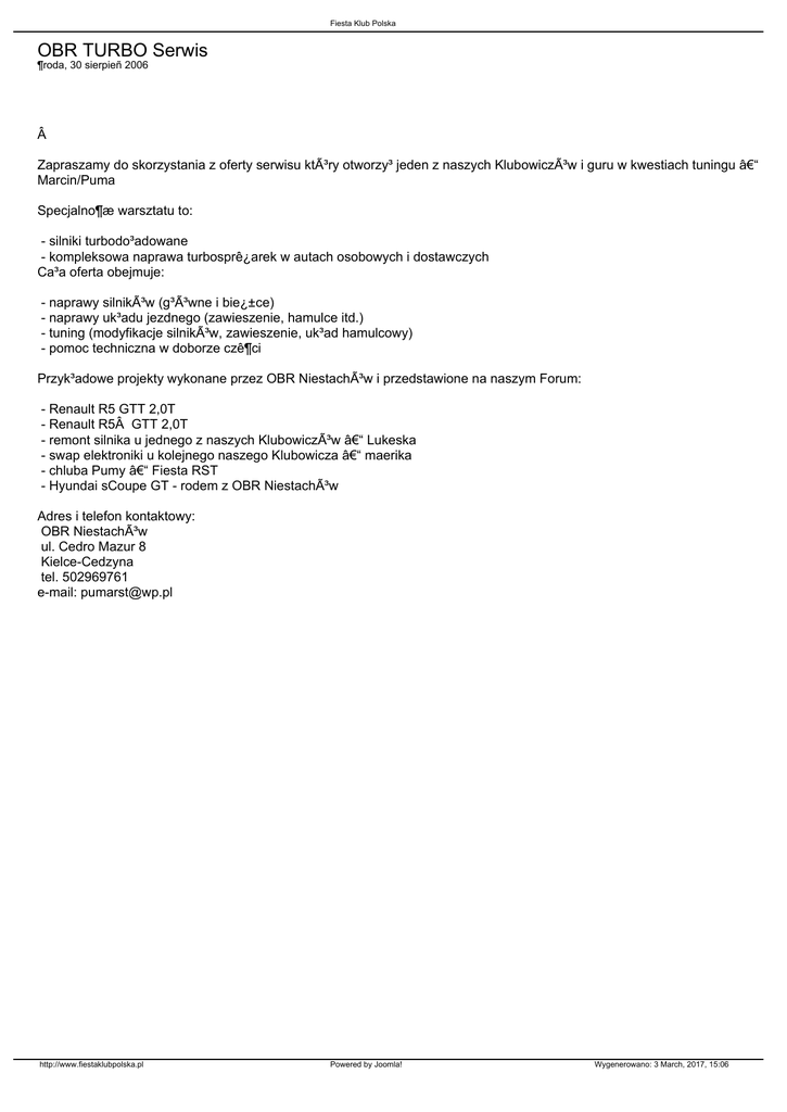 Fiesta Klub Polska OBR TURBO Serwis ¶roda, 30 sierpieñ 2006  Zapraszamy do skorzystania z oferty serwisu który otworzy³ jeden z naszych Klubowiczów i guru w kwestiach tuningu – Marcin/Puma Specjalno¶æ warsztatu to: - silniki turbodo³adowane - kompleksowa naprawa turbosprê¿arek w autach osobowych i dostawczych Ca³a oferta obejmuje: - naprawy silników (g³Ã³wne i bie¿±ce) - naprawy uk³adu jezdnego (zawieszenie, hamulce itd.) - tuning (modyfikacje silników, zawieszenie, uk³ad hamulcowy) - pomoc techniczna w doborze czê¶ci Przyk³adowe projekty wykonane przez OBR Niestachów i przedstawione na naszym Forum: - Renault R5 GTT 2,0T - Renault R5 GTT 2,0T - remont silnika u jednego z naszych Klubowiczów – Lukeska - swap elektroniki u kolejnego naszego Klubowicza – maerika - chluba Pumy – Fiesta RST - Hyundai sCoupe GT - rodem z OBR Niestachów Adres i telefon kontaktowy: OBR Niestachów ul. Cedro Mazur 8 Kielce-Cedzyna tel. 502969761 e-mail: [email protected] http://www.fiestaklubpolska.pl Powered by Joomla! Wygenerowano: 3 March, 2017, 15:06