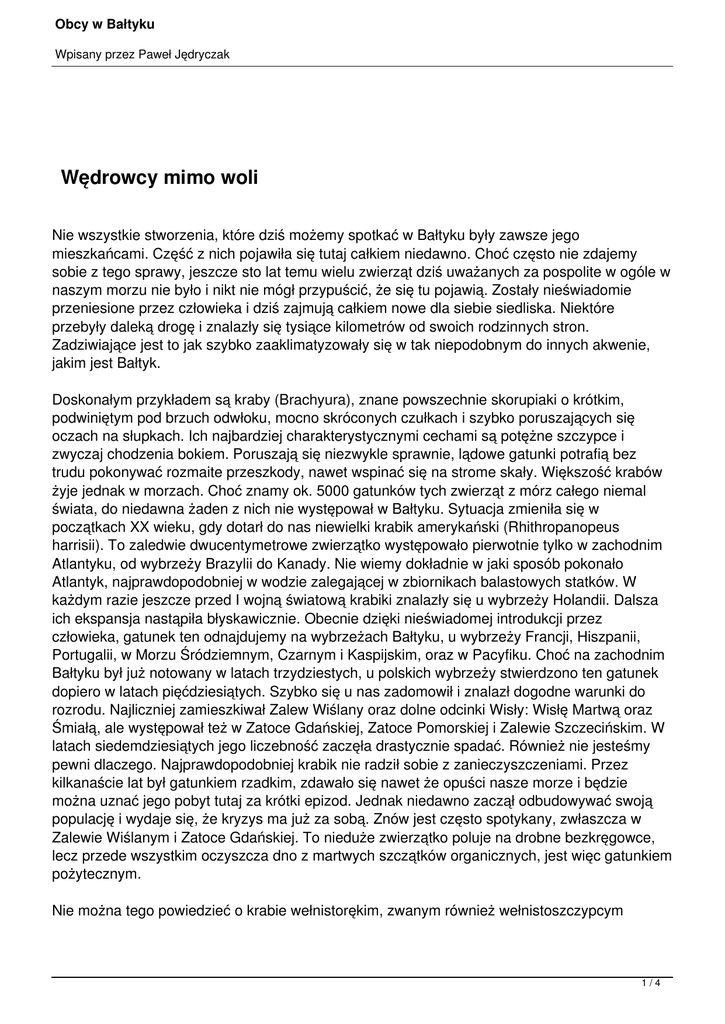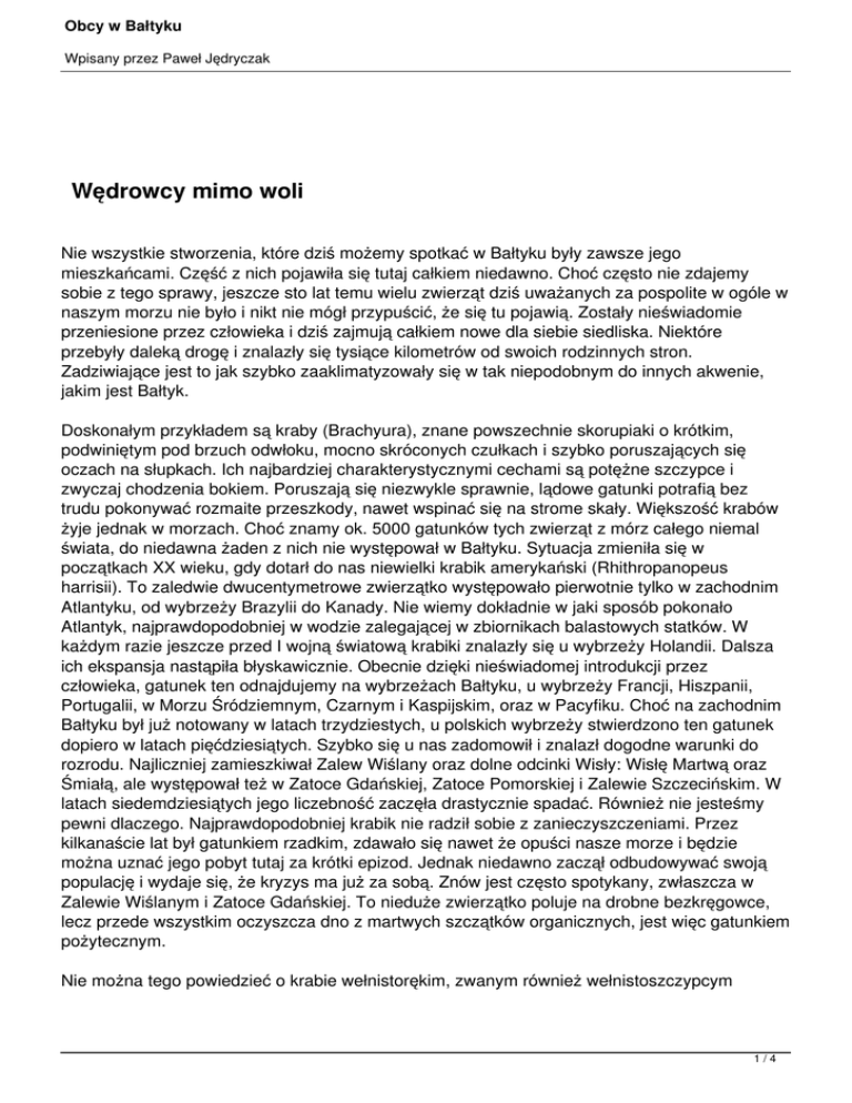 Obcy w Bałtyku Wpisany przez Paweł Jędryczak Wędrowcy mimo woli Nie wszystkie stworzenia, które dziś możemy spotkać w Bałtyku były zawsze jego mieszkańcami. Część z nich pojawiła się tutaj całkiem niedawno. Choć często nie zdajemy sobie z tego sprawy, jeszcze sto lat temu wielu zwierząt dziś uważanych za pospolite w ogóle w naszym morzu nie było i nikt nie mógł przypuścić, że się tu pojawią. Zostały nieświadomie przeniesione przez człowieka i dziś zajmują całkiem nowe dla siebie siedliska. Niektóre przebyły daleką drogę i znalazły się tysiące kilometrów od swoich rodzinnych stron. Zadziwiające jest to jak szybko zaaklimatyzowały się w tak niepodobnym do innych akwenie, jakim jest Bałtyk. Doskonałym przykładem są kraby (Brachyura), znane powszechnie skorupiaki o krótkim, podwiniętym pod brzuch odwłoku, mocno skróconych czułkach i szybko poruszających się oczach na słupkach. Ich najbardziej charakterystycznymi cechami są potężne szczypce i zwyczaj chodzenia bokiem. Poruszają się niezwykle sprawnie, lądowe gatunki potrafią bez trudu pokonywać rozmaite przeszkody, nawet wspinać się na strome skały. Większość krabów żyje jednak w morzach. Choć znamy ok. 5000 gatunków tych zwierząt z mórz całego niemal świata, do niedawna żaden z nich nie występował w Bałtyku. Sytuacja zmieniła się w początkach XX wieku, gdy dotarł do nas niewielki krabik amerykański (Rhithropanopeus harrisii). To zaledwie dwucentymetrowe zwierzątko występowało pierwotnie tylko w zachodnim Atlantyku, od wybrzeży Brazylii do Kanady. Nie wiemy dokładnie w jaki sposób pokonało Atlantyk, najprawdopodobniej w wodzie zalegającej w zbiornikach balastowych statków. W każdym razie jeszcze przed I wojną światową krabiki znalazły się u wybrzeży Holandii. Dalsza ich ekspansja nastąpiła błyskawicznie. Obecnie dzięki nieświadomej introdukcji przez człowieka, gatunek ten odnajdujemy na wybrzeżach Bałtyku, u wybrzeży Francji, Hiszpanii, Portugalii, w Morzu Śródziemnym, Czarnym i Kaspijskim, oraz w Pacyfiku. Choć na zachodnim Bałtyku był już notowany w latach trzydziestych, u polskich wybrzeży stwierdzono ten gatunek dopiero w latach pięćdziesiątych. Szybko się u nas zadomowił i znalazł dogodne warunki do rozrodu. Najliczniej zamieszkiwał Zalew Wiślany oraz dolne odcinki Wisły: Wisłę Martwą oraz Śmiałą, ale występował też w Zatoce Gdańskiej, Zatoce Pomorskiej i Zalewie Szczecińskim. W latach siedemdziesiątych jego liczebność zaczęła drastycznie spadać. Również nie jesteśmy pewni dlaczego. Najprawdopodobniej krabik nie radził sobie z zanieczyszczeniami. Przez kilkanaście lat był gatunkiem rzadkim, zdawało się nawet że opuści nasze morze i będzie można uznać jego pobyt tutaj za krótki epizod. Jednak niedawno zaczął odbudowywać swoją populację i wydaje się, że kryzys ma już za sobą. Znów jest często spotykany, zwłaszcza w Zalewie Wiślanym i Zatoce Gdańskiej. To nieduże zwierzątko poluje na drobne bezkręgowce, lecz przede wszystkim oczyszcza dno z martwych szczątków organicznych, jest więc gatunkiem pożytecznym. Nie można tego powiedzieć o krabie wełnistorękim, zwanym również wełnistoszczypcym 1/4 Obcy w Bałtyku Wpisany przez Paweł Jędryczak (Eriocheir sinensis), innym zawleczonym do nas obcym gatunku. Także i on prawdopodobnie przywędrował tu na statkach na początku XX wieku, miał jednak do pokonania dłuższą drogę. Jego ojczyzną są morza u wybrzeży Chin, Korei i Japonii. Obecnie, poza swoimi rodzinnymi stronami występuje też w Bałtyku, Morzu Północnym, u europejskich wybrzeży od Holandii po Zatokę Biskajską, w Morzu Śródziemnym, u atlantyckich wybrzeży Ameryki Północnej, w jeziorze Erie, rzece Mississipi i Zatoce Kalifornijskiej. W Polsce stwierdzono go na całym niemal odcinku wybrzeża (zwłaszcza w Zatoce Gdańskiej i Pomorskiej), w Wiśle, Odrze, Warcie i niektórych mazurskich jeziorach. Skolonizowanie tak różnych środowisk umożliwiła mu duża elastyczność, a zwłaszcza odporność na znaczne nawet wahania temperatur. To dość duży krab, jego pancerz osiąga 7-8 cm szerokości. Prowadzi wędrowny tryb życia. Młode, około roczne kraby udają się w górę rzek i tam pozostają nawet przez kilka lat. Powoduje to problemy, ponieważ krab wełnistoręki ma zwyczaj grzebania sobie nor, w których spędza większość dnia. Niestety, kopie je często w umocnieniach przeciwpowodziowych lub groblach, powodując czasem poważne zniszczenia. Na pocieszenie dodajmy, że gatunek ten nie rozmnaża się w Bałtyku, prawdopodobnie ze względu na zbyt niskie zasolenie. Niemal wszystkie spotykane u nas osobniki przywędrowały tu, idąc wzdłuż brzegów, z Morza Północnego, gdzie z kolei krab ten znalazł idealne dla siebie warunki do życia. Nieproszeni goście Mało kto zdaje sobie z tego sprawę, że jeden z najbardziej pospolitych skorupiaków Morza Bałtyckiego - pąkla (Balanus improvisus) - jest także gatunkiem zawleczonym. Pochodzi z Ameryki Południowej. Do nas trafiła w połowie XIX wieku. Niskie zasolenie Bałtyku zdaje się zupełnie jej nie przeszkadzać, gdyż występuje licznie w całym morzu. Te osiadłe skorupiaki okrywają swe ciało skorupką wapienną i przytwierdzają się nią do podłoża. Porastają obficie mola, boje, falochrony, a także burty statków. Oczyszczanie ich z pąkli jest czasochłonne i powoduje dotkliwe straty finansowe. Jeżeli jakiś skorupiak zasługuje na miano „crusta non grata”, to właśnie pąkla. Inwazje nie zakończyły się z początkiem XX wieku. Wciąż przybywają do nas nowe gatunki. W 1992 roku w północnym Bałtyku pojawił się drapieżny planktoniczny skorupiak Cercopagis pengoi, należący do wioślarek (Cladocera). Pochodzi z rejonu Morza Kaspijskiego. W 1999 roku znaleziono go przy Bulwarze Nadmorskim w Gdyni - jednym z najpłytszych miejsc Zatoki Gdańskiej. D
