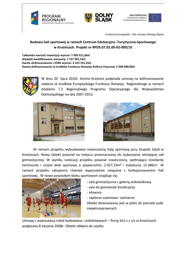 Fundusze Europejskie – dla rozwoju Dolnego Śląska Budowa hali sportowej w ramach Centrum Edukacyjno -Turystyczno-Sportowego w Krośnicach. Projekt nr RPDS.07.02.00-02-009/10 Całkowita wartość inwestycji wynosi: 7 995 611,66zł Wydatki kwalifikowane stanowią: 7 727 991,33zł Kwota dofinansowania z EFRR wynosi: 3 523 191,25zł Kwota dofinansowania ze środków Funduszu Rozwoju Kultury Fizycznej: 2 000 000,00zł W dniu 20 lipca 2010r. Gmina Krośnice podpisała umowę na dofinansowanie zadania ze środków Europejskiego Funduszu Rozwoju Regionalnego w ramach działania 7.2 Regionalnego Programu Operacyjnego dla Województwa Dolnośląskiego na lata 2007-2013. W ramach projektu wybudowano nowoczesną halę sportową przy Zespole Szkół w Krośnicach. Nowy obiekt powstał na miejscu przeznaczonej do wyburzenia istniejącej sali gimnastycznej. W wyniku realizacji projektu powstał nowoczesny, spełniający standardy techniczne i unijne blok sportowy o powierzchni: 2 027,19m² i kubaturze 15 486m³. W ramach projektu zakupiono również wyposażenie związane z funkcjonowaniem hali sportowej. W nowo powstałym bloku sportowym znajduje się: - sala gimnastyczna z galerią widowiskową - sala do gimnastyki korekcyjnej - siłownia - zaplecze szatniowo -sanitarne. Obiekt dostosowany jest w pełni do potrzeb osób niepełnosprawnych. Umowę z wykonawcą robót budowlano -rozbiórkowych – firmą SiLS s.c z/s w Krośnicach podpisano 8 sierpnia 2008r. Obiekt oddano do użytku Jednym z głównych problemów Zespołu Szkół i Przedszkola w Krośnicach był brak odpowiedniego zaplecza sportowego, które spełniałoby oczekiwania dzieci, ich rodziców i nauczycieli. Zajęcia sportowe odbywały się w małej sali gimnastycznej, która uniemożliwiała prowadzenie obowiązkowych i dodatkowych zajęd z wychowania fizycznego w nowoczesnych warunkach i na odpowiednio wysokim poziomie. Podnoszenie poziomu edukacyjnego jest niezwykle ważne dla zapewnienia młodym ludziom dobrego startu, szczególnie na obszarze wiejskim, do którego zalicza się gmina Krośnice. Ponadto nowoczesny obiekt przyciąga młodych ludzi i zachęca do spędzania wolnego czasu w sposób aktywny. Poprzez stworzenie atrakcyjnej alternatywy zapobiega rozwojowi zachowao patologicznych. Efekty inwestycji obejmą swym zasięgiem nie tylko dzieci z Zespołu Szkół ale obszar całej gminy, gdyż jej mieszkaocy będą mieli możliwośd uczestniczenia w różnego rodzaju meczach. Projekt ma również znaczenie ekonomiczne, tworzy nowe miejsca pracy oraz podnosi atrakcyjnośd terenu dla prywatnych inwestorów planujących osiedlenie się na terenie gminy. Projekt współfinansowany z Unii Europejskiej ze środków Europejskiego Funduszu Rozwoju Regionalnego w ramach Regionalnego Programu Operacyjnego dla Województwa Dolnośląskiego na lata 2007-2013 oraz ze środków Funduszu Rozwoju Kultury Fizycznej.