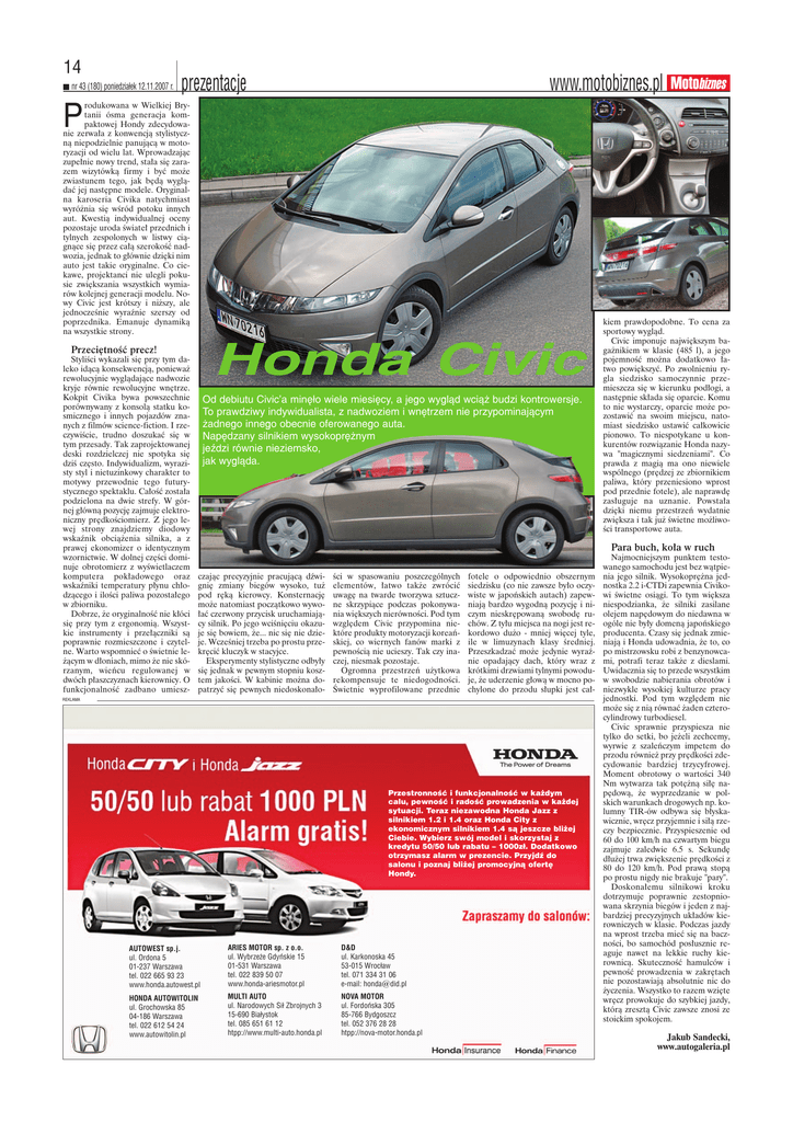 14 nr 43 (180) poniedzia³ek 12.11.2007 r. P prezentacje rodukowana w Wielkiej Brytanii ósma generacja kompaktowej Hondy zdecydowanie zerwała z konwencją stylistyczną niepodzielnie panującą w motoryzacji od wielu lat. Wprowadzając zupełnie nowy trend, stała się zarazem wizytówką firmy i być może zwiastunem tego, jak będą wyglądać jej następne modele. Oryginalna karoseria Civika natychmiast wyróżnia się wśród potoku innych aut. Kwestią indywidualnej oceny pozostaje uroda świateł przednich i tylnych zespolonych w listwy ciągnące się przez całą szerokość nadwozia, jednak to głównie dzięki nim auto jest takie oryginalne. Co ciekawe, projektanci nie ulegli pokusie zwiększania wszystkich wymiarów kolejnej generacji modelu. Nowy Civic jest krótszy i niższy, ale jednocześnie wyraźnie szerszy od poprzednika. Emanuje dynamiką na wszystkie strony. Honda Civic Przeciętność precz! Styliści wykazali się przy tym daleko idącą konsekwencją, ponieważ rewolucyjnie wyglądające nadwozie kryje równie rewolucyjne wnętrze. Kokpit Civika bywa powszechnie porównywany z konsolą statku kosmicznego i innych pojazdów znanych z filmów science-fiction. I rzeczywiście, trudno doszukać się w tym przesady. Tak zaprojektowanej deski rozdzielczej nie spotyka się dziś często. Indywidualizm, wyrazisty styl i nietuzinkowy charakter to motywy przewodnie tego futurystycznego spektaklu. Całość została podzielona na dwie strefy. W górnej główną pozycję zajmuje elektroniczny prędkościomierz. Z jego lewej strony znajdziemy diodowy wskaźnik obciążenia silnika, a z prawej ekonomizer o identycznym wzornictwie. W dolnej części dominuje obrotomierz z wyświetlaczem komputera pokładowego oraz wskaźniki temperatury płynu chłodzącego i ilości paliwa pozostałego w zbiorniku. Dobrze, że oryginalność nie kłóci się przy tym z ergonomią. Wszystkie instrumenty i przełączniki są poprawnie rozmieszczone i czytelne. Warto wspomnieć o świetnie leżącym w dłoniach, mimo że nie skórzanym, wieńcu regulowanej w dwóch płaszczyznach kierownicy. O funkcjonalność zadbano umiesz- www.motobiznes.pl Od debiutu Civic’a minê³o wiele miesiêcy, a jego wygl¹d wci¹¿ budzi kontrowersje. To prawdziwy indywidualista, z nadwoziem i wnêtrzem nie przypominaj¹cym ¿adnego innego obecnie oferowanego auta. Napêdzany silnikiem wysokoprê¿nym jeŸdzi równie nieziemsko, jak wygl¹da. kiem prawdopodobne. To cena za sportowy wygląd. Civic imponuje największym bagażnikiem w klasie (485 l), a jego pojemność można dodatkowo łatwo powiększyć. Po zwolnieniu rygla siedzisko samoczynnie przemieszcza się w kierunku podłogi, a następnie składa się oparcie. Komu to nie wystarczy, oparcie może pozostawić na swoim miejscu, natomiast siedzisko ustawić całkowicie pionowo. To niespotykane u konkurentów rozwiązanie Honda nazywa "magicznymi siedzeniami". Co prawda z magią ma ono niewiele wspólnego (prędzej ze zbiornikiem paliwa, który przeniesiono wprost pod przednie fotele), ale naprawdę zasługuje na uznanie. Powstała dzięki niemu przestrzeń wydatnie zwiększa i tak już świetne możliwości transportowe auta. Para buch, koła w ruch czając precyzyjnie pracującą dźwignię zmiany biegów wysoko, tuż pod ręką kierowcy. Konsternację może natomiast początkowo wywołać czerwony przycisk uruchamiający silnik. Po jego wciśnięciu okazuje się bowiem, że... nic się nie dzieje. Wcześniej trzeba po prostu przekręcić kluczyk w stacyjce. Eksperymenty stylistyczne odbyły się jednak w pewnym stopniu kosztem jakości. W kabinie można dopatrzyć się pewnych niedoskonało- ści w spasowaniu poszczególnych elementów, łatwo także zwrócić uwagę na twarde tworzywa sztuczne skrzypiące podczas pokonywania większych nierówności. Pod tym względem Civic przypomina niektóre produkty motoryzacji koreańskiej, co wiernych fanów marki z pewnością nie ucieszy. Tak czy inaczej, niesmak pozostaje. Ogromna przestrzeń użytkowa rekompensuje te niedogodności. Świetnie wyprofilowane przednie fotele o odpowiednio obszernym siedzisku (co nie zawsze było oczywiste w japońskich autach) zapewniają bardzo wygodną pozycję i niczym nieskrępowaną swobodę ruchów. Z tyłu miejsca na nogi jest rekordowo dużo - mniej więcej tyle, ile w limuzynach klasy średniej. Przeszkadzać może jedynie wyraźnie opadający dach, który wraz z krótkimi drzwiami tylnymi powoduje, że uderzenie głową w mocno pochylone do przodu słupki jest cał- REKLAMA Przestronnoœæ i funkcjonalnoœæ w ka¿dym calu, pewnoœæ i radoœæ prowadzenia w ka¿dej sytuacji. Teraz niezawodna Honda Jazz z silnikiem 1.2 i 1.4 oraz Honda City z ekonomicznym silnikiem 1.4 s¹ jeszcze bli¿ej Ciebie. Wybierz swój model i skorzystaj z kredytu 50/50 lub rabatu – 1000z³. Dodatkowo otrzymasz alarm w prezencie. PrzyjdŸ do salonu i poznaj bli¿ej promocyjn¹ ofertê Hondy. AUTOWEST sp.j. ul. Ordona 5 01-237 Warszawa tel. 022 665 93 23 www.honda.autowest.pl ARIES MOTOR sp. z o.o. ul. Wybrze¿e Gdyñskie 15 01-531 Warszawa tel. 022 839 50 07 www.honda-ariesmotor.pl D&D ul. Karkonoska 45 53-015 Wroc³aw tel. 071 334 31 06 e-mail: [email protected] HONDA AUTOWITOLIN ul. Grochowska 85 04-186 Warszawa tel. 022 612 54 24 www.autowitolin.pl MULTI AUTO ul. Narodowych Si³ Zbrojnych 3 15-690 Bia³ystok tel. 085 651 61 12 htpp://www.multi-auto.honda.pl NOVA MOTOR ul. Fordoñska 305 85-766 Bydgoszcz tel. 052 376 28 28 htpp://nova-motor.honda.pl Najmocniejszym punktem testowanego samochodu jest bez wątpienia jego silnik. Wysokoprężna jednostka 2.2 i-CTDi zapewnia Civikowi świetne osiągi. To tym większa niespodzianka, że silniki zasilane olejem napędowym do niedawna w ogóle nie były domeną japońskiego producenta. Czasy się jednak zmieniają i Honda udowadnia, że to, co po mistrzowsku robi z benzynowcami, potrafi teraz także z dieslami. Uwidacznia się to przede wszystkim w swob
