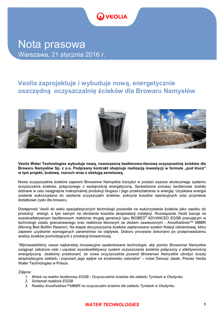 Nota prasowa Warszawa, 21 stycznia 2016 r. Veolia zaprojektuje i wybuduje nową, energetycznie oszczędną oczyszczalnię ścieków dla Browaru Namysłów Veolia Water Technologies wybuduje nową, nowoczesną beztlenowo-tlenową oczyszczalnię ścieków dla Browaru Namysłów Sp. z o.o. Podpisany kontrakt obejmuje realizację inwestycji w formule „pod klucz” w tym projekt, budowę, rozruch wraz z obsługą serwisową. Nowa oczyszczalnia ścieków zapewni Browarowi Namysłów korzyści w postaci wysoce skutecznego systemu oczyszczania ścieków, połączonego z wydajnością energetyczną. Sprawdzone procesy beztlenowe zostały dobrane w celu osiągnięcia maksymalnej produkcji biogazu i jego przekształcenia w energię. Uzyskana energia zostanie wykorzystana do zasilania oczyszczalni ścieków, pokrycia kosztów operacyjnych oraz przyniesie dodatkowe zyski dla browaru. Dostępność Veolii do wielu specjalistycznych technologii pozwoliła na wykorzystanie ścieków jako zasobu do produkcji energii, a tym samym na obniżenie kosztów eksploatacji instalacji. Rozwiązanie Veolii bazuje na ® wysokoefektywnym beztlenowym reaktorze drugiej generacji typu BIOBED ADVANCED EGSB pracującym w technologii osadu granulowanego oraz reaktorze tlenowym ze złożem zawieszonym - AnoxKaldnes™ MBBR (Moving Bed Biofilm Reactor). Na etapie doczyszczania ścieków zaplanowano system flotacji ciśnieniowej, który zapewni uzyskanie wymaganych parametrów na odpływie. Doboru procesów dokonano po przeprowadzeniu analizy ścieków pochodzących z produkcji browarniczej. “Wprowadziliśmy nasze najbardziej innowacyjne opatentowane technologie, aby pomóc Browarowi Namysłów osiągnąć założone cele i uzyskać wysokoefektywny system oczyszczania ścieków połączony z efektywnością energetyczną. Jesteśmy przekonani, że nowa oczyszczalnia pozwoli Browarowi Namysłów obniżyć koszty eksploatacyjne zakładu i poprawić jego wpływ na środowisko naturalne” – mówi Dariusz Jasak, Prezes Veolia Water Technologies w Polsce. Zdjęcia: 1. Widok na reaktor beztlenowy EGSB - Oczyszczalnia ścieków dla zakładu Tymbark w Olsztynku 2. Schemat reaktora EGSB 3. Reaktor AnoxKaldnes™MBBR na oczyszczalni ścieków dla zakładu Tymbark w Olsztynku WATER TECHNOLOGIES 1 Nota prasowa Warszawa, 21 stycznia 2016 r. ... Veolia jest światowym liderem specjalizującym się w optymalnym zarządzaniu zasobami naturalnymi. Zatrudnia ponad 179 tys. pracowników* na całym świecie. Grupa tworzy i wdraża rozwiązania w zakresie gospodarki wodnej, gospodarki odpadami i energii. Rozwiązania te przyczyniają się do zrównoważonego rozwoju miast i przemysłu. Rozwijając trzy uzupełniające się działalności, Veolia zapewnia dostęp do zasobów, chroni je oraz odnawia. W 2014 roku Veolia zaopatrzyła w wodę pitną 96 milionów mieszkańców, a 60 milionów objęła usługą oczyszczania ścieków, wyprodukowała 52 mln MWh energii i odzyskała 31 mln ton odpadów na drodze odzysku materiałowego i energetycznego. W 2014 roku Veolia Environnement (notowana na giełdzie w Paryżu Paris Euronext: VIE), odnotowała obroty w wysokości 24,4 mld euro*. www.veolia.com Veolia Water Technologies specjalizuje się w rozwiązaniach technologicznych oraz projektowaniu i realizacji projektów w zakresie oczyszczania wody i ścieków dla klientów komunalnych i przemysłowych. www.veoliawatertechnologies.pl www.veoliawatertechnologies.com (*) 2014 dane pro-forma, w tym Dalkia International (100%) oraz z wyłączeniem Dalkia France . Kontakt Dr inż. Bogusław Buczak, Dyrektor Działu Sprzedaży D&B, Sektor Przemysłowy Tel.: +48 12 423 38 66 [email protected] www.veoliawatertechnologies.pl Veolia Water Technologies Sp. z o.o. ul. Puławska 2 02-566 Warszawa tel.: +48 22 568 83 00 2