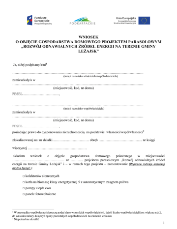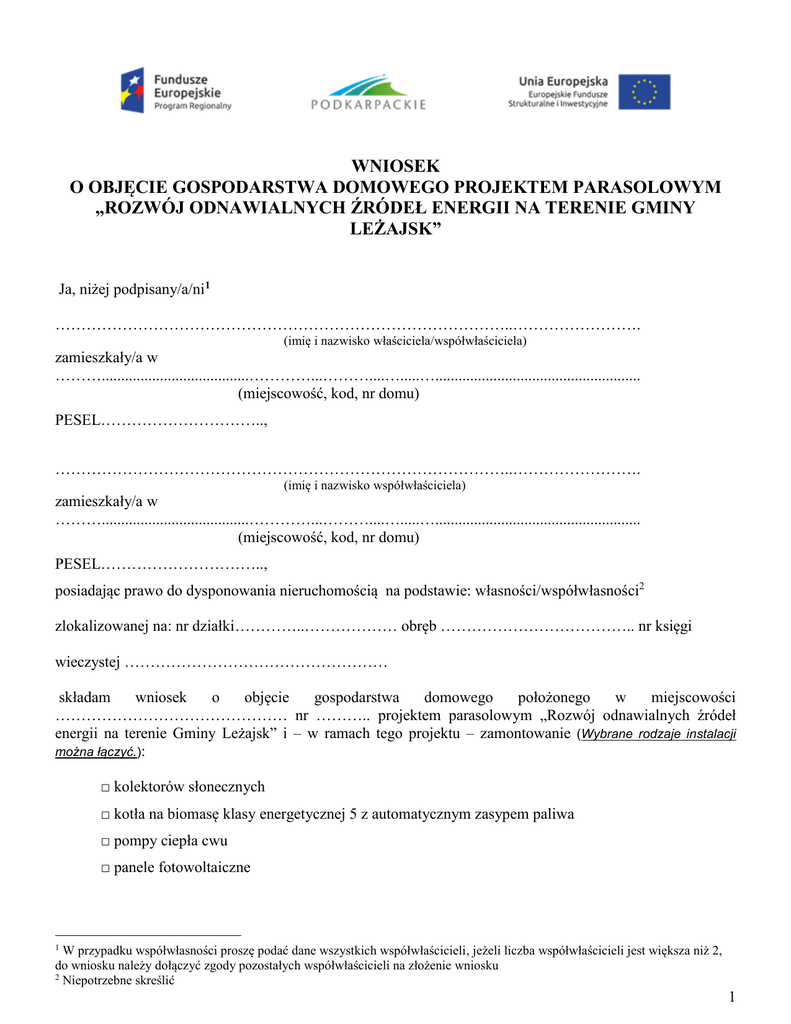WNIOSEK O OBJĘCIE GOSPODARSTWA DOMOWEGO PROJEKTEM PARASOLOWYM „ROZWÓJ ODNAWIALNYCH ŹRÓDEŁ ENERGII NA TERENIE GMINY LEŻAJSK” Ja, niżej podpisany/a/ni1 ……………………………………………………………………………..……………………. (imię i nazwisko właściciela/współwłaściciela) zamieszkały/a w ………......................................…………...………....….....…..................................................... (miejscowość, kod, nr domu) PESEL………………………….., ……………………………………………………………………………..……………………. (imię i nazwisko współwłaściciela) zamieszkały/a w ………......................................…………...………....….....…..................................................... (miejscowość, kod, nr domu) PESEL………………………….., posiadając prawo do dysponowania nieruchomością na podstawie: własności/współwłasności2 zlokalizowanej na: nr działki…………..……………… obręb ……………………………….. nr księgi wieczystej …………………………………………… składam wniosek o objęcie gospodarstwa domowego położonego w miejscowości ……………………………………… nr ……….. projektem parasolowym „Rozwój odnawialnych źródeł energii na terenie Gminy Leżajsk” i – w ramach tego projektu – zamontowanie (Wybrane rodzaje instalacji można łączyć.): □ kolektorów słonecznych □ kotła na biomasę klasy energetycznej 5 z automatycznym zasypem paliwa □ pompy ciepła cwu □ panele fotowoltaiczne W przypadku współwłasności proszę podać dane wszystkich współwłaścicieli, jeżeli liczba współwłaścicieli jest większa niż 2, do wniosku należy dołączyć zgody pozostałych współwłaścicieli na złożenie wniosku 2 Niepotrzebne skreślić 1 1 Wniosek dotyczy (zaznaczyć właściwe): □ budynku zamieszkanego i oddanego do użytku na dzień składania wniosku □ budynek planowany do oddania do użytku w terminie do 31 maja 2017 r. INFORMACJE UZUPEŁNIAJĄCE DO WNIOSKU KOLEKTORY SŁONECZNE3 1. 2. 3. 4. 5. Liczba osób zamieszkałych w budynku: …….... Roczne zużycie wody: ......................................m3 Ilość zużywanego rocznie paliwa: ….………. ton Rodzaj paliwa obecnie używanego do podgrzewania wody użytkowej:…………………………….. Proponowane miejsce instalacji kolektorów słonecznych: □ dach płaski □ elewacja □ dach skośny strona południowa □ grunt □ dach skośny strona południowo-wschodnia □ budynek gospodarczy □ dach skośny strona południowo-zachodnia □ balkon/taras 6. Pokrycie dachu: □ dachówka: ceramiczna / karpiówka / cementowa □ ondulina □ blacha: karpiówka / trapezowa / płaska /profilowana □ eternit: falisty □ gont / papa □ eternit: płaski 7. Planowane miejsce na podgrzewacz solarny: □ kotłowania, □ ocieplone poddasze □ pomieszczenie gospodarcze □ pomieszczenie mieszkalne 8. Wymiary pomieszczenia na podgrzewacz solarny: szerokość ….…. długość….…. wysokość…….. 9. Szerokość drzwi pomieszczenia przygotowanego na podgrzewacz solarny:………,….. m 10. Czy w pomieszczeniu, gdzie będzie znajdował się zbiornik c.w.u. doprowadzony jest prąd? □ Tak □ Nie 11. Czy w pomieszczeniu, gdzie będzie znajdował się zbiornik c.w.u., jest możliwość podłączenia się do ciepłej i zimnej wody użytkowej? □ Tak □ Nie – podać szacunkową odległość………..……m 12. Czy obecnie na instalacji jest zamontowany reduktor ciśnienia? □ Tak □ Nie 13. Czy istnieje instalacja odgromowa w budynku? □ Tak □ Nie 14. Istniejące źródło ciepła dla podgrzania ciepłej wody użytkowej: □ kocioł gazowy 1-funkcyjny z wolnostojącym zasobnikiem □ kocioł gazowy 2-funkcyjny □ kocioł gazowy 1-funkcyjny ze zintegrowanym zasobnikiem □ kocioł gazowy gaz ziemny / płynny □ kocioł na paliwo stałe węgiel □ kocioł na paliwo stałe opalany biomasą □ kocioł olejowy □ przepływowy podgrzewacz wody □ pojemnościowy podgrzewacz wody 3 Należy wypełnić jeżeli wniosek dotyczy kolektorów słonecznych 2 KOCIOŁ NA BIOMASĘ4 1. Powierzchnia / kubatura domu: .……..m2 / ….……m3 2. Ilość zużywanego rocznie paliwa: ….………. ton 3. Moc istniejącego kotła: ……………………….…... kW 4. Rodzaj paliwa obecnie używanego do podgrzewania wody użytkowej:…………………………….. 5. Rodzaj paliwa obecnie używanego do ogrzewania domu: ……………………………………….…. 6. Wymiary kotłowni lub miejsca przeznaczonego na kocioł: szerokość….…. długość….…. wysokość…….. 7. Czy kocioł grzeje ciepłą wodę użytkową? □ Tak □ Nie POMPA CIEPŁA5 1. 2. 3. 4. 5. 6. 7. Powierzchnia / kubatura domu: .……..m2 / ….……m3 Moc istniejącego kotła: ……………………….…... kW Ilość zużywanego rocznie paliwa: ….………. ton Liczba osób stale przebywających w budynku:…….... Roczne zużycie wody: ......................................m3 Rodzaj paliwa obecnie używanego do podgrzewania wody użytkowej: …………………………….. Rodzaj paliwa obecnie używanego do ogrzewania domu: ………………………………………….…. PANELE FOTOWOLTAICZNE 1. Moc umowna (przyłączeniowa)6 ………. Zużycie energii elektrycznej w elektryczną 2015 r. Wyszczególnienie gospodarstwie domowym na podstawie rachunków za energię Zużycie w okresach rozliczeniowych7 w 2015 r. Zużycie rzeczywiste [kWh] Zużycie prognozowane [kWh] Rok 2015 2. Proponowane miejsce instalacji paneli fotowoltaicznych □ dach płaski □ dach skośny strona południowa □ dach skośny strona południowo-wschodnia □ dach skośny strona południowo-zachodnia 3. Pokrycie dachu: □ dachówka: ceramiczna / karpiów