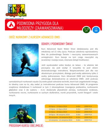 Kurs Advanced Open Water Diver dedykowany jest dla młodzieży od 15 roku życia. Podczas szkolenia wprowadzimy Was do podwodnego Świata i nauczymy zaawansowanych umiejętności. Kurs bazuje na tym czego nauczyłeś się wcześniej i rozwija nowe, nieznane dotąd możliwości. Jeśli wyobrażałeś sobie kiedyś, że latasz – to właśnie tak poczujesz się pod wodą! A wszystko to pod okiem doświadczonego instruktora. Bezpieczeństwo jest dla nas absolutnym priorytetem, dlatego pod wodę zabieramy tylko 2 osoby jednorazowo. Kurs Advanced OWD jest kontynuacją zebranego doświadczenia ze szkolenia OWD. Jeśli podczas samodzielnych nurkowań naszło Cię wiele pytań odnośnie techniki, teorii lub czegokolwiek innego, to idealny czas na to, aby zadać je instruktorowi podczas kursu Advanced OWD. W programie znajdziesz dodatkowe 5 nurkowań w tym 2 obowiązkowe (nawigacja podwodna, nurkowanie głębokie) oraz 3 do wyboru – m.in: doskonała pływalność zerowa, nurkowanie wrakowe, nurkowanie nocne, nurkowanie w suchym skafandrze, nurek przyrodnik, nurek fotograf i wiele innych. 05 lipca - 13 lipca 2014 8 dni 2099 PLN 13 lipca - 21 lipca 2014 8 dni 2099 PLN 21 lipca - 29 lipca 2014 8 dni 2099 PLN 29 lipca - 06 sierpnia 2014 8 dni 2099 PLN 06 sierpnia - 14 sierpnia 2014 8 dni 2099 PLN 14 sierpnia - 22 sierpnia 2014 8 dni 2099 PLN Nurkowania obowiązkowe i do wyboru W czasie kursu wymagamy dwa nurkowania obowiązkowe, które każdy uczestnik musi zaliczyć: nawigacyjne i głębokie (do 21m). Oprócz tego uczestnik podchodzi do trzech nurkowań nieobowiązkowych, tzw. ‚do wyboru’. Nawigacja podwodna Nurkowanie to bardzo przyjemny sport i w zasadzie dość prosty. Jednak pewien zasób wiedzy i umiejętności jest niezbędny aby bezpiecznie nurkować. Są to techniki bardzo przydatne dla płetwonurka prowadzącego. Nawigacja podwodna to kombinacja nurkowania naturalnego i nawigacji z kompasem. Nurkowanie głębokie Podczas nurkowań głębokich każdy student pozna techniki i procedury nurkowania niezbędne, aby nurkować na głębokości do 30 m. Nurkowania do wyboru: Doskonała pływalność zerowa (trym) – W tej kwestii po kursie OWD na pewno jest kilka rzeczy do poprawienia, gdyż utrzymanie dobrej pływalności jest podstawą bezpiecznego nurkowania. Trym będzie się przewijać przez wszystkie nurkowania na kursie Advanced Open Water Diver. Jeśli na kursie OWD radziłeś sobie w tym temacie nieźle to czas, aby być w nim doskonałym. Nurkowanie wrakowe – Ulubiona forma płetwonurków. Nurkowanie wrakowe sprawa, że nurek czuje dreszczyk emocji, podniecenia i lęku. Nurkowanie wrakowe jest bardzo niebezpieczne, dlatego tak ważne, aby uczestnik kursu odbył tę część pod okiem instruktora. Wraki to najczęściej zatopione statki, które różnią się od siebie stanem technicznym, wielkością i rodzajem. Nurkowanie nocne – pozwala poznać życie podwodne z zupełnie innej strony. Podczas nurkowania nocnego uczestnik przeżyje niezapomniane chwile w towarzystwie niezapomnianych emocji. Nocą dojrzysz to czego nie zobaczysz w dzień, gdyż widzimy tylko to co oświetlimy latarką co pozwala nam na skupieniu uwagi na szczegółach. Nurkowanie w suchym skafandrze – Obecnie większość nurków uprawiających sport w naszej strefie klimatycznej używa takich skafandrów ze względów na m.in bardzo wysoki komfort cieplny. Nurek fotograf – Jeśli chcesz uświetnić swoje chwile pod wodą, aby pochwalić się znajomym to jest to idealny wybór dla Ciebie. Nurkowanie z aparatem nie jest tak proste jak mogłoby się wydawać… pewnie myślisz, że wystarczy nacisnąć spust migawki i uwiecznisz swoje chwile pod wodą – nic bardziej mylnego, przekonaj się i skorzystaj z nurkowania razem z aparatem fotograficznym. Zajęcia praktyczne Podczas kursu nie odbędą się zajęcia teoretyczne. Kursant sam musi przerobić powierzony mu materiał z podręcznika, wypełnić test sprawdzający opanowanie materiału oraz odbycie nurkowania danego typu. (http://www.camps4fun.pl/wp-content /uploads/sites/4/2014 /04/kurs_nurkowy.jpg)Zaliczenie Pod koniec obozu każdy jego uczestnik podejdzie do bezstresowego zaliczenia na otwartych wodach, aby nareszcie stać się zaawansowanym certyfikowanym nurkiem z prawdziwego zdarzenia! Podczas całego obozu nie zabraknie również czasu na wspólne wieczory pełne morskich opowieści, zajęć sportowych, kąpieli w mazurskich jeziorach, a także gier i zabaw integracyjnych. We własnym zakresie lub PKP z konwojentem z Gdańska, Warszawy, Poznania, Wrocławia, Krakowa , następnie autokarem z Giżycka (jeżeli zbierze się min. 5 osób z jednego miasta)- dodatkowa opłata według cennika w obie strony. W wypadku grup min. 10 osób możliwy dojazd z innych miejscowości. Uczestnicy zakwaterowani są w bazie Mazurskich Służb Ratowniczych w Okartowie. Stacja położona jest w przepięknej okolicy nad samym jeziorem Śniardwy. Do naszej dyspozycji oddany jest profesjonalny sprzęt wodny. Dzięki lokalizacji obozu jego uczestnicy mogą zobaczyć od wewnątrz, jak wygląda codzienna praca Mazurskich Służb Ratowniczych. (http://www.camps4fun.pl/wp-content/uploads/sites /4/2014/04/patent-junior-owd.jpg)Zaawansowany kurs dla uczestników posiadających certyfikat OWD, poszerzający i utrwalający wiedze na temat nurkowania. Międzynarodowy system szkolenia organizacji PADI zapewnia maksymalne bezpieczeństwo studentów podczas zajęć. Wymagany wiek do otrzymania certyfikatu Advanced OWD to 15 lat. Uprawnienia te umożliwiają nurkowanie do głębokości 30 m z partnerem oraz możliwość uczestnictwa we wszystkich specjalizacjach nurkowych PADI i kursie Rescue Diver. zakwaterowanie, transport w obie strony, pełne wyżywienie, opłata za wydanie certyfikatu*, opieka kadry, opłata za wydanie certyfikatu I pomocy**, kurs Advanced OWD, realizacja programu wraz z wykorzystaniem niezbędnych do tego sprzętów i materiałów, ubezpieczenie NNW. Gdańsk/Gdy