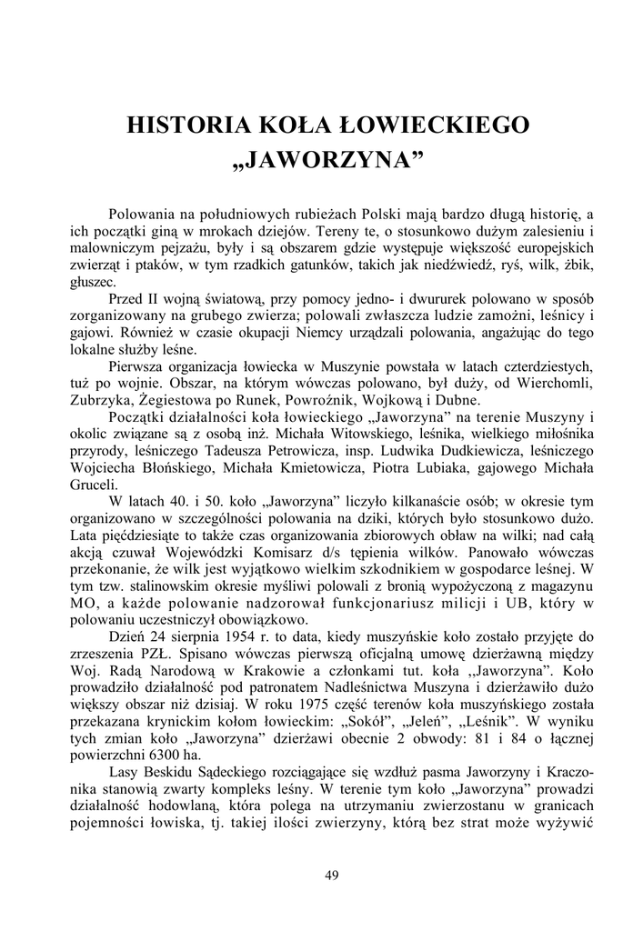 HISTORIA KOŁA ŁOWIECKIEGO „JAWORZYNA” Polowania na południowych rubieżach Polski mają bardzo długą historię, a ich początki giną w mrokach dziejów. Tereny te, o stosunkowo dużym zalesieniu i malowniczym pejzażu, były i są obszarem gdzie występuje większość europejskich zwierząt i ptaków, w tym rzadkich gatunków, takich jak niedźwiedź, ryś, wilk, żbik, głuszec. Przed II wojną światową, przy pomocy jedno- i dwururek polowano w sposób zorganizowany na grubego zwierza; polowali zwłaszcza ludzie zamożni, leśnicy i gajowi. Również w czasie okupacji Niemcy urządzali polowania, angażując do tego lokalne służby leśne. Pierwsza organizacja łowiecka w Muszynie powstała w latach czterdziestych, tuż po wojnie. Obszar, na którym wówczas polowano, był duży, od Wierchomli, Zubrzyka, Żegiestowa po Runek, Powroźnik, Wojkową i Dubne. Początki działalności koła łowieckiego „Jaworzyna” na terenie Muszyny i okolic związane są z osobą inż. Michała Witowskiego, leśnika, wielkiego miłośnika przyrody, leśniczego Tadeusza Petrowicza, insp. Ludwika Dudkiewicza, leśniczego Wojciecha Błońskiego, Michała Kmietowicza, Piotra Lubiaka, gajowego Michała Gruceli. W latach 40. i 50. koło „Jaworzyna” liczyło kilkanaście osób; w okresie tym organizowano w szczególności polowania na dziki, których było stosunkowo dużo. Lata pięćdziesiąte to także czas organizowania zbiorowych obław na wilki; nad całą akcją czuwał Wojewódzki Komisarz d/s tępienia wilków. Panowało wówczas przekonanie, że wilk jest wyjątkowo wielkim szkodnikiem w gospodarce leśnej. W tym tzw. stalinowskim okresie myśliwi polowali z bronią wypożyczoną z magazynu MO, a każde polowanie nadzorował funkcjonariusz milicji i UB, który w polowaniu uczestniczył obowiązkowo. Dzień 24 sierpnia 1954 r. to data, kiedy muszyńskie koło zostało przyjęte do zrzeszenia PZŁ. Spisano wówczas pierwszą oficjalną umowę dzierżawną między Woj. Radą Narodową w Krakowie a członkami tut. koła ,,Jaworzyna”. Koło prowadziło działalność pod patronatem Nadleśnictwa Muszyna i dzierżawiło dużo większy obszar niż dzisiaj. W roku 1975 część terenów koła muszyńskiego została przekazana krynickim kołom łowieckim: „Sokół”, „Jeleń”, „Leśnik”. W wyniku tych zmian koło „Jaworzyna” dzierżawi obecnie 2 obwody: 81 i 84 o łącznej powierzchni 6300 ha. Lasy Beskidu Sądeckiego rozciągające się wzdłuż pasma Jaworzyny i Kraczonika stanowią zwarty kompleks leśny. W terenie tym koło „Jaworzyna” prowadzi działalność hodowlaną, która polega na utrzymaniu zwierzostanu w granicach pojemności łowiska, tj. takiej ilości zwierzyny, którą bez strat może wyżywić 49 określona powierzchnia lasu. Nadwyżka zwierzyny, jak również sztukisłabe, przeznaczone są do odstrzału. Członkowie koła wybudowali wiele urządzeń łowieckich, m. in. 3 domki myśliwskie, nad wsią Dubne oraz w uroczyskach Huszczowate i Zimne. Zbudowano wiele paśników oraz lizawek na sól dla zwierzyny płowej. Latem członkowie koła koszą trawę na siano, którego zbierają kilka ton. Siano to wykłada się zimą do 15 paśników na obydwu obwodach. Ponadto koło płaci rolnikom 100% odszkodowania za szkody wyrządzone przez zwierzynę leśną. Uprawia się wiele poletek z ziemniakami, topinamburem, rzepą, na karmę dla zwierzyny na długie tutejsze zimy. Łączna powierzchnia poletek wynosi 7 ha, co wpływa na dobrą kondycję zwierzyny oraz jej duże pozyskanie. Koło „Jaworzyna” zajmuje przodujące miejsce pod tym względem w województwie nowosądeckim. Ilość godzin przepracowanych przez członków koła w roku rozrachunkowym przekracza 2000. Myśliwi czuwają również nad bezpieczeństwem gatunków chronionych (niedźwiedź, wydra). Prowadzono także próby introdukcji gatunków tu nie występujących; zakupiono bażanty, które puszczono w tutejsze lasy, niestety okazało się, że wysokość ca 500 m npm. jest wysokością graniczną i bażant nie jest w stanie się tu zaaklimatyzować. Sprowadzono też zające z terenów nizinnych celem odświeżenia krwi. Specyfika klimatu podgórskiego oraz jakość drzewostanu określają bytujące na tej wysokości (ca 500 — 1100 m npm.) zwierzęta oraz ptaki łowne; nie występują tu gatunki wysokogórskie, jak kozica czy świstak, ani nizinne, jak daniel, muflon czy bażant. Lata 70. i 80. to okres zwiększania się populacji jelenia. W ostatnich latach koło „Jaworzyna” pozyskuje ok. 70 sztuk jeleni rocznie. Na drugim miejscu, gdy mowa o zwierzynie grubej, należy wymienić dzika. Oczywiście jest wiele saren, zajęcy, lisów. Członkowie koła posiadają wiele cennych trofeów na skalę europejską: oręż (kły) dzika, wieńce jeleni, parostki rogaczy, czaszki i skóry wilków oraz rysia. Sądeckie lasy oraz malowniczy krajobraz to wymarzony teren dla przyrodników i myśliwych. Przyjeżdżało tu wiele znanych w Polsce i za granicą osób: Włodzimierz Puchalski, Michał Sumiński, prof. Dzięgielewski — jeżeli chodzi o przyrodników. Na polowania zjeżdżało wiele osobistości z życia politycznego oraz wielu „dewizowców”, czyli myśliwych z Europy Zachodniej, którym — za odpowiednimi opłatami — umożliwia się odstrzał jeleni-byków, dzików, rogaczy oraz pozyskanie trofeum, czyli wieńca jelenia, parostków rogaczy lub oręża (kłów) dzika. Obecnie koło łowieckie „Jaworzyna” liczy 40 członków, zrzeszonych w Polskim Związku Łowieckim. Poluje się zbiorowo i indywidualnie. Polowania zbiorowe organizowane są od 3 listopada (dzień św. Huberta, patrona myśliwych) do końca stycznia każdego roku. Natomiast polowania indywidualne, na pojedyncze sztuki, trwają prawie cały rok, oczywiście z zachowaniem okresów ochronnych i innych wymogów etyki łowieckiej. Bogdan Witowski 50