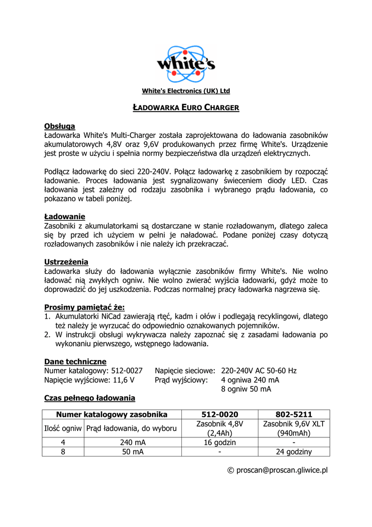 White's Electronics (UK) Ltd ŁADOWARKA EURO CHARGER Obsługa Ładowarka White's Multi-Charger została zaprojektowana do ładowania zasobników akumulatorowych 4,8V oraz 9,6V produkowanych przez firmę White's. Urządzenie jest proste w użyciu i spełnia normy bezpieczeństwa dla urządzeń elektrycznych. Podłącz ładowarkę do sieci 220-240V. Połącz ładowarkę z zasobnikiem by rozpocząć ładowanie. Proces ładowania jest sygnalizowany świeceniem diody LED. Czas ładowania jest zależny od rodzaju zasobnika i wybranego prądu ładowania, co pokazano w tabeli poniżej. Ładowanie Zasobniki z akumulatorkami są dostarczane w stanie rozładowanym, dlatego zaleca się by przed ich użyciem w pełni je naładować. Podane poniżej czasy dotyczą rozładowanych zasobników i nie należy ich przekraczać. Ustrzeżenia Ładowarka służy do ładowania wyłącznie zasobników firmy White's. Nie wolno ładować nią zwykłych ogniw. Nie wolno zwierać wyjścia ładowarki, gdyż może to doprowadzić do jej uszkodzenia. Podczas normalnej pracy ładowarka nagrzewa się. Prosimy pamiętać że: 1. Akumulatorki NiCad zawierają rtęć, kadm i ołów i podlegają recyklingowi, dlatego też należy je wyrzucać do odpowiednio oznakowanych pojemników. 2. W instrukcji obsługi wykrywacza należy zapoznać się z zasadami ładowania po wykonaniu pierwszego, wstępnego ładowania. Dane techniczne Numer katalogowy: 512-0027 Napięcie wyjściowe: 11,6 V Czas pełnego ładowania Napięcie sieciowe: 220-240V AC 50-60 Hz Prąd wyjściowy: 4 ogniwa 240 mA 8 ogniw 50 mA Numer katalogowy zasobnika Ilość ogniw Prąd ładowania, do wyboru 4 8 240 mA 50 mA 512-0020 Zasobnik 4,8V (2,4Ah) 16 godzin - 802-5211 Zasobnik 9,6V XLT (940mAh) 24 godziny © [email protected]