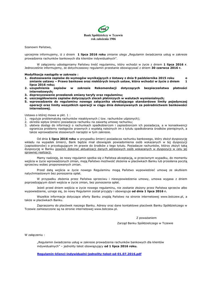 Bank Spółdzielczy w Tczewie rok założenia 1906 Szanowni Państwo, uprzejmie informujemy, iż z dniem 1 lipca 2016 roku zmianie ulega „Regulamin świadczenia usług w zakresie prowadzenia rachunków bankowych dla klientów indywidualnych”. W załączeniu udostępniamy Państwu treść regulaminu, który wchodzi w życie z dniem 1 lipca 2016 r. Jednocześnie informujemy, że dotychczasowy regulamin przestanie obowiązywać z dniem 30 czerwca 2016 r. Modyfikacja nastąpiła w zakresie : 1. dostosowania zapisów do wymogów wynikających z Ustawy z dnia 9 października 2015 roku o zmianie ustawy – Prawo bankowe oraz niektórych innych ustaw, która wchodzi w życie z dniem 1 lipca 2016 roku; 2. uzupełnienia zapisów w zakresie Rekomendacji dotyczących bezpieczeństwa płatności internetowych; 3. doprecyzowanie przesłanek zmiany taryfy oraz regulaminu; 4. uszczegółowienie zapisów dotyczących zleceń płatniczych w walutach wymienialnych; 5. wprowadzenie do regulaminu nowego załącznika określającego standardowe limity pojedynczej operacji oraz limity wszystkich operacji w ciągu dnia dokonywanych za pośrednictwem bankowości internetowej. Ustawa o której mowa w pkt. 1 : 1. reguluje problematykę rachunków nieaktywnych ( tzw. rachunków uśpionych); 2. określa wpływ śmierci posiadacza rachunku na zawartą umowę rachunku; 3. ułatwia dostęp do informacji o rachunkach spadkobiercom i zapisobiorcom ich posiadacza, a w konsekwencji ogranicza problemy następców prawnych z wypłatą należnych im z tytułu spadkobrania środków pieniężnych, a także wprowadzenie stosownych narzędzi w tym zakresie. Od dnia 1 lipca 2016 roku w przypadku śmierci posiadacza rachunku bankowego, który złożył dyspozycję wkładu na wypadek śmierci, Bank będzie miał obowiązek powiadomienia osób wskazanych w tej dyspozycji (zapisobiorców) o przysługującym im prawie do środków z tego tytułu. Posiadacze rachunków, którzy złożyli taką dyspozycję w Banku powinni dokonać aktualizacji danych adresowych osób wskazanych w dyspozycji w celu jej sprawnej realizacji. Mamy nadzieję, że nowy regulamin spotka się z Państwa akceptacją, w przeciwnym wypadku, do momentu wejścia w życie wprowadzonych zmian, mają Państwo możliwość złożenia w placówkach Banku lub przesłania pocztą sprzeciwu wobec proponowanych zmian. Przed datą wejścia w życie nowego Regulaminu mogą Państwo wypowiedzieć umowę ze skutkiem natychmiastowym bez ponoszenia opłat. W przypadku złożenia przez Państwa sprzeciwu i niewypowiedzenia umowy, umowa wygasa z dniem poprzedzającym dzień wejścia w życie zmian, bez ponoszenia opłat. Jeżeli przed dniem wejścia w życie nowego regulaminu, nie zostanie złożony przez Państwa sprzeciw albo wypowiedzenie, uznaje się, że nowy Regulamin został przyjęty i obowiązuje od dnia 1 lipca 2016 r. Wszelkie informacje dotyczące oferty Banku znajdą Państwo na stronie internetowej www.bstczew.pl, a także w placówkach Banku. Zapraszamy do placówek naszego Banku. Adresy oraz dane kontaktowe placówek Banku Spółdzielczego w Tczewie zamieszczone są na stronie internetowej www.bstczew.pl. Z poważaniem Zarząd Banku Spółdzielczego w Tczewie W załączeniu : „Regulamin świadczenia usług w zakresie prowadzenia rachunków bankowych dla klientów indywidualnych” – jednolity tekst obowiązujący od 1 lipca 2016 roku. Regulamin-klienci-indywidualni-jednolity-tekst-od-01.07.2016.pdf