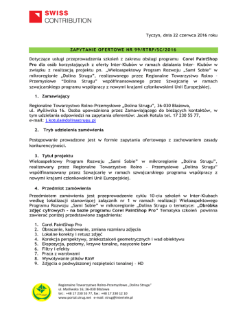 Tyczyn, dnia 22 czerwca 2016 roku ZAPYTANIE OFERTOWE NR 99/RTRP/SC/2016 Dotyczące usługi przeprowadzenia szkoleń z zakresu obsługi programu Corel PaintShop Pro dla osób korzystających z oferty Inter-Klubów w ramach działania Inter- Klubów w związku z realizacją projektu pn. „Wieloaspektowy Program Rozwoju „Sami Sobie” w mikroregionie „Dolina Strugu”, realizowanego przez Regionalne Towarzystwo Rolno – Przemysłowe “Dolina Strugu” współfinansowanego przez Szwajcarię w ramach szwajcarskiego programu współpracy z nowymi krajami członkowskimi Unii Europejskiej. 1. Zamawiający Regionalne Towarzystwo Rolno–Przemysłowe „Dolina Strugu”, 36-030 Błażowa, ul. Myśliwska 16. Osoba upoważniona przez Zamawiającego do bieżących kontaktów, w tym udzielania odpowiedzi na zapytania oferentów: Jacek Kotula tel. 17 230 55 77, e-mail: [email protected] 2. Tryb udzielenia zamówienia Postępowanie prowadzone jest w formie zapytania ofertowego z zachowaniem zasady konkurencyjności. 3. Tytuł projektu Wieloaspektowy Program Rozwoju „Sami Sobie” w mikroregionie „Dolina Strugu”, realizowany przez Regionalne Towarzystwo Rolno – Przemysłowe „Dolina Strugu” współfinansowany przez Szwajcarię w ramach szwajcarskiego programu współpracy z nowymi krajami członkowskimi Unii Europejskiej. 4. Przedmiot zamówienia Przedmiotem zamówienia jest przeprowadzenie cyklu 10-ciu szkoleń w Inter-Klubach według lokalizacji stanowiącej załącznik nr 1 w ramach realizacji Wieloaspektowego Programu Rozwoju „Sami Sobie” w mikroregionie „Dolina Strugu o tematyce: „Obróbka zdjęć cyfrowych – na bazie programu Corel PaintShop Pro” Tematyka szkoleń powinna zawierać poniżej przedstawione zagadnienia: 1. 2. 3. 4. 5. 6. 7. 8. 9. Corel PaintShop Pro Obracanie, kadrowanie, zmiana rozmiaru zdjęcia Lokalne korekty i retusz zdjęć Korekcja perspektywy, zniekształceń geometrycznych i wad obiektywu Ekspozycja, poziomy, krzywe tonalne, nasycenie barw Filtry i efekty Praca z warstwami Wywoływanie plików RAW Zdjęcia o podwyższonej rozpiętości tonalnej – HD DOLINA S TR UGU Regionalne Towarzystwo Rolno-Przemysłowe „Dolina Strugu” ul. Myśliwska 16; 36-030 Błażowa tel.: +48 17 230 55 77, fax : +48 17 230 12 10 www.portal.strug.net e-mail: [email protected] 5. Szczegółowe warunki szkoleń w poszczególnym Inter-Klubie: Łączna liczba godzin przewidziana na szkolenie : 16 godzin. Wymiar dzienny szkoleń : czterogodzinne zajęcia teoretyczno praktyczne Przebieg szkolenia powinien być udokumentowany w formie dziennika zajęć zawierającego: daty, wymiar godzin i tematy zajęć, listy obecności na kursie, potwierdzenia przez uczestników otrzymania materiałów . Termin zakończenia szkoleń 30 września 2016r. O udzielenie zamówienia mogą ubiegać się osoby fizyczne , które spełniają następujące warunki: posiadają niezbędną wiedzę i doświadczenie w przedmiocie opisanego zamówienia, (Wymóg ten będzie weryfikowany przez Zamawiającego na podstawie dołączonej kserokopii dyplomu ukończenia studiów wyższych w zakresie informatyki ) posiadają umiejętność pracy w zespole, wysokie umiejętności komunikacyjne , wykazują obowiązkowość i rzetelność. Oraz osoby prawne, które spełniają następujące warunki: Dysponują pracownikami, którzy: posiadają niezbędną wiedzę i doświadczenie w przedmiocie opisanego zamówienia, (Wymóg ten będzie weryfikowany przez Zamawiającego na podstawie dołączonej kserokopii dyplomu ukończenia studiów wyższych w zakresie informatyki) posiadają umiejętność pracy w zespole, wysokie umiejętności komunikacyjne, wykazują obowiązkowość i rzetelność. 6. Kryteria oceny oferty: Przy ocenie oferty brane pod uwagę będą następujące elementy: • spełnianie wymienionych kryteriów formalnych, na podstawie oświadczenia • przedstawiona oferta cenowa. Proponowana przez Oferenta kwota (brutto) powinna zawierać wszelkie koszty związane z: powieleniem materiałów dydaktycznych otrzymanych od zamawiającego przeprowadzeniem szkoleń 7. Sposób przygotowania oferty 1. Oferent ma prawo złożyć tylko jedną ofertę 2. Oferta powinna mieć formę pisemną i być napisana w języku polskim na maszynie do pisania, komputerze lub inną trwałą i czytelną techniką oraz podpisana(własnoręczny podpis) DOLINA S TR UGU Regionalne Towarzystwo Rolno-Przemysłowe „Dolina Strugu” ul. Myśliwska 16; 36-030 Błażowa tel.: +48 17 230 55 77, fax : +48 17 230 12 10 www.portal.strug.net e-mail: [email protected] 3. Składający ofertę musi przedłożyć: wypełniony formularz ofertowy (według wzoru stanowiącego załącznik nr 2 lub nr 3 do niniejszego zapytania ofertowego) podpisaną klauzulę antykorupcyjną (Załącznik nr 4) podpisane oświadczenie oferenta o spełnianiu warunków (według wzoru stanowiacego załącznik nr 5 do niniejszego zapytania ofertowego) parafowany wzór umowy (Załącznik nr 6) kserokopie dyplomu ukończenia studiów wyższych informatycznych odpis KRS lub inny dokument rejestrowy (dotyczy osób prawnych) 4. Sposób i termin składania ofert Pisemne oferty prosimy przesyłać lub dostarczyć do siedziby Biura Projektu w Tyczynie, ul. Kościuszki 8, 36-020 Tyczyn w terminie do dnia 1 lipca 2016 r. do godziny 10:00 z dopiskiem KONKURS nr 99/RTRP/SC/2016 5. Informacje dotyczące wyboru najkorzystniejszej oferty O wyborze najkorzystniejszej oferty Zamawiający zawiadomi osobę, której oferta została wybrana w terminie do 7 dni roboczych od ostatniego dnia, w którym mija termin przyjmowania ofert. Zamawiający zastrzega sobie prawo do odstąpienia od zawarcia umowy z ważnych przyczyn, w szczególności w przypadku gdy najkorzystniejsza oferta przekracza kwotę zaplanowaną przez Zamawiającego na sfinansowanie niniejszego zamówienia. W sytuacji gdy cena oferty przekroczy kwotę, którą zamawiający zamierza przeznaczyć na realizację zamówienia Zamawiają