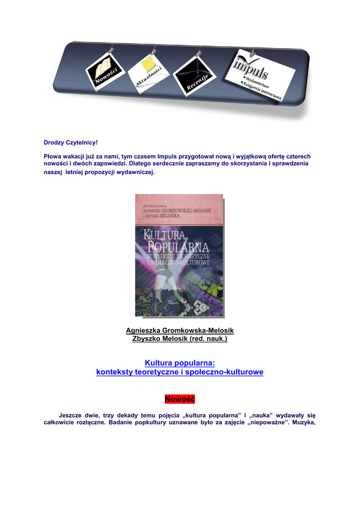 Drodzy Czytelnicy! Płowa wakacji już za nami, tym czasem Impuls przygotował nową i wyjątkową ofertę czterech nowości i dwóch zapowiedzi. Dlatego serdecznie zapraszamy do skorzystania i sprawdzenia naszej letniej propozycji wydawniczej. Agnieszka Gromkowska-Melosik Zbyszko Melosik (red. nauk.) Kultura popularna: konteksty teoretyczne i społeczno-kulturowe Nowość Jeszcze dwie, trzy dekady temu pojęcia „kultura popularna” i „nauka” wydawały się całkowicie rozłączne. Badanie popkultury uznawane było za zajęcie „niepoważne”. Muzyka, moda, reklama, mydlane opery, bohaterowie gier komputerowych itp. – wszystko to zdawało się mało istotne w porównaniu z polityką, ekonomią, filozofią czy kulturą wysoką (której symbolami mogą być muzyka Beethovena czy dramaty Szekspira). Dziś sytuacja wygląda zupełnie inaczej. Przechadzając się po największych księgarniach Waszyngtonu czy Londynu, ma się niekiedy wrażenie, że amerykańska i brytyjska wiedza o społeczeństwie została zdominowana przez zagadnienia związane z popkulturą. Ileż to książek napisano o lalce Barbie! Ileż monografii doczekała się amerykańska piosenkarka Madonna! Na półkach księgarskich dzieła poświęcone tym „pop-super-bohaterom” zdają się wypierać klasyczne interpretacje dzieł Dostojewskiego czy Zoli. Również w Polsce rośnie zainteresowanie popkulturą – także w kontekście naukowym (w ostatnim okresie pojawiła się duża liczba publikacji poświęconych różnym poptendencjom czy popzjawiskom). Książka, którą oddajemy do rąk Czytelników, wpisuje się więc w „popularną” tendencję we współczesnych naukach o kulturze i edukacji. Będzie stanowić – jak wierzymy – interesujący „przypis” do dyskusji na temat współczesnych konstrukcji tożsamości w kontekście ich swoistej „popkulturyzacji”... czytaj więcej Agnieszka Gromkowska-Melosik Zbyszko Melosik Fragment książki Spis treści ...................................................................................................... Polecamy kolejne nowości i zapowiedzi wydawnicze w Impulsie: Wanda Baranowska Nauczyciel a uczeń z ADHD Nowość Choć ADHD jest najczęściej rozpoznawanym zaburzeniem rozwojowym u dzieci i młodzieży, to trudno odnaleźć w literaturze ślady analiz funkcjonowania ucznia z tym zaburzeniem, na tle zewnętrznych czynników środowiskowych. Skupianie uwagi na istocie ograniczeń dziecka podtrzymuje stereotypowe ocenianie go, jako „nieprzystosowanego społecznie”, z jednoczesnym przypisywaniem mu intencjonalności działania... czytaj więcej Fragment książki Joanna Święcicka Chowanna - (Myśli wybrane) Nowość Wychodząc naprzeciw tym brakom, zwłaszcza problemowi rewitalizacji styku historii myśli pedagogicznej i najnowszych teorii pedagogicznych, z niezgodą na codzienność funkcjonowania zamkniętych enklaw historyków i teoretyków, ale z odpowiedzialnością docenienia potrzeby spajania własnych myśli z myślami klasyków, przyjmując, że rozumienie jest sposobem istnienia, przedstawiam Czytelnikowi wrażliwemu na kontakt z dziedzictwem kulturowym tę garść myśli klasyka i jego komentatorów.[…] ... czytaj więcej Fragment książki Alicja Szerląg (Edited by) Health in pedagogical discourses and school practices Nowość The issue of health constitutes a crucial element of reflections over both human condition and contemporary world. It significantly embraces the axiological spheres of meanings, with regard to which the individual does not only carry out the process of self identity, but also determines life priorities which accomplishment requires social engagement. In consequence, the category of health manifest itself in various spheres- subjective, social, cultural, civic, economic or last but not least – educational ...czytaj więcej Spis treści Agata Kowgier Życie intymno-emocjonalne osób starszych Nowość Niniejsza książka jest poświęcona problematyce starości, przede wszystkim życiu intymno-emocjonalnemu osób starszych. Inspiracją do podjęcia tego tematu był jeden z kursów z programu studiów pedagogicznych. Uczestnictwo w tych zajęciach uświadomiło mi istnienie pewnych sfer życia seniorów...czytaj więcej Fragment książki Daria Hejwosz Witold Jakubowski Kultura popularna - tożsamość - edukacja Zapowiedź Opracowanie, które oddajemy do rąk Czytelników, jest interdyscyplinarnym studium nad zjawiskami zachodzącymi w kulturze współczesnej. Zawiera ono artykuły badaczy z różnych ośrodków akademickich, których zainteresowania skupiają się na refleksji nad kulturą popularną i jej edukacyjnymi kontekstami...czytaj więcej Fragment książki Powiadom mnie o dostępności książki Oficyna Wydawnicza Impuls ul. Fatimska 53 B 31-831 Kraków telefax: 12 422 41 80, 422 59 47 Zapraszamy również do pobierania nowego katalogu 2010!