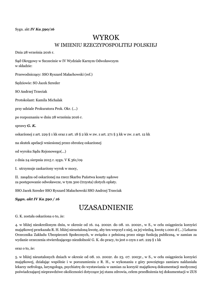 Sygn. akt IV Ka 590/16 WYROK W IMIENIU RZECZYPOSPOLITEJ POLSKIEJ Dnia 28 września 2016 r. Sąd Okręgowy w Szczecinie w IV Wydziale Karnym Odwoławczym w składzie: Przewodniczący: SSO Ryszard Małachowski (ref.) Sędziowie: SO Jacek Szreder SO Andrzej Trzeciak Protokolant: Kamila Michalak przy udziale Prokuratora Prok. Okr. (...) po rozpoznaniu w dniu 28 września 2016 r. sprawy G. K. oskarżonej z art. 229 § 1 kk oraz z art. 18 § 2 kk w zw. z art. 271 § 3 kk w zw. z art. 12 kk na skutek apelacji wniesionej przez obrońcę oskarżonej od wyroku Sądu Rejonowego(...) z dnia 24 sierpnia 2015 r. sygn. V K 361/09 I. utrzymuje zaskarżony wyrok w mocy, II. zasądza od oskarżonej na rzecz Skarbu Państwa koszty sądowe za postępowanie odwoławcze, w tym 300 (trzysta) złotych opłaty. SSO Jacek Szreder SSO Ryszard Małachowski SSO Andrzej Trzeciak Sygn. akt IV Ka 590 / 16 UZASADNIENIE G. K. została oskarżona o to, że: 4. w bliżej nieokreślonym dniu, w okresie od 16. 04. 2002r. do 08. 10. 2002r., w S., w celu osiągniecia korzyści majątkowej przekazała R. H. bliżej nieustaloną kwotę, aby ten wręczył z niej, za jej wiedzą, kwotę 1.000 zł (...) Lekarza Orzecznika Zakładu Ubezpieczeń Społecznych, w związku z pełnioną przez niego funkcją publiczną, w zamian za wydanie orzeczenia stwierdzającego niezdolność G. K. do pracy, to jest o czyn z art. 229 § 1 kk oraz o to, że: 5. w bliżej nieustalonych dniach w okresie od 08. 10. 2002r. do 23. 07. 2003r., w S., w celu osiągniecia korzyści majątkowej, działając wspólnie i w porozumieniu z R. H., w wykonaniu z góry powziętego zamiaru nakłaniała lekarzy nefrologa, laryngologa, psychiatrę do wystawiania w zamian za korzyść majątkową dokumentacji medycznej poświadczającej nieprawdziwe okoliczności dotyczące jej stanu zdrowia, celem przedłożenia tej dokumentacji w ZUS oraz w (...) do Spraw Orzekania o Niepełnosprawności, to jest o czyn z art. 18 § 2 kk w zw. z art. 271 § 3 kk w zw. z art. 12 kk. Sąd Rejonowy (...) wyrokiem z dnia 24 sierpnia 2015r., sygn. akt V K 361 / 09, uznał oskarżoną G. K. za winną popełnienia zarzuconych jej czynów wskazanych w punktach czwartym i piątym części wstępnej wyroku i za te przestępstwa wymierzył jej kary: - za czyn wskazany w punkcie czwartym zarzutu, na podstawie art. 229 § 1 kk w zw. z art. 37a kk, grzywnę w wymiarze 200 stawek dziennych po 10 zł każda stawka, - za czyn wskazany w punkcie piątym zarzutu, na podstawie art. 19 § 1 kk w zw. z art. 271 § 3 kk w zw. z art. 37a kk, grzywnę w wymiarze 200 stawek dziennych po 10 zł każda stawka. Na podstawie art. 85 § 1 kk, art. 86 § 1 i 2 kk, połączył kary grzywny wymierzone oskarżonej G. K. i wymierzył jej karę łączną grzywny w wymiarze 300 stawek dziennych po 10 zł każda stawka. Na podstawie art. 627 kpk, art. 633 kpk, art. 2 ust. 4, art. 3 ust. 1 ustawy z dnia 23 czerwca 1973r. o opłatach w sprawach karnych ( Dz. U. z 1983r., nr 49, poz. 223 ze zm.) zasądził od oskarżonej G. K. na rzecz S. Państwa koszty sądowe związane z jej udziałem w sprawie oraz wymierzył jej opłatę w wysokości 300 zł. Apelację od powyższego wyroku wniósł obrońca oskarżonej G. K.. Zaskarżonemu w części odnoszącej się do G. K. wyrokowi zarzucił: 1. błąd w ustaleniach faktycznych przyjętych za podstawę wyroku, a polegający na stwierdzeniu, że G. K.: a) przekazała pieniądze R. H., aby ten wręczył za jej wiedzą kwotę 1.000 zł (...) Lekarza Orzecznika Zakładu Ubezpieczeń Społecznych w zamian za wydanie orzeczenia stwierdzającego jej niezdolność do pracy; b) działając wspólnie i w porozumieniu z R. H., w wykonaniu z góry powziętego zamiaru, nakłaniała lekarzy nefrologa, laryngologa, psychiatrę do wystawienia w zamian za korzyść majątkową dokumentacji medycznej poświadczającej nieprawdziwe okoliczności dotyczące jej stanu zdrowia celem przedłożenia w Zakładzie Ubezpieczeń Społecznych i w (...) do Spraw Orzekania o Niepełnosprawności, podczas gdy w rzeczywistości R. H., poproszony przez wspólnego znajomego o udzielenie pomocy oskarżonej, jako osobie faktycznie chorej, wskazał jej lekarzy specjalności odpowiadających jej schorzeniom, przy czym za prywatne wizyty u tych lekarzy G. K. uiszczała opłatę zgodnie ze wskazaną przez nich ceną, zaś sporządzona podczas tych wizyt dokumentacja lekarska odpowiadała jej ówczesnemu stanowi zdrowia, a jedyną kwotą jaką G. K. przekazała R. H. (oprócz wspólnych rozliczeń związanych z ich konkubinatem) było 1.000 zł w zamian za zaoferowaną przez niego pomoc w zakresie załatwienia mieszkania komunalnego dla syna D. K., do czego jednak nie doszło; 2. obrazę przepisów postępowania, a w szczególności art. 7 kpk, poprzez przekroczenie granic swobodnej oceny dowodów w zakresie oceny zeznań R. H. polegające na daniu im wiary, podczas gdy zeznania te od początku były niespójne, niekonsekwentne i zawierały wiele sprzeczności, przy jednoczesnym braku jakichkolwiek innych dowodów korespondujących z jego zeznaniami, zaś oskarżona G. K. konsekwentnie nie przyznawała się do popełnienia zarzucanych jej czynów, zaś brak jest jakichkolwiek innych dowodów w tym zakresie. Stawiając powyższe zarzuty obrońca wniósł o uniewinnienie G. K. od popełnienia zarzuconych jej czynów. Sąd Okręgowy zważył, co następuje: Apelacja obrońcy oskarżonej okazała się niezasadna. W przedmiotowej sprawie skarżący błędów w ustaleniach faktycznych, skutkujących - jego zdaniem - niezasadnym przypisaniem G. K. sprawstwa obydwu zarzuconych jej czynów upatruje w wadliwie ocenionym przez Sąd Rejonowy materiale dowodowym, głównie poprzez danie wiary zeznaniom ( oraz wyjaśnieniom ) R. H., a odmówienie wiarygodności wyjaśnieniom oskarżonej. W pierwszej kolejności przypomnieć jednak należy, iż zarzut błędu w ustaleniach faktycznych może zostać postawiony z powodu niepełności postępow