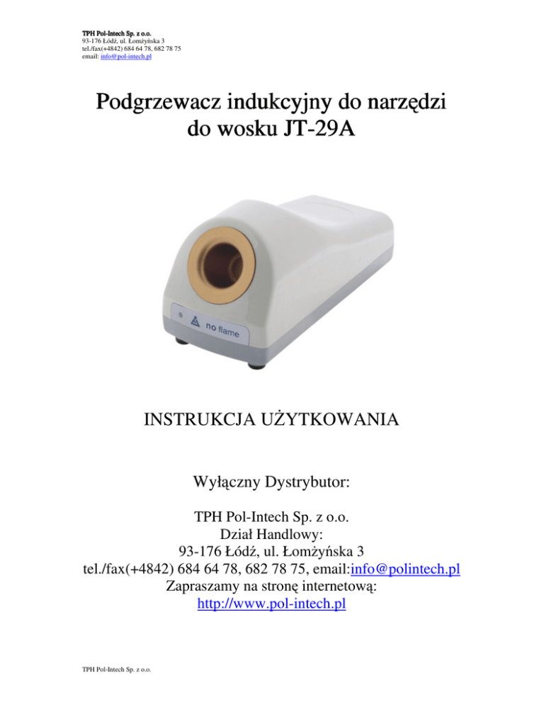 TPH PolPol-Intech Sp. z o.o. 93-176 Łódź, ul. ŁomŜyńska 3 tel./fax(+4842) 684 64 78, 682 78 75 email: [email protected] Podgrzewacz indukcyjny do narzę narzędzi do wosku JTJT-29A INSTRUKCJA UśYTKOWANIA Wyłączny Dystrybutor: TPH Pol-Intech Sp. z o.o. Dział Handlowy: 93-176 Łódź, ul. ŁomŜyńska 3 tel./fax(+4842) 684 64 78, 682 78 75, email:[email protected] Zapraszamy na stronę internetową: http://www.pol-intech.pl TPH Pol-Intech Sp. z o.o. TPH PolPol-Intech Sp. z o.o. 93-176 Łódź, ul. ŁomŜyńska 3 tel./fax(+4842) 684 64 78, 682 78 75 email: [email protected] Spis Treści: 1. BEZPIECZEŃSTWO .........................................................................................................1 2. Zawartość opakowania .......................................................................................................2 3. Konstrukcja i działanie .......................................................................................................2 4. Przeznaczenie i cechy .........................................................................................................2 5. Parametry techniczne..........................................................................................................2 6. Wymagania dotyczące temperatury i wilgotności: ..............................................................3 7. MontaŜ i instalacja..............................................................................................................3 8. Praca. .................................................................................................................................4 9. Uwagi.................................................................................................................................4 10. Konserwacja .....................................................................................................................4 11. Problemy i ich rozwiązywanie ..........................................................................................5 12. Gwarancja ........................................................................................................................5 1. BEZPIECZEŃ BEZPIECZEŃSTWO Dokładnie przeczytaj tę instrukcję przed montaŜem, instalacją i uruchomieniem urządzenia ! Jak przy wszystkich urządzeniach technicznych, prawidłowe i bezpieczne działanie urządzenia zaleŜy w duŜym stopniu od tego, by uŜytkownik zapoznał się i stosował zasady bezpiecznej pracy, przedstawione w niniejszej instrukcji. Urządzenie nie powinno być uŜywane w środowisku zawierającym palne środki znieczulające, lub duŜą ilość tlenu, lub tlenek azotu. Urządzenia nie naleŜy samodzielnie rozkręcać, wewnątrz nie ma Ŝadnych części, które uŜytkownik mógłby samodzielnie naprawić. Samodzielne rozbieranie i modyfikacja urządzenia grozi poraŜeniem, oraz spowoduje utratę gwarancji. Nie wolno uŜywać przewodu sieciowego, jeŜeli jest on uszkodzony. Nie wolno odłączać wtyczki mokrymi rękami. Nie wolno uŜywać urządzenia, jeŜeli zostało zamoczone czy zalane. W takim przypadku naleŜy je bezzwłocznie odłączyć od zasilania. Nigdy nie dotykaj przewodu elektrycznego, nie podłączaj i nie odłączaj urządzenia do sieci zasilającej mokrymi rękami!. Przed przystąpieniem do czyszczenia urządzenia, wymiany wiertła oraz innych prac, nie związanych z codzienną obsługą, odłącz je od sieci zasilającej. Urządzenie w czasie swojej pracy generuje ciepło. Nigdy nie zasłaniaj otworów wentylacyjnych, ani nie stawiaj urządzenia na miękkim podłoŜu, które mogłoby zasłonić otwory. TPH Pol-Intech Sp. z o.o. 1 TPH PolPol-Intech Sp. z o.o. 93-176 Łódź, ul. ŁomŜyńska 3 tel./fax(+4842) 684 64 78, 682 78 75 email: [email protected] 2. Zawartość Zawartość opakowania Element Nazwa Specyfikacja Ilość 1 Podgrzewacz 1 2 Przewód zasilający 1 3 Instrukcja uŜytkownika 1 3. Konstrukcja i działanie Urządzenie słuŜy do podgrzewania metalowych noŜyków do wosku. Wewnątrz obudowy znajduje się cewka i generator, słuŜące do generowani pola szybkozmiennego magnetycznego. Kiedy umieszczamy metalowy przedmiot w zagłębieniu, w szybkozmiennym polu magnetycznym, generowane są w nim prądy wirowe, których przepływ w całej objętości noŜyka szybko go nagrzewa. Zjawisko powstawania prądów wirowych jest szeroko stosowane, od urządzeń domowych, takich jak kuchenki indukcyjne, liczniki zuŜycia energii elektrycznej, poprzez hamulce zjazdowe w autokarach, do zastosowań przemysłowych, takich jak piece indukcyjne do topienia metali w hutach, hartowanie i zgrzewanie indukcyjne części metalowych. Zjawisko indukcji elektromagnetycznej pozwala nagrzewać elementy metalowe szybko i łatwo, bez stosowania dodatkowych grzałek, przy mniejszym zuŜyciu energii, a przede wszystkim bez konieczności uŜycia otwartego płomienia. 4. Przeznaczenie i cechy Urządzenie przeznaczone jest do uŜytkowania przez profesjonalnego protetyka i słuŜy do nagrzewania metalowych narzędzi do opracowywania modeli woskowych. 5. Parametry techniczne • Napięcie zasilania 230 V, 50 Hz • Moc 130 W Tryb pracy praca ciągłą • Klasa urządzenia • Zakaz uŜywania: urządzenie KLASY II o środowisko zawierające palne środki znieczulające o środowisko zawierające duŜą ilość tlenu o środowisko zawierające tlenek azotu TPH Pol-Intech Sp. z o.o. 2 TPH PolPol-Intech Sp. z o.o. 93-176 Łódź, ul. ŁomŜyńska 3 tel./fax(+4842) 684 64 78, 682 78 75 email: [email protected] 6. Wymagania dotyczą dotyczące temperatury i wilgotnoś wilgotności: • Temperatura pracy: od 5ºC do 40 ºC • Wilgotność względna: ≤ 80% • Ciśnienie Atmosferyczne: od 86kPa do 106 kPa 7. MontaŜ MontaŜ i instalacja Szanowni Państwo, Przygotowanie urządzenia do pracy polega na rozpakowaniu opakowania transportowego, ustawieniu urządzenia na równej, płaskiej powierzchni, gdzie nie będzie naraŜone na wstrz