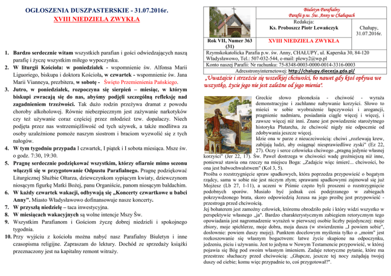 OGŁOSZENIA DUSZPASTERSKIE - 31.07.2016r. XVIII NIEDZIELA ZWYKŁA 1. Bardzo serdecznie witam wszystkich parafian i gości odwiedzających naszą parafię i życzę wszystkim miłego wypoczynku. 2. W liturgii Kościoła: w poniedziałek - wspomnienie św. Alfonsa Marii Liguoriego, biskupa i doktora Kościoła, w czwartek - wspomnienie św. Jana Marii Vianneya, prezbitera, w sobotę - Święto Przemienienia Pańskiego. 3. Jutro, w poniedziałek, rozpoczyna się sierpień – miesiąc, w którym biskupi zwracają się do nas, abyśmy podjęli szczególną refleksję nad zagadnieniem trzeźwości. Tak dużo rodzin przeżywa dramat z powodu choroby alkoholowej. Równie niebezpiecznym jest zażywanie narkotyków czy też używanie coraz częściej przez młodzież tzw. dopalaczy. Niech podjęta przez nas wstrzemięźliwość od tych używek, a także modlitwa za osoby uzależnione pomoże naszym siostrom i braciom wyzwolić się z tych nałogów. 4. W tym tygodniu przypada I czwartek, I piątek i I sobota miesiąca. Msze św. o godz. 7:30, 19:30. 5. Pragnę serdecznie podziękować wszystkim, którzy ofiarnie mimo sezonu włączyli się w przygotowanie Odpustu Parafialnego. Pragnę podziękować Liturgicznej Służbie Ołtarza, dziewczynkom sypiącym kwiaty, dziewczynom niosącym figurkę Matki Bożej, panu Organiście, panom niosącym baldachim. 6. W każdy czwartek wakacji, odbywają się „Koncerty czwartkowe u babci Anny”. Miasto Władysławowo dofinansowuje nasze koncerty. 7. W przyszłą niedzielę – taca inwestycyjna. 8. W miesiącach wakacyjnych są wolne intencje Mszy Św. 9. Wszystkim Parafianom i Gościom życzę dobrej niedzieli i spokojnego tygodnia. 10. Przy wyjściu z kościoła można nabyć nasz Parafialny Biuletyn i inne czasopisma religijne. Zapraszam do lektury. Dochód ze sprzedaży książki przeznaczony jest na kapitalny remont witraży. Biuletyn Parafialny Parafii p.w. Św. Anny w Chałupach Redakcja: Ks. Proboszcz Piotr Lewańczyk Chałupy, 31.07.2016r. Rok VII, Numer 363 XVIII NIEDZIELA ZWYKŁA (31) Rzymskokatolicka Parafia p.w. św. Anny, CHAŁUPY, ul. Kaperska 30, 84-120 Władysławowo, Tel.: 507-032-544, e-mail: [email protected] Konto naszej Parafii: Nr rachunku: 75-8348-0003-0000-0014-3316-0003 Adresstronyinternetowej: http://chalupy.diecezja.gda.pl/ „Uważajcie i strzeżcie się wszelkiej chciwości, bo nawet gdy ktoś opływa we wszystko, życie jego nie jest zależne od jego mienia". Greckie słowo pleoneksia - chciwość - wyraża demonstracyjne i zachłanne nabywanie korzyści. Słowo to mieści w sobie wyobrażenie łapczywości i arogancji, pragnienie nadmiaru, posiadania ciągle więcej i więcej, i zawsze więcej niż inni. Znane jest powiedzenie starożytnego historyka Plutarcha, że chciwość nigdy nie odpocznie od zdobywania jeszcze więcej. Idzie ona w parze z nieuczciwością: chciwi „rozlewają krew, zabijają ludzi, aby osiągnąć niesprawiedliwe zyski" (Ez 22, 27). Oczy i serce człowieka chciwego „pragną jedynie własnej korzyści" (Jer 22, 17). Św. Paweł dostrzega w chciwości wadę groźniejszą niż inne, ponieważ stawia ona rzeczy na miejscu Boga: „Zadajcie więc śmierć... chciwości, bo ona jest bałwochwalstwem" (Kol 3, 5). Prośba o rozstrzygnięcie spraw spadkowych, która poprzedza przypowieść o bogatym rządcy, sama w sobie nie jest niczym złym; sprawami spadkowymi zajmował się już Mojżesz (Lb 27, 1-11), a uczeni w Piśmie często byli proszeni o rozstrzygnięcie podobnych sporów. Musiało być jednak coś podejrzanego w zabiegach pokrzywdzonego brata, skoro odpowiedzią Jezusa na jego prośbę jest przypowieść przestroga przed chciwością. Jej bohaterem jest zamożny człowiek, któremu obrodziło pole i który widzi wszystko w perspektywie własnego „ja". Bardzo charakterystycznym zabiegiem retorycznym tego opowiadania jest nagromadzenie wyrażeń w pierwszej osobie liczby pojedynczej: moje zbiory, moje spichlerze, moje dobra, moja dusza (w stwierdzeniu „I powiem sobie", dosłownie: powiem duszy mojej). Punktem docelowym myślenia tylko o „moim" jest rozkoszowanie się własnym bogactwem: łatwe życie skupione na odpoczynku, jedzeniu, piciu i używaniu. Jest to jedyna w Nowym Testamencie przypowieść, w której pojawia się Bóg pod swoim własnym imieniem. Zadaje retoryczne pytanie, które ma przestrzec słuchaczy przed chciwością: „Głupcze, jeszcze tej nocy zażądają twojej duszy od ciebie; komu więc przypadnie to, coś przygotował?". Święty Alfons Maria Liguori,biskup i doktor Kościoła Alfons Maria urodził się 27 września 1696 r. w Marinelli pod Neapolem, w zamożnej rodzinie szlacheckiej. W dwa dni potem otrzymał chrzest. Gdy ukończył szkołę podstawową, został wysłany na studia prawnicze na uniwersytet w Neapolu. Miał wtedy zaledwie 12 lat (1708). Kiedy miał zaledwie 17 lat, był już doktorem obojga praw. Ojciec planował Alfonsowi odpowiednie małżeństwo. Wybrał mu nawet córkę księcia, Teresinę. Ta jednak wstąpiła do zakonu i niebawem zmarła. Alfons po kilku latach praktyki adwokackiej, zniechęcony przekupstwem w sądownictwie, ku niezadowoleniu ojca postanowił spełnić swoje marzenia. Przed obrazem Matki Bożej w Porta Alba złożył swoją szpadę i rozpoczął studia teologiczne (1723). Po 4 latach studiów Alfons przyjął święcenia kapłańskie (1727). Miał wówczas 31 lat. Pragnąc życia doskonalszego, marzył o zakonie. Zamierzał najpierw wstąpić do teatynów, potem do filipinów albo do jakiejś kongregacji misyjnej. Nie mógł się jednak zdecydować. Zasłynął też jako doskonały kaznodzieja. Po trzech latach nadludzkiej pracy musiał udać się na wypoczynek do Amalfi. Nie przestał tam jednak pracować. Zetknął się z rodziną Sióstr Nawiedzenia. Zajął się nimi i przekształcił je na Kongregację Zbawiciela. Był to młody zakon kontemplacyjny. Alfons zauważył, że tamtejsi górale nie mają dostatecznej opieki duszpast