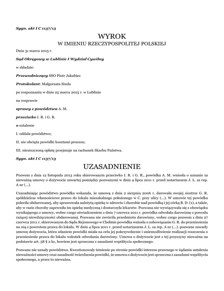 Sygn. akt I C 1137/13 WYROK W IMIENIU RZECZYPOSPOLITEJ POLSKIEJ Dnia 31 marca 2015 r. Sąd Okręgowy w Lublinie I Wydział Cywilny w składzie: Przewodniczący SSO Piotr Jakubiec Protokolant: Małgorzata Siuda po rozpoznaniu w dniu 25 marca 2015 r. w Lublinie na rozprawie sprawy z powództwa A. M. przeciwko I. R. i G. R. o ustalenie I. oddala powództwo; II. nie obciąża powódki kosztami procesu; III. nieuiszczoną opłatę przejmuje na rachunek Skarbu Państwa. Sygn. akt I C 1137/13 UZASADNIENIE Pozwem z dnia 12 listopada 2013 roku skierowanym przeciwko I. R. i G. R., powódka A. M. wniosła o uznanie za nieważną umowy o dożywocie zawartej pomiędzy pozwanymi w dniu 4 lipca 2011 r. przed notariuszem J. L. za rep. A nr (...). Uzasadniając powództwo powódka wskazała, że umową z dnia 2 sierpnia 2006 r. darowała swojej siostrze G. R. spółdzielcze własnościowe prawo do lokalu mieszkalnego położonego w C. przy ulicy (...). W umowie tej powódka poleciła obdarowanej, aby sprawowała należytą opiekę w zdrowiu i chorobie nad powódką i jej córką B. D. (1), a także, aby w razie choroby zapewniła im opiekę medyczną i dostarczyła lekarstw. Pozwana nie wywiązywała się z obowiązku wynikającego z umowy, wobec czego oświadczeniem z dnia 7 czerwca 2011 r. powódka odwołała darowiznę z powodu rażącej niewdzięczności obdarowanej. Pozwana nie zwróciła przedmiotu darowizny, wobec czego pozwem z dnia 27 czerwca 2011 r. skierowanym do Sądu Rejonowego w Chełmie powódka wniosła o zobowiązanie G. R. do przeniesienia na nią z powrotem prawa do lokalu. W dniu 4 lipca 2011 r. przed notariuszem J. L. za rep. A nr (...). pozwane zawarły umowę dożywocia, która zdaniem powódki miała na celu jej pokrzywdzenie i uniemożliwienie realizacji roszczenia o przeniesienie prawa do lokalu wskutek odwołania darowizny. Umowa o dożywocie jest z tej przyczyny nieważna na podstawie art. 58 § 2 kc, bowiem jest sprzeczna z zasadami współżycia społecznego. Pozwane nie uznały powództwa. Kwestionowały istnienie po stronie powódki interesu prawnego w żądaniu ustalenia nieważności umowy oraz zasadność twierdzenia powódki, że umowa o dożywocie jest sprzeczna z zasadami współżycia społecznego, a przez to nieważna. Sąd Okręgowy ustalił następujący stan faktyczny: W dniu 2 sierpnia 2006 roku, pomiędzy A. M. a jej siostrą G. R. została zawarta, w formie aktu notarialnego przed notariuszem J. L. za rep A nr (...), umowa darowizny. Mocą tej umowy A. M. darowała siostrze spółdzielcze własnościowe prawo do lokalu mieszkalnego oznaczonego numerem (...), położonego w C. przy ulicy (...) w budynku oznaczonym numerem (...), zaś G. R. tę darowiznę przyjęła. Jednocześnie G. R. ustanowiła na nabytym prawie dożywotnie użytkowanie na rzecz A. M., polegające na prawie zamieszkiwania w tym lokalu. A. M. poleciła G. R., aby sprawowała należytą opiekę w zdrowiu i chorobie nad powódką i jej córką B. D. (1), a także, aby w razie choroby zapewniła im opiekę medyczną i dostarczyła lekarstw. (okoliczność bezsporna, wypis aktu notarialnego, Rep. A Nr (...), k. 7-8). Umową z dnia 23 stycznia 2008 r. (...) Spółdzielnia Mieszkaniowa w C. przeniosła na rzecz G. R. własność lokalu mieszkalnego oznaczonego numerem (...), położonego w C. przy ulicy (...) w budynku oznaczonym numerem (...) wraz z udziałem w częściach wspólnych budynków oraz innych urządzeń niesłużących do użytku właścicieli lokali. (okoliczność bezsporna, akt notarialny k. 36-41 akt I C 624/11 Sądu Okręgowego w Lublinie) Od dnia 4 września 2006 r. A. M. i jej córka B. D. (2) przebywają w Domu Pomocy Społecznej w N.. W pierwszych dwóch latach pobytu G. R. odwiedzała je. Od 2009 r. stosunki pomiędzy siostrami popsuły się i odwiedziny były sporadyczne. (pisma k. 15, 80) W dniu 13 sierpnia 2010 r. A. M. udzieliła G. R. pełnomocnictwa do zbycia nieruchomości (akt notarialny k. 184) Pismem z dnia 7 czerwca 2011 r. A. M. oświadczyła G. R., że odwołuje darowiznę z dnia 2 sierpnia 2006 r. z powodu rażącej niewdzięczności obdarowanej. Niewdzięczność ta polegała na: • uniemożliwieniu wykonywania służebności polegającej na prawie korzystania z lokalu, • niewykonaniu poleceń określonych w umowie, • braku jakiejkolwiek pomocy, • wielokrotnym wyzywaniu i ubliżaniu, • braku pomocy w sprawach związanych ze stanem zdrowia, a w szczególności wielokrotnej odmowie pomocy w wizytach lekarskich, odmowie realizowania recept, • odmowie udzielenia pomocy w zakresie zaopatrzenia w żywność i zakupy. (okoliczność bezsporna, pismo k. 14) W dniu 4 lipca 2011 roku, pomiędzy G. R. a jej córką I. R. została zawarta, w formie aktu notarialnego przed notariuszem J. L. za rep A nr (...), umowa o dożywocie. Mocą tej umowy G. R. przeniosła na I. R. własność lokalu mieszkalnego oznaczonego numerem (...), położonego w C. przy ulicy (...) w budynku oznaczonym numerem (...), dla którego to prawa Sąd Rejonowy w Chełmie prowadził księgę wieczystą nr (...), zaś I. R. w zamian przyjęła G. R. jako domownika wraz ze służebnością mieszkania w tym lokalu, zobowiązała się dostarczać jej wyżywienia, ubrania, zapewnić pomoc i pielęgnowanie w chorobie oraz sprawić pogrzeb odpowiadający zwyczajom. (okoliczność bezsporna, wypis aktu notarialnego, Rep. A Nr (...), k. 9-12). G. R. ma 70 lat i jest osobą schorowaną. Choruje na kamicę żółciową, choroby układu krążenia, dyskopatię, postać stawową boreliozy, przepuklinę, (okoliczność bezsporna, dokumentacja medyczna k. 53-58) A. M. ma 82 lata i również cierpi na wiele chorób. Córka A. M. w okresie od 19 maja do 12 czerwca 2006 r. przebywała w szpitalu. Cierpi na zespół (...). (okoliczności bezsporne) W pierwszych latach po zawarciu umowy darowizny G. R. odwiedzała siostrę i jej córkę często, dzwoniła też do siostry. Przywoziła produkty żywnościowe. 