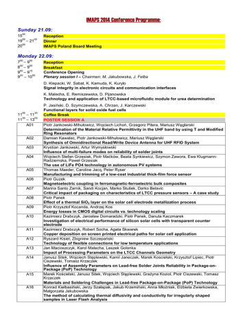 IMAPS 2014 Conference Programme: Sunday 21.09: 00 15 00 00 19 – 21 00 20 Reception Dinner IMAPS Poland Board Meeting Monday 22.09: 00 00 7 –9 00 00 8 –9 00 15 9 –9 20 50 9 – 10 Reception Breakfast Conference Opening Plenary session I – Chairmen: M. Jakubowska, J. Felba D. Klepacki, W. Sabat, K. Kamuda, K. Kuryło Signal integrity in electronic circuits and communication interfaces K. Malecha, E. Remiszewska, D. Pijanowska Technology and application of LTCC-based microfluidic module for urea determination 00 30 11 – 11 30 00 11 – 13 A01 A02 A03 A04 A05 A06 A07 A08 A09 A10 A11 A12 A13 A14 A15 A16 P. Jasiński, D. Szymczewska, A. Chrzan, J. Karczewski Functional layers for solid oxide fuel cells Coffee Break POSTER SESSION A Piotr Jankowski-Mihułowicz, Wojciech Lichoń, Grzegorz Pitera, Mariusz Węglarski Determination of the Material Relative Permittivity in the UHF band by using T and Modified Ring Resonators Damian Kawalec, Piotr Jankowski-Mihułowicz, Mariusz Węglarski Synthesis of Omnidirectional Read/Write Device Antenna for UHF RFID System Krystian Jankowski, Artur Wymysłowski Influence of multi-failure modes on reliability of solder joints Wojciech Stefan Grzesiak, Piotr Maćków, Beata Synkiewicz, Szymon Zawora, Ewa KlugmannRadziemska, Paweł Grzesiak The use of LiFe PO4 technology in autonomous PV systems Thomas Maeder, Caroline Jacq, Peter Ryser Manufacturing and trimming of a low-cost industrial thick-film force sensor Piotr Guzek Magnetoelectric coupling in ferromagnetic-ferroelectric bulk composites Marina Santo Zarnik, Sandi Kocjan, Marko Stušek, Darko Belavic Critical impact of packaging on characteristics of LTCC pressure sensors – A case study Piotr Panek Effect of a thermal SiO2 layer on the solar cell electrode metallization process Piotr Krzysztof Kocanda, Andrzej Kos Energy losses in CMOS digital circuits vs. technology scaling Kazimierz Drabczyk, Jarosław Domaradzki, Piotr Panek, Danuta Kaczmarek Investigation of electrical performance of silicon solar cells with transparent counter electrode Kazimierz Drabczyk, Robert Socha, Agata Skwarek Copper deposition on screen printed electrical paths for solar cell application Ryszard Kisiel, Zbigniew Szczepański Technology of flexible connections for low temperature applications Jan Macioszczyk, Karol Malecha, Leszek Golonka Impact of Processing Parameters on the LTCC Channels Geometry Janusz Sitek, Wojciech Stęplewski, Kamil Janeczek, Marek Koscielski, Krzysztof Lipiec, Piotr Ciszewski, Tomasz Krzaczek Influence of Assembly Parameters on Lead-free Solder Joints Reliability in Package-onPackage (PoP) Technology Marek Kościelski, Janusz Sitek, Wojciech Stęplewski, Grażyna Koziol, Piotr Ciszewski, Tomasz Krzaczek Materials and Soldering Challenges in Lead-free Package-on-Package (PoP) Technology Konrad Kiełbasiński, Jerzy Szałapak, Jakub Krzemiński, Anna Młożniak, Elżbieta Zwierkowska, Małgorzata Jakubowska The method of calculating thermal diffusivity and conductivity for irregularly shaped samples in Laser Flash Analysis A17 A18 A19 A20 A21 A22 A23 A24 00 00 13 – 14 00 30 14 – 15 Jarosław Kita, Annica Brandenburg, Irina Sudina, Ralf Moos High-Temperature Miniaturized Furnace manufactured in HTCC-Technology Jerzy Kalenik, Mateusz Mroczkowski, Piotr Firek, Elżbieta Czerwosz, Jan Szmidt Deterioration of electronolumonescent lamps properties Piotr Zachariasz, Jan Kulawik, Piotr Guzdek, Marcin Sikora Synthesis, microstructure and magnetoelectric coupling of Sr3CuNb2O9-CoFe2O4 multiferroic composite Franciszek Balik, Andrzej Dziedzic Low-Temperature Properties of Thick-Film Resistors – a Comparative Study Piotr Markowski, Eugeniusz Prociów, Łukasz Urbaniak The thermoelectric parameters of thin-film germanium-based layers Adam Witold Stadler, Andrzej Kolek, Zbigniew Zawiślak, Andrzej Dziedzic, Wojciech Stęplewski Noise measurements of thin-film resistors with the use of multi-channel dual-phase virtual lock-in technique Adam Witold Stadler, Andrzej Kolek, Krzysztof Mleczko, Zawiślak Zbigniew, Andrzej Dziedzic, Wojciech Stęplewski Noise sources in polymer thick-film resistors Patryk Gwiżdż, Andrzej Brudnik, Katarzyna Zakrzewska Gas detection and recognition by thermally-induced metal oxide sensor array Lunch Plenary session II – Chairmen: L. Golonka, R. Kisiel P. Svasta Layout Design of Printed Circuits Boards – An Important Issue of the 21st Century Undergraduate Electronics Curricula M. Jakubowska Printed electronics – materials and devices 30 00 15 – 16 00 30 16 – 17 B01 B02 B03 B04 B05 B06 B07 B08 B09 B10 B11 B12 B13 W. Steplewski, A. Dziedzic, A. Kłossowicz, P. Winiarski, J. Borecki, G. Kozioł, T. Serzysko Reactance components embedded in Printed Circuit Boards Coffee Break POSTER SESSION B Marek Gotfryd, Bartosz Pawłowicz, Sebastian Twardzik Simulations of Dynamic RFID System Marek Gotfryd, Bartosz Pawłowicz Measurements of Dynamic RFID System Marek Gotfryd, Bartosz Pawłowicz Influence of Communication Protocol on Energy Consumed by RFID Tag Krzysztof Górecki, Paweł Górecki The analysis of accuracy of the selected methods of measurement of thermal resistance of IGBTs Krzysztof Górecki, Krzysztof Górski, Małgorzata Rogalska Estimation of parameters of the electrothermal model of the impulse-transformer Krzysztof Górecki, Przemysław Ptak Modelling of mutual thermal coupling in LED modules Vasyl' Yo. Stadnyk, Bohdan V. Andriyevsky, Mykola O. Romanyuk, Zenovij O. Kohut, Volodymyr M. Gaba Optical properties of D-serine doped TGS crystals as material for pyroelectric sensors Kazimierz Kuryło, Dariusz Klepacki, Wiesław Sabat, Kazimierz Kamuda Generation of higher current harmonics in electronic balasts used in fluorescent lamps Dariusz Klepacki, Wiesław Sabat, Kazimierz Kamuda, Kazimierz Kuryło Conditions of RF energy harvesting in UHF RFID systems Wiesław Sabat, Dariusz Klepacki, Kazimierz Kamuda, Kazimierz Kuryło Analysis of electromagnetic fields distr
