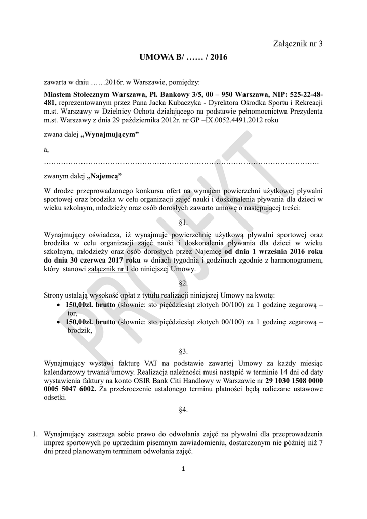 Załącznik nr 3 UMOWA B/ …… / 2016 zawarta w dniu ……2016r. w Warszawie, pomiędzy: Miastem Stołecznym Warszawa, Pl. Bankowy 3/5, 00 – 950 Warszawa, NIP: 525-22-48481, reprezentowanym przez Pana Jacka Kubaczyka - Dyrektora Ośrodka Sportu i Rekreacji m.st. Warszawy w Dzielnicy Ochota działającego na podstawie pełnomocnictwa Prezydenta m.st. Warszawy z dnia 29 października 2012r. nr GP –IX.0052.4491.2012 roku zwana dalej „Wynajmującym” a, …………………………………………………………………………………………………. zwanym dalej „Najemcą” W drodze przeprowadzonego konkursu ofert na wynajem powierzchni użytkowej pływalni sportowej oraz brodzika w celu organizacji zajęć nauki i doskonalenia pływania dla dzieci w wieku szkolnym, młodzieży oraz osób dorosłych zawarto umowę o następującej treści: §1. Wynajmujący oświadcza, iż wynajmuje powierzchnię użytkową pływalni sportowej oraz brodzika w celu organizacji zajęć nauki i doskonalenia pływania dla dzieci w wieku szkolnym, młodzieży oraz osób dorosłych przez Najemcę od dnia 1 września 2016 roku do dnia 30 czerwca 2017 roku w dniach tygodnia i godzinach zgodnie z harmonogramem, który stanowi załącznik nr 1 do niniejszej Umowy. §2. Strony ustalają wysokość opłat z tytułu realizacji niniejszej Umowy na kwotę: 150,00zł. brutto (słownie: sto pięćdziesiąt złotych 00/100) za 1 godzinę zegarową – tor, 150,00zł. brutto (słownie: sto pięćdziesiąt złotych 00/100) za 1 godzinę zegarową – brodzik, §3. Wynajmujący wystawi fakturę VAT na podstawie zawartej Umowy za każdy miesiąc kalendarzowy trwania umowy. Realizacja należności musi nastąpić w terminie 14 dni od daty wystawienia faktury na konto OSIR Bank Citi Handlowy w Warszawie nr 29 1030 1508 0000 0005 5047 6002. Za przekroczenie ustalonego terminu płatności będą naliczane ustawowe odsetki. §4. 1. Wynajmujący zastrzega sobie prawo do odwołania zajęć na pływalni dla przeprowadzenia imprez sportowych po uprzednim pisemnym zawiadomieniu, dostarczonym nie później niż 7 dni przed planowanym terminem odwołania zajęć. 1 2. Za zajęcia odwołane z winy Wynajmującego również w przypadku wykonywania napraw pływalni, czy jej zamknięcia z innych przyczyn / awarie sieci wodociągowej, elektrycznej itp./ Najemca nie będzie wnosić opłat. Wynajmujący umożliwi Najemcy odpracowanie zajęć w innym ustalonym terminie. §5. Najemca przyjmuje do wiadomości i wykonania, postanowienia dotyczące odpowiedzialności materialnej za wyrządzone szkody podczas organizowanych zajęć zawarte w regulaminie pływalni OSiR oraz zobowiązuje się do przestrzegania porządku ustalonego powyższym regulaminem stanowiącym załącznik nr 2 do niniejszej Umowy. Za szkody wyrządzone w mieniu lub na osobach uczestniczących w zajęciach w ramach niniejszej Umowy, odpowiedzialność ponosi Najemca. §6. Wynajmującemu przysługuje prawo rozwiązania Umowy bez wypowiedzenia ze skutkiem natychmiastowym w przypadku: 1. stwierdzenia nie stosowania się do regulaminu wewnętrznego OSiR, 2. zalegania z zapłatą za jeden okres płatności, 3. używa przedmiotu najmu niezgodnie z umową, 4. pojawiania się skarg ze strony klientów (dwie pisemne skargi ze strony klientów). §7. W przypadku rozwiązania Umowy z przyczyn, o których mowa w § 6 Najemca zobowiązany będzie do zapłaty kary umownej w wysokości 2 /dwóch/ miesięcznych opłat zgodnie z §2 z tytułu udostępnienia pływalni. §8. 1. Wynajmujący w trakcie trwania zajęć zapewnia kadrę ratowniczą sprawującą nadzór nad osobami korzystającymi z zajęć pod kątem bezpieczeństwa. 2. Najemca sprawuje opiekę nad uczestnikami zajęć w trakcie ich trwania poprzez zapewnienie obsługi odpowiednio wykwalifikowanych pracowników i ponosi odpowiedzialność za ich przebieg. 3. Najemca w czasie prowadzenia zajęć jest zobowiązany do pilnowania uczestników i osób im towarzyszącym w zakresie strojów pływackich w których będą przebywały na terenie niecki basenowej. 4. Najemca zobowiązuje się do nie przekraczania maksymalnej ilości osób przebywających: w brodziku – 12 osób w czasie prowadzenia zajęć, na torze – 8 osób w czasie prowadzenia zajęć. 5. Grupy zorganizowane (pływające lub uczestniczące w zajęciach) nie mogą liczyć więcej niż 15 uczestników na jedną osobę opiekującą się lub prowadzącą zajęcia (instruktora). Osoba taka jest odpowiedzialna za podopiecznych przez cały czas pobytu na terenie obiektu. 6. Najemca zobowiązuje się do zapewnienia stałej obsady instruktorskiej do prowadzenia zajęć w poszczególnych grupach. 2 §9. 1. Najemca oświadcza, iż treść niniejszej umowy, a w szczególności dotyczące go dane identyfikujące, przedmiot umowy i wysokość wynagrodzenia, stanowią informacje publiczną w rozumieniu art. 1 ust. 1 ustawy z dnia 6 września 2001 r., o dostępie do informacji publicznej (Dz. U. z 2001r. Nr 112 poz. 1198 z póź. zm.), która podlega udostępnieniu w trybie przedmiotowej ustawy , z zastrzeżeniem ust.2 (ew. i ust.3). 2. Najemca wyraża zgodę na udostępnienie w trybie ustawy, o której mowa w ust.1,zawartych w niniejszej umowie dotyczących go danych osobowych w zakresie obejmującym imię i nazwisko, a w przypadku prowadzenia działalności gospodarczej – również w zakresie firmy. §10. W sprawach nieuregulowanych niniejszą Umową mają zastosowanie przepisy Kodeksu Cywilnego. §11. Spory wynikające z niniejszej Umowy rozpatrywane będą przez Sąd właściwy dla Ośrodka Sportu i Rekreacji m. st. Warszawy w Dzielnicy Ochota. §12. Umowa zostaje sporządzona w dwóch jednobrzmiących egzemplarzach po jednym dla każdej ze stron. Wynajmujący Najemca Załączniki do umowy: 1. Harmonogram wynajmu brodzika i niecki sportowej. 2. Regulamin Pływalni OSIR Ochota. 3 ZAŁĄCZNIK NR 1 do Umowy nr B/…./2016 z dnia …….2016r. HARMONOGRAM WYNAJMU BRO