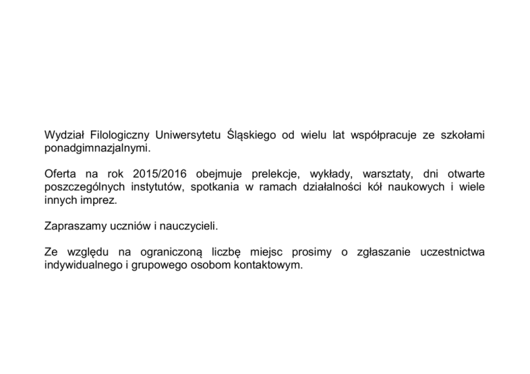 Wydział Filologiczny Uniwersytetu Śląskiego od wielu lat współpracuje ze szkołami ponadgimnazjalnymi. Oferta na rok 2015/2016 obejmuje prelekcje, wykłady, warsztaty, dni otwarte poszczególnych instytutów, spotkania w ramach działalności kół naukowych i wiele innych imprez. Zapraszamy uczniów i nauczycieli. Ze względu na ograniczoną liczbę miejsc prosimy o zgłaszanie uczestnictwa indywidualnego i grupowego osobom kontaktowym. imprezy cykliczne, organizowane przez cały rok akademicki Instytut Filologii Warsztaty dla szkół średnich „Spotkania ze współczesną Rosją” Wschodniosłowiańskiej Projekt organizowany przez Instytut Filologii Wschodniosłowiańskiej pod patronatem Stowarzyszenia Współpracy Polska-Wschód proponuje warsztaty prowadzone przez studentów Instytutu w szkołach ponadgimnazjalnych, których celem jest promowanie wiedzy na temat kultury rosyjskiej, przełamywanie stereotypów o Rosji, zachęcenie młodzieży do zdobycia wiedzy o życiu, języku i kulturze Rosjan. Program warsztatów obejmuje następujące zagadnienia: sztuka rosyjska, geografia Rosji – co warto zwiedzić w Rosji, kultura rosyjska w grach komputerowych, Rosja w Internecie, kuchnia rosyjska – wspólne gotowanie i degustacja tradycyjnych dań rosyjskich, kultura ludów rosyjskich, charakterystyczne święta rosyjskie. Warsztaty odbywać się będą cyklicznie po ustaleniu terminów ze szkołami. Szczegółowy opis warsztatów: https://prezi.com/mfgap1zkc2am/warsztaty-spotkania-z-rosja/ kontakt: dr Monika Karwacka, [email protected] Instytut Filologii Germańskiej Spotkania Koła Germanistów Kontakt: Każdy pierwszy wtorek przewodniczący Koła: Alan Rymarczyk: [email protected] miesiąca Instytut Filologii Lekcje pokazowe języków południowo- i zachodniosłowiańskich dla szkół średnich Słowiańskiej Lekcje pokazowe organizowane przez Instytut Filologii Słowiańskiej obejmują języki: bułgarski, chorwacki, czeski, macedoński, serbski, słowacki i słoweński. Zajęcia prowadzone są przez native speaker’ów – lektorów zatrudnionych w Uniwersytecie Śląskim. Celem zajęć jest promowanie wiedzy na temat języków i krajów południowo- i zachodniosłowiańskich, ich różnorodności, oraz zwrócenie uwagi na potrzebę uczenia się różnych języków obcych, nie tylko tych najbardziej popularnych, ale również rzadkich, których znajomość staje się coraz większym atutem. Lekcje odbywać się będą w terminach ustalonych ze szkołami. kontakt: dr Monika Gawlak, mail: [email protected] marzec 2016 Instytut Filologii Lekcje języka rosyjskiego dla uczniów szkół ponadgimnazjalnych z cyklu „Tego nie znajdziesz Wschodniosłowiańskiej w podręczniku” kontakt: dr Gabriela Wilk, [email protected] Instytut Filologii Słowiańskiej oraz Bieruński Ośrodek Kultury Instytut Filologii Słowiańskiej oraz 11 marca Przegląd Piosenki Chorwackiej Współpraca Instytutu Filologii Słowiańskiej z Bieruńskim Ośrodkiem Kultury. Patronat Konsula Honorowego Republiki Chorwacji, pana Pawła Włodarczyka. http://www.bok.bierun.pl/Content/PodstronaAktualnosci/GamaImprezy kontakt: mgr Petra Gverić Katana, [email protected] marzec-czerwiec Konkurs wiedzy o Chorwacji organizowany z okazji 25-lecia niepodległości Republiki Chorwacji Konsulat Republiki w 2016 roku. Chorwacji w Krakowie Konkurs odbędzie się jednocześnie w trzech województwach (małopolskim, podkarpackim i śląskim) należących do okręgu konsularnego Konsulatu Republiki Chorwacji w Krakowie. Celem konkursu jest pogłębienie wiedzy uczniów gimnazjów województwa śląskiego, małopolskiego, i podkarpackiego na temat Chorwacji. Organizatorem konkursu jest Konsul Honorowy Republiki Chorwacji w Krakowie przy współudziale kuratorów oświaty województw małopolskiego, podkarpackiego i śląskiego oraz Instytutu Filologii Słowiańskiej UŚ. Do udziału w konkursie wiedzy o Chorwacji mogą zgłaszać się uczniowie 2144 szkół gimnazjalnych z trzech województw. Formularz zgłoszeniowy konkursu do pobrania na stronie: http://www.kuratorium.katowice.pl/index.php?page=News&menuItemId=322&news=6434 kontakt: dr hab. Leszek Małczak, [email protected] Instytut Języków Romańskich i Translatoryki DNI FRANKOFONII pod patronatem JM Wiesława Banysia, rektora Uniwersytetu Śląskiego 14 marca 2016 – Wykład nt. literatury belgijskiej prof. Pierre’a Pireta 15 marca 2016 – Wykład nt. literatury belgijskiej prof. Pierre’a Pireta 17 marca 2016 – we współpracy z Instytutem Nauk Społecznych – wideokonferencja z Alainem Mabancou (w godzinach wieczornych, w Katowicach) 30 marca 2016 - Journée Wallonie-Bruxelle: prezentacje w wykonaniu dr Aleksandry Komandery, mgr Jérémie Sallustio oraz specjalnego gościa IJRiT – belgijskiego poety Jean-Pierre’a Verheggena. 31 marca – Finał Frankofonii połączony z warsztatami: Przygoda z tłumaczeniem w krajach częściowo frankofońskich - coroczne spotkanie dla licealistów i gimnazjalistów z władzami, gośmi, pracownikami i studentami. Kontakt: prof. dr hab. Halina Widła, [email protected] Instytut Filologii Dzień otwarty w Instytucie Filologii Wschodniosłowiańskiej Wschodniosłowiańskiej czwartek, 31.03.2016 Lekcje języka rosyjskiego dla uczniów szkół ponadgimnazjalnych z cyklu „Tego nie znajdziesz od godz. 10.00 w podręczniku” 1. dr Izabela Nowak „Na mapie Rosji…” 2. mgr Anna Paszkowska-Wilk, mgr Anna Podstawska „Stereotypy narodowe” 3. mgr Jaśmina Puchała „Bajka Теремок” kontakt: dr Gabriela Wilk, [email protected] kwiecień 2016 Instytut Filologii Konkurs wiedzy o literaturze rosyjskiej dla młodzieży szkół ponadgimnazjalnych (5 edycja) Wschodniosłowiańskiej Opis projektu na stronie: www.rosyjskaruletka.edu.pl (Festiwal Nauki) Organizator: Koło Naukowe Rusycystów UŚ „Rosyjska Ruletka”, [email protected] kontakt: dr Lidia Mięsowska ([email protected]), mgr Anna Tyka ([email protected]) Instytu