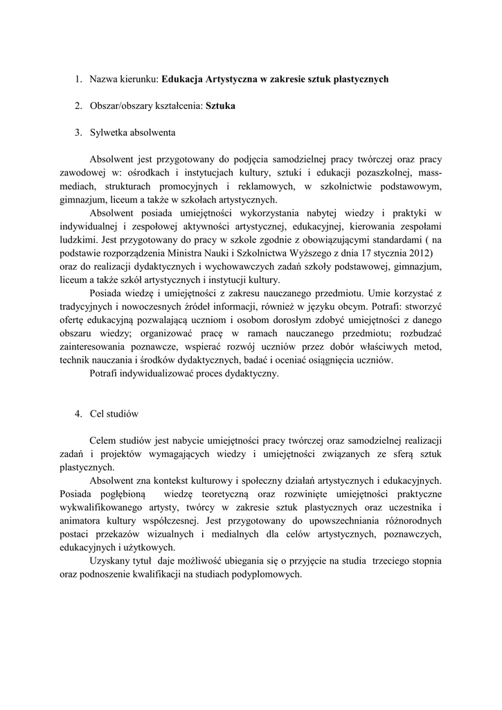 1. Nazwa kierunku: Edukacja Artystyczna w zakresie sztuk plastycznych 2. Obszar/obszary kształcenia: Sztuka 3. Sylwetka absolwenta Absolwent jest przygotowany do podjęcia samodzielnej pracy twórczej oraz pracy zawodowej w: ośrodkach i instytucjach kultury, sztuki i edukacji pozaszkolnej, massmediach, strukturach promocyjnych i reklamowych, w szkolnictwie podstawowym, gimnazjum, liceum a także w szkołach artystycznych. Absolwent posiada umiejętności wykorzystania nabytej wiedzy i praktyki w indywidualnej i zespołowej aktywności artystycznej, edukacyjnej, kierowania zespołami ludzkimi. Jest przygotowany do pracy w szkole zgodnie z obowiązującymi standardami ( na podstawie rozporządzenia Ministra Nauki i Szkolnictwa Wyższego z dnia 17 stycznia 2012) oraz do realizacji dydaktycznych i wychowawczych zadań szkoły podstawowej, gimnazjum, liceum a także szkół artystycznych i instytucji kultury. Posiada wiedzę i umiejętności z zakresu nauczanego przedmiotu. Umie korzystać z tradycyjnych i nowoczesnych źródeł informacji, również w języku obcym. Potrafi: stworzyć ofertę edukacyjną pozwalającą uczniom i osobom dorosłym zdobyć umiejętności z danego obszaru wiedzy; organizować pracę w ramach nauczanego przedmiotu; rozbudzać zainteresowania poznawcze, wspierać rozwój uczniów przez dobór właściwych metod, technik nauczania i środków dydaktycznych, badać i oceniać osiągnięcia uczniów. Potrafi indywidualizować proces dydaktyczny. 4. Cel studiów Celem studiów jest nabycie umiejętności pracy twórczej oraz samodzielnej realizacji zadań i projektów wymagających wiedzy i umiejętności związanych ze sferą sztuk plastycznych. Absolwent zna kontekst kulturowy i społeczny działań artystycznych i edukacyjnych. Posiada pogłębioną wiedzę teoretyczną oraz rozwinięte umiejętności praktyczne wykwalifikowanego artysty, twórcy w zakresie sztuk plastycznych oraz uczestnika i animatora kultury współczesnej. Jest przygotowany do upowszechniania różnorodnych postaci przekazów wizualnych i medialnych dla celów artystycznych, poznawczych, edukacyjnych i użytkowych. Uzyskany tytuł daje możliwość ubiegania się o przyjęcie na studia trzeciego stopnia oraz podnoszenie kwalifikacji na studiach podyplomowych. 5. Kierunkowe efekty kształcenia i ich odniesienie do efektów kształcenia dla obszaru/obszarów nauki. Nazwa kierunku studiów: Edukacja Artystyczna w zakresie Sztuk Plastycznych Stopień studiów : drugiego stopnia Profil kształcenia: ogólnoakademicki Symbol efektu kierunkowego Kierunkowe efekty kształcenia Odniesienie do efektów obszarowych WIEDZA w zakresie kultury i sztuki współczesnej K_W01 - posiada pogłębioną znajomość literatury z zakresu kultury i sztuki A2_W09 K_W02 - posiada szczegółową wiedzę o głównych ośrodkach kultury i sztuki A2_W08 K_W03 - Rozumie teorie artystyczne formułowane przez analityków i twórców. Orientuje się w ewolucji form i kierunków na przestrzeni ostatnich 70 lat. A2_W09 A2_W08 K_W04 - zna i rozumie podstawowe linie rozwojowe w historii klasycznych dyscyplin artystycznych i sztuki medialnej oraz zna publikacje związane z tymi zagadnieniami A2_W09 K_W05 - wykazuje się znajomością najnowszych osiągnięć sztuki A2_W08 K_W06 - zna wpływ doktryn, idei oraz krytyki artystycznej A2_W09 K_W07 - ma wiedzę na temat krytyki artystycznej jako informacji manipulacji społecznej A2_W11 A2_W08 K_W08 - ma wiedzę na temat obiegu kultury i sztuki współczesnej i roli mass – mediów A2_W09 K_W09 - rozumie idee artystycznego przekazu najważniejszych twórców XX i XXI wieku. Praktycznie i teoretycznie wykorzystuje umiejętności i kompetencje z zakresu języka form wizualnych A2_W11 w zakresie projektów twórczych K_W10 - ma wiedzę na temat konstruowania projektów artystycznych, społecznych edukacyjnych A2_W12 K_W11 - zna współczesne koncepcje edukacji artystycznej A2_W13 K_W12 - dysponuje wiedzą na temat akcji, warsztatów, działań, interwencji ( artystycznych, społecznych, terapeutycznych, promocyjnych i reklamowych) A2_W12 A2_W11 K_W13 - ma wiedzę na temat integracji sztuk plastycznych z innymi dziedzinami z zakresu kultury nauki i techniki A2_W09 K_W14 - zna kontekst społeczny działań plastycznych A2_W09 w zakresie kreacji wizualnych i multimedialnych K_W15 -umie tworzyć i realizować własne, oryginalne koncepcje artystyczne w wybranej specjalności A2_W10 K_W16 - ma ugruntowaną wiedzę z zakresu dyscyplin artystycznych, którą systematycznie rozwija A2_W08 K_W17 - posiada gruntowną znajomość środków i technik artystycznych związanych ze studiowanym kierunkiem i specjalnością A2_W11 K_W18 - ma szczegółową wiedzę dotyczącą najnowszych technologii stosowanych w działaniach artystycznych A2_W08 K_W19 - ma teoretyczną i praktyczną wiedzę potrzebną do realizacji własnych projektów artystycznych A2_W11 A2_W12 K_W20 - posiada rozszerzoną wiedzę na temat wybranych dyscyplin artystycznych A2_W08 K_W21 - orientuje się w złożonych zagadnieniach artystycznych i w obszarze wybranej dyscypliny sztuki i posiada wiedzę niezbędną do ich formułowania oraz rozwiązywania dotyczących tych zagadnień A2_W08 K_W22 - zna sposoby realizowania prac artystycznych o wysokim stopniu oryginalności A2_W10 w zakresie pedagogiki K_W23 - zna podstawową terminologię wykorzystywaną do opisu zjawisk pedagogicznych, wychowawczych i edukacyjnych A2_W13 K_W24 - posiada szczegółową wiedzę o metodyce wychowania artystycznego A2_W13 UMIEJĘTNOŚCI w zakresie kultury i sztuki współczesnej K_U01 - potrafi wykorzystać wiedzę o kulturze i sztuce A2_U17 współczesnej; analizuje i interpretuje istotę konstrukcji dzieła sztuki, samodzielnie potrafi ocenić jego wartość artystyczną K_U02 - wykorzystuje kryteria i metody porównawcze w ocenie współczesnych sztuk wizualnych i medialnych A2_U17 K_U03 - posiada umiejętność przygotowania rozbudowanych prac pisemnych 