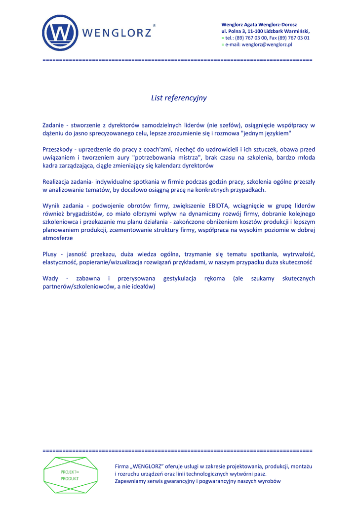 Wenglorz Agata Wenglorz-Dorosz ul. Polna 3, 11-100 Lidzbark Warmiński, = tel.: (89) 767 03 00, Fax (89) 767 03 01 = e-mail: [email protected] ================================================================================== List referencyjny Zadanie - stworzenie z dyrektorów samodzielnych liderów (nie szefów), osiągnięcie współpracy w dążeniu do jasno sprecyzowanego celu, lepsze zrozumienie się i rozmowa "jednym językiem" Przeszkody - uprzedzenie do pracy z coach'ami, niechęć do uzdrowicieli i ich sztuczek, obawa przed uwiązaniem i tworzeniem aury "potrzebowania mistrza", brak czasu na szkolenia, bardzo młoda kadra zarządzająca, ciągle zmieniający się kalendarz dyrektorów Realizacja zadania- indywidualne spotkania w firmie podczas godzin pracy, szkolenia ogólne przeszły w analizowanie tematów, by docelowo osiągną pracę na konkretnych przypadkach. Wynik zadania - podwojenie obrotów firmy, zwiększenie EBIDTA, wciągnięcie w grupę liderów również brygadzistów, co miało olbrzymi wpływ na dynamiczny rozwój firmy, dobranie kolejnego szkoleniowca i przekazanie mu planu działania - zakończone obniżeniem kosztów produkcji i lepszym planowaniem produkcji, zcementowanie struktury firmy, współpraca na wysokim poziomie w dobrej atmosferze Plusy - jasność przekazu, duża wiedza ogólna, trzymanie się tematu spotkania, wytrwałość, elastyczność, popieranie/wizualizacja rozwiązań przykładami, w naszym przypadku duża skuteczność Wady - zabawna i przerysowana partnerów/szkoleniowców, a nie ideałów) gestykulacja rękoma (ale szukamy skutecznych ================================================================================== Firma „WENGLORZ” oferuje usługi w zakresie projektowania, produkcji, montażu i rozruchu urządzeń oraz linii technologicznych wytwórni pasz. Zapewniamy serwis gwarancyjny i pogwarancyjny naszych wyrobów