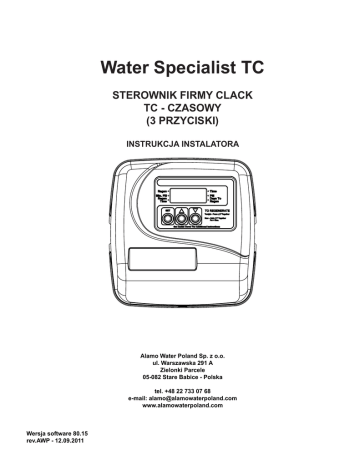 Water Specialist TC STEROWNIK FIRMY CLACK TC - CZASOWY (3 PRZYCISKI) INSTRUKCJA INSTALATORA Alamo Water Poland Sp. z o.o. ul. Warszawska 291 A Zielonki Parcele 05-082 Stare Babice - Polska tel. +48 22 733 07 68 e-mail: [email protected] www.alamowaterpoland.com Wersja software 80.15 rev.AWP - 12.09.2011 Strona 2 WS TC Manual Pokrywa TC i przekładnia napędu Numer 1 2 3 4 5 6 Not Shown Numer katalogowy V3175TC-01 V3107-01 V3106-01 V3818TC V3110 V3109 V3002TC V3186 V3186 Not Shown Opis WS1TC Front Cover ASY WS1 Motor ASY WS1 Drive Bracket & Spring Clip WS1TC PC Board 4-Digit WS1 Drive Reducing Gear 12 x 36 WS1 Drive Gear Cover WS1TC Drive ASY WS1 AC Adapter 110V - 12V Ilość 1 1 1 1 3 1 * 1 WS1 AC Adapter 110V - 12V V3186EU WS1 AC Adapter 220-240V-12V EU V3186UK WS1 AC Adapter 220-240V-12V UK V3186-01 WS1 AC Adapter CORD ONLY 1 * Części 2-6 mogą być zamówione jako kompletny zestaw o numerze V3002. When replacing the battery, align positives and push down to fully seat. Correct Battery Orientation Battery replacement is 3 volt lithium coin cell type 2032. Battery Fully Seated 1 4 6 5 2 3 WS TC Manual Strona 3 Informacja ogólna Sterownik oferuje następujące procedury programowania umożliwiające dostosowanie go do potrzeb konkretnego systemu: • • • Główna Procedura Programowania (OEM System Setup) Ustawienia Instalatora: 1-99 dni (Installer Displays & Settings: 1-99 Days Between Regeneration) lub Ustawienia Instalatora: kalendarz 7-dniowy (Installer Displays & Settings: 7-Day) Wyświetlenia Użytkownika (User Displays) Po ustawieniu Głównej Procedury Programowania, pozostałe procedury mogą być ustawiane w dowolnej kolejności. Podczas normalnej pracy systemu na wyświetlaczu pokazywany jest aktualny czas lub ilość dni pozostała do regeneracji. Jeśli podczas wprowadzania ustawień w procedurach żaden przycisk nie zostanie wciśnięty przez 5 minut, wówczas wyświetlacz wróci do trybu wyświetleń użytkownika, a zmiany wprowadzone do tego czasu zostaną zapamiętane. Aby szybko wyjść z dowolnej procedury programowania należy wcisnąć jednocześnie SET i W DÓŁ. Zmiany wprowadzone przed wyjściem zostaną zapamiętane. Aby zresetować sterownik należy (będąc w Wyświetleniach Użytkownika) jednocześnie wcisnąć i przytrzymać przyciski SET i W DÓŁ, lub odpiąć i (po min.3 sekundach) ponownie podłączyć do płytki PC kabel zasilający. Główna Procedura Programowania KROK 1SS KROK 1SS Główną Procedurę Programowania uruchamia się przez: 1. Jednoczesne wciśnięcie przez 3 sekundy przycisków SET i W GÓRĘ aż do zmiany informacji na wyświetlaczu. 2. Powtórzenie powyższej operacji po raz drugi. KROK 2SS KROK 2SS Wybierz właściwy program za pomocą przycisku W GÓRĘ lub W DÓŁ. Możliwe do wyboru programy pokazane są w poniższej tabeli. Naciśnij SET aby przejść do następnego kroku. Program P0 P1 P2 P3 P4 P5 P6 P7 P8 P9 KROK 3SS C1 Backwash 3 8 8 12 10 4 12 6 10 14 Dostępne programy Czas trwania w minutach C2 C3 C4 Regenerate Backwash Rinse 50 3 3 50 8 4 70 10 6 70 12 8 50 8 50 4 6 12 4 6 8 C5 Fill 1-99 1-99 1-99 1-99 1-99 1-99 1-99 - KROK 3SS Jeśli wybrano jeden z programów od P0 do P6 wówczas w tym kroku należy podać czas napełniania zbiornika regeneranta (1–99 min). Jeżeli wybrano program P7, P8 lub P9 ten ekran się nie pojawi. UWAGA: w ciągu minuty napełniania do zbiornika solanki wlewane jest 1.9 litra (0.5 gal) wody. Ta ilość wody rozpuści około 0,7 kg (1.5 lbs) soli. Naciśnij SET aby przejść do następnego kroku. Strona 4 KROK 4SS lub WS TC Manual KROK 4SS Przyciskiem W GÓRĘ lub W DÓŁ wybierz czy regeneracja ma się odbywać: • 99 - co stałą liczbę dni (1-99 dni) • 7 - w konkretne dni tygodnia (poniedziałek-niedziela) Naciśnij SET aby przejść do następnego kroku. KROK 5SS lub KROK 5SS Przyciskiem W GÓRĘ lub W DÓŁ wybierz rodzaj regeneracji inicjowanej zewnętrznym sygnałem: • opóźniona (widoczna jest strzałka przy napisie REGEN TIME) • natychmiastowa (brak strzałki przy napisie REGEN TIME) Wybór opcji ma znaczenie tylko wówczas, gdy przewidziane jest aktywowanie styku dP zewnętrznym sygnałem elektrycznym. Wymagany czas trwania sygnału minimum 2 minuty. POWRÓT DO WYŚWIETLEŃ UŻYTKOWNIKA Naciśnij SET aby zakończyć główną procedurę programowania. A B C A. Złącze zewnętrznego sygnału B. Złącze silniczka C. Złącze zasilania WS TC Manual Strona 5 Ustawienia Instalatora (1-99 dni) KROK 1ID Wyświetlenie to nie pojawi się gdy w Głównej Procedurze Programowania wybrana została opcja regeneracji w konkretne dni tygodnia (7) KROK 1ID Ustawienia instalatora uruchamia się przez jednoczesne wciśnięcie przez 3 sekundy przycisków SET i W GÓRĘ aż do zmiany informacji na wyświetlaczu. KROK 2ID KROK 2ID Przyciskiem W GÓRĘ lub W DÓŁ wybierz godzinę rozpoczęcia regeneracji opóźnionej. Naciśnij SET aby przejść do następnego kroku. KROK 3ID KROK 3ID Przyciskiem W GÓRĘ lub W DÓŁ wybierz minuty rozpoczęcia regeneracji opóźnionej. Naciśnij SET aby przejść do następnego kroku. KROK 4ID KROK 4ID Przyciskiem W GÓRĘ lub W DÓŁ wybierz ilość dni między regeneracjami w przedziale 1-99 dni Naciśnij SET aby zakończyć wprowadzanie ustawień instalatora. POWRÓT DO WYŚWIETLEŃ UŻYTKOWNIKA Ustawienia Instalatora (kalendarz 7-dniowy) KROK 1I7 KROK 2I7 Wyświetlenie to nie pojawi się gdy w Głównej Procedurze Programowania wybrana została opcja regeneracji co stałą liczbę dni (99) KROK 1I7 Ustawienia instalatora uruchamia się przez jednoczesne wciśnięcie przez 3 sekundy przycisków SET i W GÓRĘ aż do zmiany informacji na wyświetlaczu. KROK 2I7 Przyciskiem W GÓRĘ lub W DÓŁ wybierz godzinę rozpoczęcia regeneracji opóźnionej. Naciśnij SET aby przejść do następnego kroku. KROK 3I7 KROK 3I7 Przyciskiem W GÓRĘ lub W DÓŁ wybierz minuty rozpoczęcia regeneracji opóźnionej. Naciśnij SET aby przejść do następnego kroku. Wyś