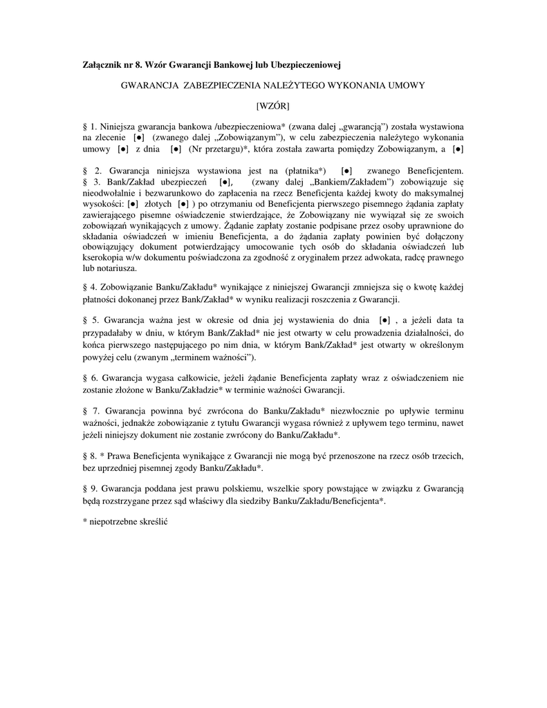 Załącznik nr 8. Wzór Gwarancji Bankowej lub Ubezpieczeniowej GWARANCJA ZABEZPIECZENIA NALEŻYTEGO WYKONANIA UMOWY [WZÓR] § 1. Niniejsza gwarancja bankowa /ubezpieczeniowa* (zwana dalej „gwarancją”) została wystawiona na zlecenie [●] (zwanego dalej „Zobowiązanym”), w celu zabezpieczenia należytego wykonania umowy [●] z dnia [●] (Nr przetargu)*, która została zawarta pomiędzy Zobowiązanym, a [●] § 2. Gwarancja niniejsza wystawiona jest na (płatnika*) [●] zwanego Beneficjentem. § 3. Bank/Zakład ubezpieczeń [●], (zwany dalej „Bankiem/Zakładem”) zobowiązuje się nieodwołalnie i bezwarunkowo do zapłacenia na rzecz Beneficjenta każdej kwoty do maksymalnej wysokości: [●] złotych [●] ) po otrzymaniu od Beneficjenta pierwszego pisemnego żądania zapłaty zawierającego pisemne oświadczenie stwierdzające, że Zobowiązany nie wywiązał się ze swoich zobowiązań wynikających z umowy. Żądanie zapłaty zostanie podpisane przez osoby uprawnione do składania oświadczeń w imieniu Beneficjenta, a do żądania zapłaty powinien być dołączony obowiązujący dokument potwierdzający umocowanie tych osób do składania oświadczeń lub kserokopia w/w dokumentu poświadczona za zgodność z oryginałem przez adwokata, radcę prawnego lub notariusza. § 4. Zobowiązanie Banku/Zakładu* wynikające z niniejszej Gwarancji zmniejsza się o kwotę każdej płatności dokonanej przez Bank/Zakład* w wyniku realizacji roszczenia z Gwarancji. § 5. Gwarancja ważna jest w okresie od dnia jej wystawienia do dnia [●] , a jeżeli data ta przypadałaby w dniu, w którym Bank/Zakład* nie jest otwarty w celu prowadzenia działalności, do końca pierwszego następującego po nim dnia, w którym Bank/Zakład* jest otwarty w określonym powyżej celu (zwanym „terminem ważności”). § 6. Gwarancja wygasa całkowicie, jeżeli żądanie Beneficjenta zapłaty wraz z oświadczeniem nie zostanie złożone w Banku/Zakładzie* w terminie ważności Gwarancji. § 7. Gwarancja powinna być zwrócona do Banku/Zakładu* niezwłocznie po upływie terminu ważności, jednakże zobowiązanie z tytułu Gwarancji wygasa również z upływem tego terminu, nawet jeżeli niniejszy dokument nie zostanie zwrócony do Banku/Zakładu*. § 8. * Prawa Beneficjenta wynikające z Gwarancji nie mogą być przenoszone na rzecz osób trzecich, bez uprzedniej pisemnej zgody Banku/Zakładu*. § 9. Gwarancja poddana jest prawu polskiemu, wszelkie spory powstające w związku z Gwarancją będą rozstrzygane przez sąd właściwy dla siedziby Banku/Zakładu/Beneficjenta*. * niepotrzebne skreślić