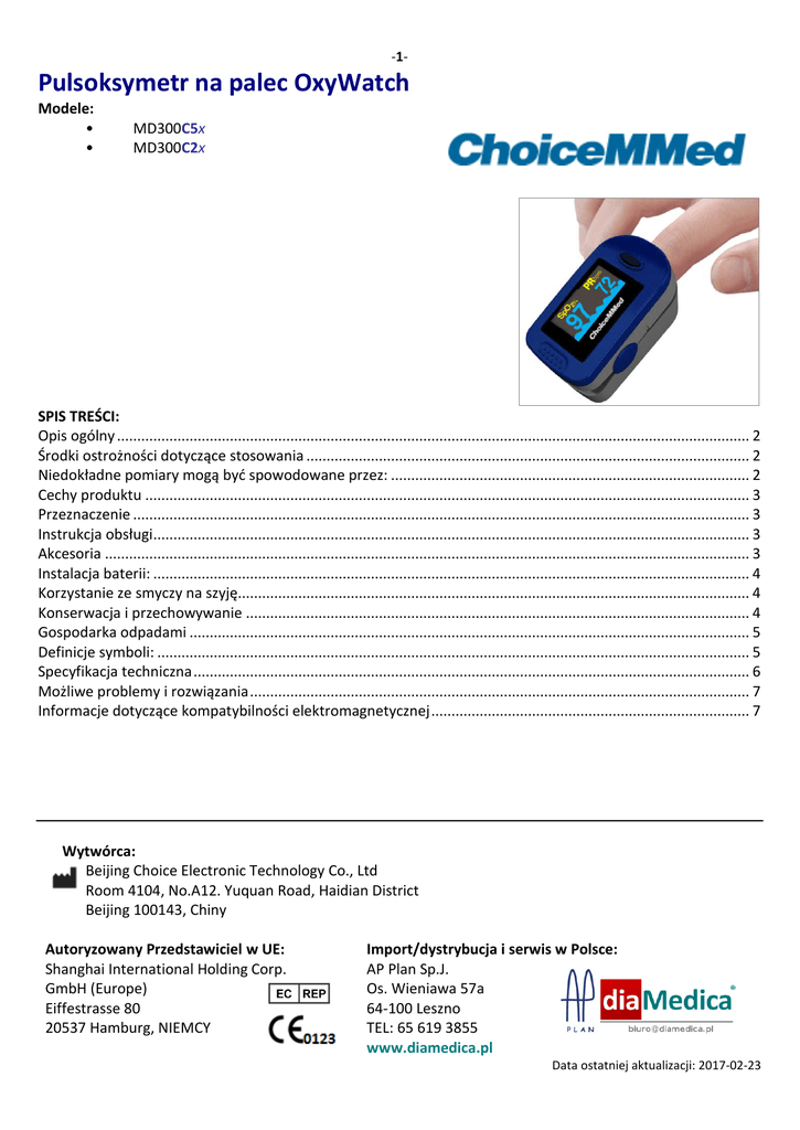-1- Pulsoksymetr na palec OxyWatch Modele: • • MD300C5x MD300C2x SPIS TREŚCI: Opis ogólny ............................................................................................................................................................. 2 Środki ostrożności dotyczące stosowania .............................................................................................................. 2 Niedokładne pomiary mogą być spowodowane przez: ......................................................................................... 2 Cechy produktu ...................................................................................................................................................... 3 Przeznaczenie ......................................................................................................................................................... 3 Instrukcja obsługi.................................................................................................................................................... 3 Akcesoria ................................................................................................................................................................ 3 Instalacja baterii: .................................................................................................................................................... 4 Korzystanie ze smyczy na szyję............................................................................................................................... 4 Konserwacja i przechowywanie ............................................................................................................................. 4 Gospodarka odpadami ........................................................................................................................................... 5 Definicje symboli: ................................................................................................................................................... 5 Specyfikacja techniczna .......................................................................................................................................... 6 Możliwe problemy i rozwiązania ............................................................................................................................ 7 Informacje dotyczące kompatybilności elektromagnetycznej ............................................................................... 7 Wytwórca: Beijing Choice Electronic Technology Co., Ltd Room 4104, No.A12. Yuquan Road, Haidian District Beijing 100143, Chiny Autoryzowany Przedstawiciel w UE: Shanghai International Holding Corp. GmbH (Europe) Eiffestrasse 80 20537 Hamburg, NIEMCY Import/dystrybucja i serwis w Polsce: AP Plan Sp.J. Os. Wieniawa 57a 64-100 Leszno TEL: 65 619 3855 www.diamedica.pl Data ostatniej aktualizacji: 2017-02-23 -2- Opis ogólny Tlen wiąże hemoglobinę w erytrocytach podczas przepływu krwi przez płuca. Jest on transportowany w organizmie we krwi tętniczej. Pulsoksymetr wykorzystuje dwie częstotliwości światła (czerwone i podczerwone) dla określenia procentu (%) wysycenia tlenem hemoglobiny we krwi. Odsetek ten nazywany jest saturacją krwi lub w skrócie SpO2. Podczas pomiaru poziomu SpO2, pulsoksymetr także mierzy i wyświetla wartość tętna. Zasada działania 1. Nadajnik czerwieni i podczerwieni 2. Czujnik czerwieni i podczerwieni Środki ostrożności dotyczące stosowania 1. Przed użyciem należy dokładnie przeczytać instrukcję obsługi. 2. Działanie urządzenia może być zakłócone przez stosowanie urządzeń elektrochirurgicznych (ESU). 3. Aby uzyskać dokładny pomiar SpO2, urządzenie musi jednocześnie prawidłowo mierzyć puls. Upewnij się, że nic nie utrudnia pomiaru tętna przed dokonaniem pomiaru SpO 2. 4. Nie używaj aparatu w środowisku MRI lub CT. 5. Nie używaj aparatu w sytuacjach, gdy wymagane są alarmy. Urządzenie nie ma alarmu. Nie jest przeznaczone do ciągłego monitorowania. 6. Nie używaj aparatu w atmosferze zagrożonej wybuchem. 7. Urządzenie jest przeznaczone tylko jako uzupełnienie oceny stanu pacjenta. Należy go stosować w połączeniu z innymi metodami oceny objawów klinicznych. 8. W celu zapewnienia prawidłowego przylegania czujnika i integralności skóry, maksymalny czas aplikacji urządzenia w jednym miejscu nie powinien przekraczać pół godziny. 9. Nie sterylizować urządzenia przy użyciu autoklawu, tlenku etylenu, nie zanurzać urządzenia w cieczy. Urządzenie nie jest przeznaczone do sterylizowania. 10. Postępuj zgodnie z instrukcjami lokalnych urzędów i przepisów dotyczących recyklingu, utylizacji elementów urządzeń i urządzeń, łącznie z bateriami. 11. To urządzenie jest zgodne z normą IEC 60601-1-2: 2007 dla kompatybilności elektromagnetycznej medycznych urządzeń elektrycznych i/lub systemów. Jednakże, ze względu na rozprzestrzenianie się sygnałów z urządzeń nadawczo-odbiorczych o częstotliwościach radiowych i innych źródeł szumów elektrycznych w obiektach opieki zdrowotnej, możliwe jest, że wysokie poziomy takich zakłóceń ze względu na bliskość lub moc źródła mogą zakłócić działanie urządzenia. 12. Przenośne i ruchome urządzenia radiowe RF mogą mieć wpływ na działanie medycznych urządzeń elektrycznych. 13. Niniejszy sprzęt nie jest przeznaczony do stosowania podczas transportu pacjenta na zewnątrz zakładu opieki zdrowotnej 14. Sprzęt ten nie powinien być stosowany w sąsiedztwie lub na innych urządzeniach. 15. Nie rozmontowywać, nie naprawiać i nie modyfikować urządzenia bez zezwolenia. 16. Materiały, które kontaktują się ze skórą pacjenta, zawierają silikon medyczny oraz tworzywo sztuczne ABS obudowy, które przeszły testy ISO 10993-5 dotyczące cytotoksyczności in vitro i ISO 10993-10, badania działania drażniącego i nadwrażliwości typu opóźnionego. Tylko Rx: "Uwa
