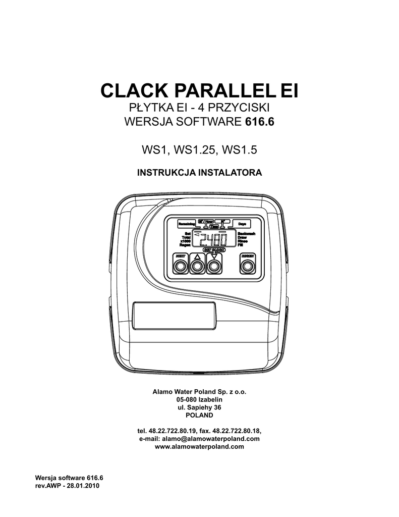CLACK PARALLEL EI PŁYTKA EI - 4 PRZYCISKI WERSJA SOFTWARE 616.6 WS1, WS1.25, WS1.5 INSTRUKCJA INSTALATORA Alamo Water Poland Sp. z o.o. 05-080 Izabelin ul. Sapiehy 36 POLAND tel. 48.22.722.80.19, fax. 48.22.722.80.18, e-mail: [email protected] www.alamowaterpoland.com Wersja software 616.6 rev.AWP - 28.01.2010 Strona 2 WS EI Parallel Manual - rev616.6 SCHEMAT POŁĄCZEŃ dla płytki CI (5 przycisków) do konfiguracji równoległej (parallel) można także użyć płytek EI (4 przyciski) Głowica główna (A) Kabel zasilający doprowadź do płytki otworem w tylnej części obudowy. Głowica podrzędna (B) Kabel podłącz do złącza dP na płytce głowicy podrzędnej 1 2 5 Podłącz kable z czerwoną izolacją Kabel łączący (V3340 WS1 Interconnect Cable Cord Assembly) ma ograniczenie napięcia do 24V przy natężeniu 1⁄2 A. Wodomierz nie jest konieczny 3 Umieść pierścień przewężeniem w kierunku głowicy 4 Woda uzdatniona zawór NHBP zawór NHBP Głowica A (meter) Głowica B (time) zawór NHBP zawór NHBP Głowica C (time) Głowica ... (time) Woda surowa Numer katalogowy: V3014 Opis: WS1 Series Microswitch Assembly Numer 1 2 3 4 5 Numer katalogowy V3301 V3304 V3305 V3335 V3340 Opis WS1 MICROSWITCH WS1 SCREWS 4/40 x 3/4 WS1 RETAINING RING SS 1/4 WS1 WASHER STEPPED WS1 INTERCONNECT CORD ASY Ilość 1 2 1 1 1 Komunikacja między sterownikiem głównym (Głowica A) i podrzędnym (Głowica B) odbywa się za pomocą zestawu V3014 składającego się z mikrowyłącznika (WS1 Microswitch) ze specjalnym pierścieniem aktywującym styki w trakcie cyklu napełniania zbiornika solanki (FILL) oraz przewodu łączącego mikrowyłącznik (styki COM i NO) ze złączem dP na płytce zaworu podrzędnego. Sprawdź na rysunku prawidłową instalację pierścienia - przewężenie powinno być skierowane w stronę głowicy. WS EI Parallel Manual - rev616.6 Strona 3 Przed rozpoczęciem programowania upewnij się, że wszystkie elementy systemu są prawidłowo podłączone. 1. Podłącz końcówki (z czerwoną izolacją) kabla łączącego do styków COM i NO w mikrowyłączniku zamontowanym na głowicy głównej (A). Drugi koniec kabla łączącego podłącz do złącza dP na płytce głowicy podrzędnej (B). 2. Przewód zasilający zawór NHBP lub MAV musi być podłączony do przyłącza ”Alternator Drive” na płytce sterującej każdej głowicy • dla głowic WS1 i WS1.25 należy stosować zawór NHBP 1.25” • dla głowic WS1.5 należy stosować zawór MAV 1.5” (w zaworze MAV należy mechanicznie zaślepić port A natomiast wylot z głowicy podłączyć do portu B zaworu MAV) UWAGA 1: Upewnij się, że plastikowy pierścień (obiekt nr 4) jest skierowany przewężeniem w kierunku głowicy. UWAGA 2: Po podłączeniu wszystkich elementów sprawdź prawidłowe działanie systemu. W tym celu wciśnij i przytrzymaj przycisk REGEN na głowicy głównej (A). Kiedy silniczek przestanie pracować wciśnij jednorazowo przycisk REGEN aby przejść przez kolejne etapy regeneracji, aż do etapu FILL. Podczas trwania tego etapu głowica podrzędna (B) powinna rozpocząć regenerację po 2-6 minutach. Jeśli głowica podrzędna (B) nie rozpocznie regeneracji w ciągu 2-6 minut, należy sprawdzić mocowanie pierścienia, połączenia kabla łączącego głowice oraz programowanie głowicy podrzędnej (B). UWAGA 3: Głowica główna (A) powinna być zaprogramowana tak, aby etap regeneracji FILL następował po właściwej regeneracji złoża. Etap FILL powinien trwać przynajmniej 6 minut (w kroku 7CT) UWAGA 4: Głowica podrzędna (B) powinna być zaprogramowana tak, aby regeneracja następowała tylko kiedy głowica główna (A) wejdzie w etap FILL. Aby to osiągnąć należy wyłączyć funkcję regeneracji czasowej (w kroku 3I). Głowicę podrzędną (B) należy także zaprogramować do regeneracji natychmiastowej (on 0) (w kroku 7CS). Strona 4 WS EI Parallel Manual - rev616.6 Pokrywa EI i przekładnia napędu Numer 1 2 3 4 5 6 Nie pokazany Numer katalogowy V3175EI-01 V3107-01 V3106-01 V3408EI-02BOARD V3110 V3109 V3186 V3186EU V3186UK V3186-01 V3178 Opis WS1EI Front Cover Assembly WS1 Motor WS1 Drive Bracket & Spring Clip WS1THRU2L EI PCBRD MAV/ALT REPL WS1 Drive reducing Gear 12x36 WS1 Drive Gear Cover WS1 AC ADAPTER 110V-12V WS1 AC ADAPTER 220-240V-12V EU WS1 AC ADAPTER 220-240V-12V UK WS1 AC ADAPTER CORD ONLY WS1 Drive Back Plate Refer to Control Valve Service Manual for other drawings and part numbers. AC Adapter Supply Voltage Supply Frequency Output Voltage Output Current U.S. 120 V AC 60 Hz 12 V AC 500 mA International 230V AC 50 Hz 12 V AC 500 mA When replacing the battery, align positives and push down to fully seat. Correct Battery Orientation Battery replacement is 3 volt lithium coin cell type 2032. Battery Fully Seated 4 1 6 5 2 3 Ilość 1 1 1 1 3 1 1 1 Strona 5 WS EI Parallel Manual - rev616.6 Wyświetlenia monitorowania etapów regeneracji oraz wyświetlenia usterek Wyświetlenia Regeneracji Wyświetlany jest czas pozostający do zakończenia wskazywanego strzałką etapu regeneracji. Wciskając REGEN można przejść do kolejnego etapu. Wyświetlenia usterek Słowo “Error” (błąd) wyświetla się na przemian z cyfrą informującą o charakterze zakłócenia: 1001 - sterownik nie rozpoznaje rozpoczęcia regeneracji 1002 - tłok zablokowany mechanicznie 1003 - zbyt długi czas pracy silniczka przy próbie przejścia do kolejnego etapu regeneracji 1004 - zbyt długi czas pracy silniczka przy próbie powrotu do pozycji Praca/Service Aby skasować należy odłączyć przewód zasilający na płytce sterownika lub nacisnąć równocześnie przez 3 sekundy przyciski NEXT i REGEN Przyciski funkcyjne Przejście do następnego wyświetlenia Pojedyncze naciśnięcie zainicjuje regenerację opóźnioną o zaprogramowanym czasie. Ponowne naciśnięcie odwoła regenerację. Naciśnięcie i przytrzymanie przez 3 sekundy zainicjuje regenerację natychmiastową. Naciśnięcie w trakcie regenerac