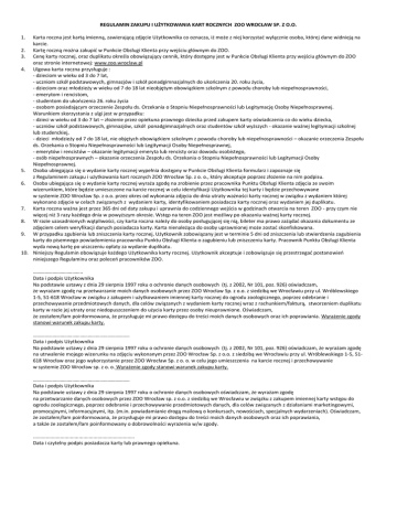 REGULAMIN ZAKUPU I UŻYTKOWANIA KART ROCZNYCH ZOO WROCŁAW SP. Z O.O. 1. Karta roczna jest kartą imienną, zawierającą zdjęcie Użytkownika co oznacza, iż może z niej korzystać wyłącznie osoba, której dane widnieją na karcie. 2. Kartę roczną można zakupić w Punkcie Obsługi Klienta przy wejściu głównym do ZOO. 3. Cenę karty rocznej, oraz duplikatu określa obowiązujący cennik, który dostępny jest w Punkcie Obsługi Klienta przy wejściu głównym do ZOO oraz stronie internetowej: www.zoo.wroclaw.pl 4. Ulgowa karta roczna przysługuje : - dzieciom w wieku od 3 do 7 lat, - uczniom szkół podstawowych, gimnazjów i szkół ponadgimnazjalnych do ukończenia 20. roku życia, - dzieciom oraz młodzieży w wieku od 7 do 18 lat nieobjętym obowiązkiem szkolnym z powodu choroby lub niepełnosprawności, - emerytom i rencistom, - studentom do ukończenia 26. roku życia - osobom posiadającym orzeczenie Zespołu ds. Orzekania o Stopniu Niepełnosprawności lub Legitymację Osoby Niepełnosprawnej. Warunkiem skorzystania z ulgi jest w przypadku: - dzieci w wieku od 3 do 7 lat – złożenie przez opiekuna prawnego dziecka przed zakupem karty oświadczenia co do wieku dziecka, - uczniów szkół podstawowych, gimnazjów, szkół ponadgimnazjalnych oraz studentów szkół wyższych - okazanie ważnej legitymacji szkolnej lub studenckiej, - dzieci młodzieży od 7 do 18 lat, nie objętych obowiązkiem szkolnym z powodu choroby lub niepełnosprawności – okazanie orzeczenia Zespołu ds. Orzekania o Stopniu Niepełnosprawności lub Legitymacji Osoby Niepełnosprawnej, - emerytów i rencistów – okazanie legitymacji emeryta lub rencisty oraz dowodu osobistego, - osób niepełnosprawnych – okazanie orzeczenia Zespołu ds. Orzekania o Stopniu Niepełnosprawności lub Legitymacji Osoby Niepełnosprawnej. 5. Osoba ubiegająca się o wydanie karty rocznej wypełnia dostępny w Punkcie Obsługi Klienta formularz i zapoznaje się z Regulaminem zakupu i użytkowania kart rocznych ZOO Wrocław Sp. z o. o., który akceptuje poprzez złożenie na nim podpisu. 6. Osoba ubiegająca się o wydanie karty rocznej wyraża zgodę na zrobienie przez pracownika Punktu Obsługi Klienta zdjęcia ze swoim wizerunkiem, które będzie umieszczone na karcie rocznej w celu identyfikacji Użytkownika tej karty i będzie przechowywane w systemie ZOO Wrocław Sp. z o.o. przez okres od wykonania zdjęcia do dnia utraty ważności karty rocznej w związku z wydaniem której wykonano zdjęcie w celach związanych z wydaniem karty, identyfikowaniem posiadacza karty rocznej oraz wydaniem jej duplikatu. 7. Karta roczna ważna jest przez 365 dni od daty zakupu i uprawnia do codziennego wejścia w godzinach otwarcia na teren ZOO - przy czym nie więcej niż 3 razy każdego dnia w powyższym okresie. Wstęp na teren ZOO jest możliwy po okazaniu ważnej karty rocznej. 8. W razie uzasadnionych wątpliwości, czy karta roczna należy do osoby posługującej się nią, bileter ma prawo zażądać okazania dokumentu ze zdjęciem celem weryfikacji danych posiadacza karty. Karta nienależąca do osoby uprawnionej może zostać skonfiskowana. 9. W przypadku zgubienia lub zniszczenia karty rocznej, Użytkownik zobowiązany jest w terminie 5 dni od zniszczenia lub stwierdzenia zagubienia karty do pisemnego powiadomienia pracownika Punktu Obsługi Klienta o zagubieniu lub zniszczeniu karty. Pracownik Punktu Obsługi Klienta wyda nową kartę po uiszczeniu opłaty za wydanie duplikatu. 10. Niniejszy Regulamin obowiązuje każdego Użytkownika karty rocznej. Użytkownik akceptuje i zobowiązuje się przestrzegać postanowień niniejszego Regulaminu oraz poleceń pracowników ZOO. ……………………………….. Data i podpis Użytkownika Na podstawie ustawy z dnia 29 sierpnia 1997 roku o ochronie danych osobowych (tj. z 2002, Nr 101, poz. 926) oświadczam, że wyrażam zgodę na przetwarzanie moich danych osobowych przez ZOO Wrocław Sp. z o.o. z siedzibą we Wrocławiu przy ul. Wróblewskiego 1-5, 51-618 Wrocław w związku z zakupem i użytkowaniem imiennej karty rocznej do ogrodu zoologicznego, poprzez odebranie i przechowywanie przedmiotowych danych, dla celów związanych z wydaniem karty rocznej wraz z rachunkiem/fakturą, stworzeniem duplikatu karty w razie jej utraty oraz niedopuszczeniem do użycia karty przez osoby nieuprawnione. Oświadczam, że zostałem/łam poinformowana, że przysługuje mi prawo dostępu do treści moich danych osobowych oraz ich poprawiania. Wyrażenie zgody stanowi warunek zakupu karty. ……………………………………………………………….. Data i podpis Użytkownika Na podstawie ustawy z dnia 29 sierpnia 1997 roku o ochronie danych osobowych (tj. z 2002, Nr 101, poz. 926) oświadczam, że wyrażam zgodę na utrwalenie mojego wizerunku na zdjęciu wykonanym przez ZOO Wrocław Sp. z o.o. z siedzibą we Wrocławiu przy ul. Wróblewskiego 1-5, 51618 Wrocław oraz jego wykorzystanie przez ZOO Wrocław Sp. z o. o. w celu jego umieszczenia na karcie rocznej i przechowywanie w systemie ZOO Wrocław sp. z o. o. Wyrażenie zgody stanowi warunek zakupu karty. ……………………………………………………………….. Data i podpis Użytkownika Na podstawie ustawy z dnia 29 sierpnia 1997 roku o ochronie danych osobowych oświadczam, że wyrażam zgodę na przetwarzanie danych osobowych przez ZOO Wrocław sp. z o.o. z siedzibą we Wrocławiu w związku z zakupem imiennej karty wstępu do ogrodu zoologicznego, poprzez odebranie i przechowywanie przedmiotowych danych, dla celów związanych z działaniami marketingowymi, promocyjnymi, informacyjnymi, itp. (m.in. powiadamianie drogą mailową o konkursach, nowościach, specjalnych wydarzeniach). Oświadczam, że zostałem/łam poinformowana, że przysługuje mi prawo dostępu do treści moich danych osobowych oraz ich poprawiania, a także że zostałem/łam poinformowany o dobrowolności wyrażenia w/w zgody. .