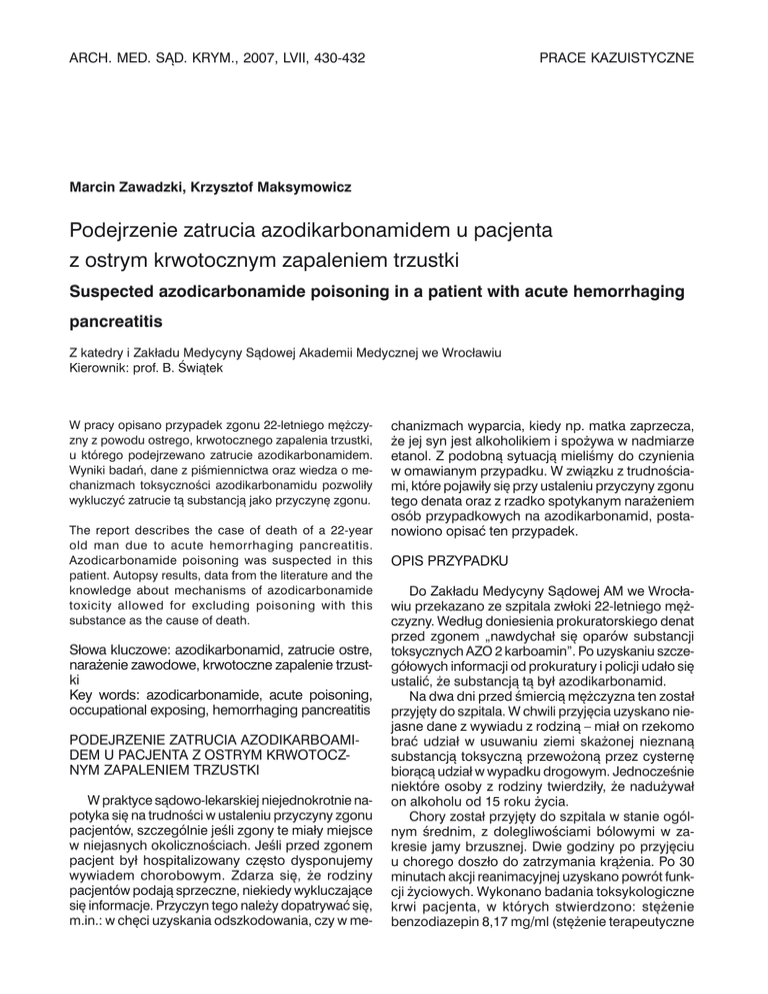 ARCH. MED. SĄD. KRYM., 2007, LVII, 430-432 prace kazuistyczne Marcin Zawadzki, Krzysztof Maksymowicz Podejrzenie zatrucia azodikarbonamidem u pacjenta z ostrym krwotocznym zapaleniem trzustki Suspected azodicarbonamide poisoning in a patient with acute hemorrhaging pancreatitis Z katedry i Zakładu Medycyny Sądowej Akademii Medycznej we Wrocławiu Kierownik: prof. B. Świątek W pracy opisano przypadek zgonu 22-letniego mężczyzny z powodu ostrego, krwotocznego zapalenia trzustki, u którego podejrzewano zatrucie azodikarbonamidem. Wyniki badań, dane z piśmiennictwa oraz wiedza o mechanizmach toksyczności azodikarbonamidu pozwoliły wykluczyć zatrucie tą substancją jako przyczynę zgonu. The report describes the case of death of a 22-year old man due to acute hemorrhaging pancreatitis. Azodicarbonamide poisoning was suspected in this patient. Autopsy results, data from the literature and the knowledge about mechanisms of azodicarbonamide toxicity allowed for excluding poisoning with this substance as the cause of death. Słowa kluczowe: azodikarbonamid, zatrucie ostre, narażenie zawodowe, krwotoczne zapalenie trzustki Key words: azodicarbonamide, acute poisoning, occupational exposing, hemorrhaging pancreatitis PODEJRZENIE ZATRUCIA AZODIKARBOAMIDEM U PACJENTA Z OSTRYM KRWOTOCZNYM ZAPALENIEM TRZUSTKI W praktyce sądowo-lekarskiej niejednokrotnie napotyka się na trudności w ustaleniu przyczyny zgonu pacjentów, szczególnie jeśli zgony te miały miejsce w niejasnych okolicznościach. Jeśli przed zgonem pacjent był hospitalizowany często dysponujemy wywiadem chorobowym. Zdarza się, że rodziny pacjentów podają sprzeczne, niekiedy wykluczające się informacje. Przyczyn tego należy dopatrywać się, m.in.: w chęci uzyskania odszkodowania, czy w me- chanizmach wyparcia, kiedy np. matka zaprzecza, że jej syn jest alkoholikiem i spożywa w nadmiarze etanol. Z podobną sytuacją mieliśmy do czynienia w omawianym przypadku. W związku z trudnościami, które pojawiły się przy ustaleniu przyczyny zgonu tego denata oraz z rzadko spotykanym narażeniem osób przypadkowych na azodikarbonamid, postanowiono opisać ten przypadek. Opis przypadku Do Zakładu Medycyny Sądowej AM we Wrocławiu przekazano ze szpitala zwłoki 22-letniego mężczyzny. Według doniesienia prokuratorskiego denat przed zgonem „nawdychał się oparów substancji toksycznych AZO 2 karboamin”. Po uzyskaniu szczegółowych informacji od prokuratury i policji udało się ustalić, że substancją tą był azodikarbonamid. Na dwa dni przed śmiercią mężczyzna ten został przyjęty do szpitala. W chwili przyjęcia uzyskano niejasne dane z wywiadu z rodziną – miał on rzekomo brać udział w usuwaniu ziemi skażonej nieznaną substancją toksyczną przewożoną przez cysternę biorącą udział w wypadku drogowym. Jednocześnie niektóre osoby z rodziny twierdziły, że nadużywał on alkoholu od 15 roku życia. Chory został przyjęty do szpitala w stanie ogólnym średnim, z dolegliwościami bólowymi w zakresie jamy brzusznej. Dwie godziny po przyjęciu u chorego doszło do zatrzymania krążenia. Po 30 minutach akcji reanimacyjnej uzyskano powrót funkcji życiowych. Wykonano badania toksykologiczne krwi pacjenta, w których stwierdzono: stężenie benzodiazepin 8,17 mg/ml (stężenie terapeutyczne Nr 4 zatrucie azodikarbonamidem < 3 mg/ml), etanol – nieobecny, glikol etylenowy – wynik ujemny, barbiturany – wynik ujemny, opiaty – wynik ujemny. Badania w kierunku obecności benzodiazepin, barbituranów oraz opiatów we krwi wykonane były metodą ELISA, zaś etanol oznaczono metodą chromatografii gazowej. Stężenie glikolu etylenowego oznaczono metodą kolorymetryczną. Z powodu zaostrzenia się objawów brzusznych pacjent był operowany, a w czasie zabiegu stwierdzono ostre martwicze zapalenie trzustki. Po zabiegu przekazano go, w stanie skrajnie ciężkim, na oddział intensywnej terapii. Pomimo leczenia doszło do rozwoju niewydolności wielonarządowej. Dwa dni po przyjęciu chory był reoperowany z powodu rozległej martwicy jelita cienkiego i grubego. Wykonano resekcję niedokrwionych odcinków jelita i wyłoniono sztuczny odbyt. Po zabiegu doszło u pacjenta do zatrzymania krążenia w mechanizmie bradyasystolii. Podjęto akcję reanimacyjną, nie uzyskując powrotu wydolnej hemodynamicznie akcji serca. Po 50 minutach reanimacji stwierdzono zgon wśród objawów zamierającego krążenia. Badanie sekcyjne Zwłoki mężczyzny, budowy ciała prawidłowej, wagi około 100 kg, długości ciała 176 cm. Stężenie pośmiertne średnio intensywne, plamy opadowe skąpe, czerwono-sine, utrwalone. Skóra blado-ziemista, miejscami żółtawa, silnie obrzęknięta. Spojówki zażółcone, w spojówce oka prawego wylew krwawy. Przewody nosowe i jama ustna wypełnione krwistym płynem, wyciekającym na powierzchnię twarzy. W powłokach jamy brzusznej stwierdzono ranę chirurgiczną w linii pośrodkowej ciała, biegnącą od wyrostka mieczykowatego do spojenia łonowego, pięć okrągłych ran będących miejscem wyjścia drenów oraz ranę będącą ujściem pętli jelita na zewnątrz (stomia). Po otwarciu zwłok stwierdzono makroskopowe cechy obrzęku i przekrwienia mózgu, obecność krwistej treści płynnej w obu jamach opłucnowych (po około 350 ml), makroskopowe cechy obrzęku i przekrwienia płuc, otłuszczenie mięśnia sercowego, rozległą martwicę trzustki, z licznymi wypełnionymi treścią krwistą torbielami, martwicę balserowską okolicznych tkanek miękkich, przekrwienie śluzówki żołądka oraz dużą ilość krwistej treści w jego świetle, hepatomegalię, z miąższem wątroby barwy jasnożółtej o wzmożonej konsystencji, niedokrwienie miąższu nerek, stan po resekcji praktycznie całego jelita cienkiego, z pozostawieniem jedynie początkowych 17 cm pętli jelitowych, resekcji kątnicy, okrężnicy wstępującej, poprzecznej i fragmentu zstępującej. W badaniu hist