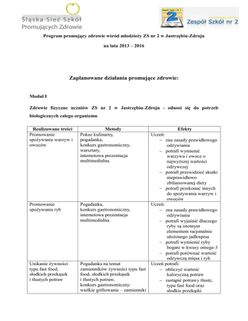 Program promujący zdrowie wśród młodzieży ZS nr 2 w Jastrzębiu-Zdroju na lata 2013 – 2016 Zaplanowane działania promujące zdrowie: Moduł I Zdrowie fizyczne uczniów ZS nr 2 w Jastrzębiu-Zdroju - odnosi się do potrzeb biologicznych całego organizmu Realizowane treści Promowanie spożywania warzyw i owoców Promowanie spożywania ryb Unikanie żywności typu fast food, słodkich przekąsek i tłustych potraw Metody Pokaz kulinarny, pogadanka, konkurs gastronomiczny, warsztaty, internetowa prezentacja multimedialna. Efekty Uczeń: − zna zasady prawidłowego odżywiania − potrafi wymienić warzywa i owoce o najwyższej wartości odżywczej − potrafi przewidzieć skutki nieprawidłowo zbilansowanej diety − potrafi przekonać innych do spożywania warzyw i owoców Pogadanka, Uczeń: konkurs gastronomiczny, − zna zasady prawidłowego internetowa prezentacja odżywiania multimedialna. − potrafi wyjaśnić dlaczego ryby są istotnym elementem racjonalnie ułożonego jadłospisu − potrafi wymienić ryby bogate w kwasy omega-3 − potrafi porównać wartość odżywczą mięsa i ryb Pogadanka na temat Uczeń potrafi: zamienników żywności typu fast − obliczyć wartość food, słodkich przekąsek kaloryczną potraw i tłustych potraw, − zastąpić potrawy tłuste, konkurs gastronomiczny: typu fast food oraz wielkie grillowanie – zamienniki słodkie przekąski Program promujący zdrowie wśród młodzieży ZS nr 2 w Jastrzębiu-Zdroju na lata 2013 – 2016 tłustych potraw (np. grillowana cukinia zamiast kiełbasy), film, warsztaty. Woda – najcenniejszy skarb Pogadanka, wykład gra dydaktyczna, wystawa plakatów, internetowa prezentacja multimedialna. Wyszukiwanie treści na temat żywności oraz zasad prawidłowego żywienia oraz udostępnianie ich w szkolnej gazetce Redagowanie działu tematycznego w szkolnej gazetce gastronomicznej „Dwójka od Kuchni” wydawanej na portalu Junior Media. Promowanie wiedzy o żywności i żywieniu Olimpiada Wiedzy o Żywieniu i Żywności, Konkurs międzyszkolny „Wiem co jem”, Tworzenie makiety piramidy żywności Zaburzenia odżywiania wśród młodzieży Spotkanie z dietetykiem i psychologiem, wykład, pogadanka na temat bulimii i anoreksji, praca z tekstem, film, teatr. małokalorycznymi zamiennikami − porównać wartość odżywczą różnych potraw − dowieść jakie są skutki nadmiaru tłuszczu i cukru w diecie Uczeń: − wie, jakie jest znaczenie wody dla organizmu − częściej sięga po wodę niż po słodzone napoje − potrafi wyjaśnić jaka jest różnica w wartości odżywczej oraz nawadniającej pomiędzy wodą a słodzonymi napojami Uczeń potrafi: − wyszukać informacje na temat zasad prawidłowego żywienia − wybrać istotne informacje − przekonać czytelników do stosowania zasad racjonalnego odżywiania Uczeń potrafi: − wyszukać informacje na temat zasad prawidłowego żywienia − zaprezentować wiedzę dotyczącą żywności i żywienia Uczeń: − wie jakie są przyczyny i skutki anoreksji i bulimii − wie jak zapobiec negatywnemu odbieraniu wizerunku własnego ciała − jak rozwinąć krytyczne myślenie wobec modelu Program promujący zdrowie wśród młodzieży ZS nr 2 w Jastrzębiu-Zdroju na lata 2013 – 2016 Nadwaga i otyłość – globalna epidemia Promowanie spożywania drugich śniadań w szkole Racjonalne odżywianie Interpretacja etykiet produktów spożywczych Wzrost aktywności fizycznej, wyrabianie zamiłowania do wycieczek i sportu jako źródła zdrowia i radości sylwetki kreowanej przez mass media Spotkanie z dietetykiem i psychologiem, wykład, pogadanka na temat nadwagi i otyłości, wystawa, film, internetowa prezentacja multimedialna. Zorganizowanie w stołówce szkolnej drugich śniadań dla uczniów oraz miejsca do ich konsumpcji. Pogadanka na temat regularnego spożywania posiłków oraz ich wpływu na nastrój i koncentrację w szkole Serwowanie odpłatnie obiadów z racjonalnie dobranych składników w stołówce szkolnej dla wszystkich zainteresowanych uczniów i pracowników szkoły. Wydawanie darmowych posiłków dla młodzieży z rodzin najuboższych. Internetowa prezentacja multimedialna na portalu Mapptipe lub Prezi Wycieczka w góry, Dzień Sportu, zorganizowanie zawodów sportowych, pogadanka. Uczeń: − wie jakie są przyczyny i skutki nadwagi i otyłości − wie jak zapobiec chorobom dietozależnym Uczeń: − potrafi wybrać prawidłowy sposób odżywiania się − zna skutki nieprawidłowego odżywiania się − wie jak wpływa regularne spożywanie posiłków na nastrój i koncentrację Uczeń: − potrafi wybrać prawidłowy sposób odżywiania się − zna skutki nieprawidłowego odżywiania się Uczeń: − potrafi zanalizować informacje na etykiecie − wybrać produkty spożywcze o najbardziej racjonalnym składzie Uczeń: − odczuwa radość z podejmowanego wysiłku fizycznego − zna korzyści wynikające z ruchu na świeżym powietrzu i czynnego wypoczynku Program promujący zdrowie wśród młodzieży ZS nr 2 w Jastrzębiu-Zdroju na lata 2013 – 2016 Pogadanka Uczeń: − zna skutki braku profilaktyki chorób Zakażenie HBV, HCV I pomoc przedmedyczna Szkolenie Uczeń: Akcje charytatywne Akcja krwiodawstwa Profilaktyka chorób – raka piersi i zapalenia wątroby, HIV, AIDS − wykształca w sobie wrażliwość na zdrowie własne oraz potrzeby innych Wielka Orkiestra Świątecznej Pomocy Uczeń: − wykształca w sobie wrażliwość na potrzeby innych Moduł II Zdrowie psychiczne i społeczne uczniów ZS nr 2 w Jastrzębiu-Zdroju - odnosi się do relacji wśród rówieśników, współpracy w grupie, radzeniem sobie ze stresem oraz asertywności. Realizowane treści Walka ze stresem Asertywność Metody Zajęcia z psychologiem, warsztaty – joga, ćwiczenia relaksacyjne i ruchowe kształtujące umiejętność panowania nad własnym ciałem, muzyka na przerwach międzylekcyjnych Warsztaty asertywności Efekty Uczeń potrafi: 