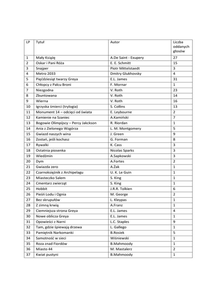 LP Tytuł Autor Liczba oddanych głosów 1 2 3 4 5 6 7 8 9 10 11 12 13 14 15 16 17 18 19 20 21 22 23 24 25 26 27 28 29 30 31 32 33 34 35 36 37 Mały Książę Oskar i Pani Róża Snajper Metro 2033 Pięćdziesiąt twarzy Greya Chłopcy z Palcu Broni Niezgodna Zbuntowana Wierna Igrzyska śmierci (trylogia) Monument 14 – odcięci od świata Kamienie na Szaniec Bogowie Olimpijscy – Percy Jakckson Ania z Zielonego Wzgórza Gwiazd naszych wina Zostań, jeśli kochasz Rywalki Ostatnia piosenka Wiedźmin Dym Gwiazda zero Czarnoksiężnik z Archipelagu Miasteczko Salem Cmentarz zwierząt Hobbit Pieśń Lodu i Ognia Bez skrupułów Z zimną krwią Ciemniejsza strona Greya Nowe oblicza Greya Opowieści z Narni Tam, gdzie śpiewają drzewa Pamiętnik Narkomanki Samotność w sieci Roza znad Fiordów Miasto 44 Kwiat pustyni A.De Saint - Exupery E. E. Schmitt Piotr Mittelstaedt Dmitry Glukhovsky E.L. James F. Mornar V. Roth V. Roth V. Roth S. Collins E. Leybourne A.Kamiński R. Riordan L. M. Montgomery J. Green G. Forman K. Cass Nicolas Sparks A.Sapkowski A.Fortes A.Żak U. K. Le Guin S. King S. King J.R.R. Tolkien M. George L. Kleypas A.Franz E.L. James E.L. James L.C. Staples L. Gallego B.Rosiek Wiśniewski B.Mahmoody M. Mastalerz B.Mahmoody 27 15 3 4 31 1 23 14 16 13 2 7 1 5 9 8 3 3 3 2 1 1 1 1 6 2 1 1 4 1 9 1 5 1 1 2 1 38 39 40 41 42 43 44 45 46 47 48 49 50 51 52 53 54 55 56 57 58 59 60 61 62 63 64 65 66 67 68 69 70 71 72 73 74 75 76 77 78 Tylko razem z córką Wyspa skarbów Houston mamy problem Wesele Zaklinacz koni Dzieci z Bullerbyn Alicja Mój Kary Niebo istnieje naprawdę Krótka historia czasu Cztery Ostatnia spowiedź Niebo jest wszędzie Trzy metry nad niebem Tylko ciebie chcę Upadli Dla ciebie wszystko Obcy Czerwona piramida Dary Anioła: Miasto kości Skrzywdzona Tam, gdzie spadają Anioły Wróć, jeśli pamiętasz Millenium: Zamek z piasku, który runął Millenium: Dziewczyna z tatuażem Millenium: Mężczyźni, którzy nienawidzą kobiet Synowie Boga Pułapka uczuć Hopeless Mroczne umysły Dziewczyna w czerwonej pelerynie Kwiaty na poddaszu Carrie Historia Lisley Czerwona królowa Love, Rose Tajemnica morskiej latarni Płomień pod moją skórą Oddech nocy Oddychając z trudem Powód by oddychać B.Mahmoody R. Stevenson K. Grochola P. Ptasińska N. Evans A.Lindgren J. Piekara A.Sewell T. Burpo S. Hawking Veronica Roth N. Reichter J. Nelson F. Moccia F. Moccia K. Lauren Nicolas Sparks A.Petocz R. Riordan C.Clare C.Glass D. Terakowska G. Forman S. Larsson S. Larsson S. Larsson 1 1 1 1 1 3 3 1 1 1 3 1 3 2 2 1 1 2 2 2 1 2 1 1 1 1 M.D.Lachlan H. Colleen H. Colleen A.Bracken S. Blakley-Cartwright F. C. Andrews Stephen King Stephen King V. E. Aveyard C.Ahern S. Montefiore A.Tood R. Donavan R. Donavan R. Donavan 2 1 3 1 2 2 1 1 4 3 1 1 1 1 1