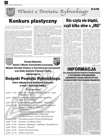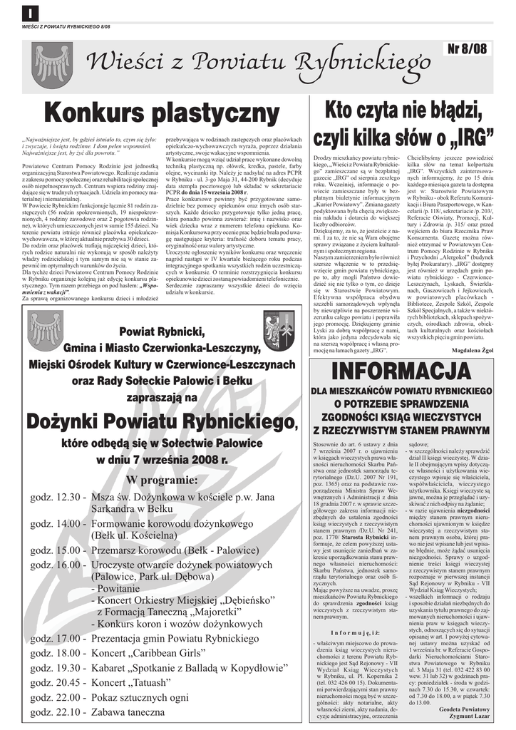 I WIEŚCI Z POWIATU RYBNICKIEGO 8/08 Nr 8/08 Konkurs plastyczny „Najważniejsze jest, by gdzieś istniało to, czym się żyło: i zwyczaje, i święta rodzinne. I dom pełen wspomnień. Najważniejsze jest, by żyć dla powrotu.” Powiatowe Centrum Pomocy Rodzinie jest jednostką organizacyjną Starostwa Powiatowego. Realizuje zadania z zakresu pomocy społecznej oraz rehabilitacji społecznej osób niepełnosprawnych. Centrum wspiera rodziny znajdujące się w trudnych sytuacjach. Udziela im pomocy materialnej i niematerialnej. W Powiecie Rybnickim funkcjonuje łącznie 81 rodzin zastępczych (56 rodzin spokrewnionych, 19 niespokrewnionych, 4 rodziny zawodowe oraz 2 pogotowia rodzinne), w których umieszczonych jest w sumie 155 dzieci. Na terenie powiatu istnieje również placówka opiekuńczowychowawcza, w której aktualnie przebywa 30 dzieci. Do rodzin oraz placówek trafiają najczęściej dzieci, których rodzice naturalni nie wykonują w sposób należyty władzy rodzicielskiej i tym samym nie są w stanie zapewnić im optymalnych warunków do życia. Dla tychże dzieci Powiatowe Centrum Pomocy Rodzinie w Rybniku organizuje kolejną już edycję konkursu plastycznego. Tym razem przebiega on pod hasłem: „Wspomnienia z wakacji”. Za sprawą organizowanego konkursu dzieci i młodzież przebywająca w rodzinach zastępczych oraz placówkach opiekuńczo-wychowawczych wyraża, poprzez działania artystyczne, swoje wakacyjne wspomnienia. W konkursie mogą wziąć udział prace wykonane dowolną techniką plastyczną np. ołówek, kredka, pastele, farby olejne, wycinanki itp. Należy je nadsyłać na adres PCPR w Rybniku - ul. 3-go Maja 31, 44-200 Rybnik (decyduje data stempla pocztowego) lub składać w sekretariacie PCPR do dnia 15 września 2008 r. Prace konkursowe powinny być przygotowane samodzielnie bez pomocy opiekunów oraz innych osób starszych. Każde dziecko przygotowuje tylko jedną pracę, która ponadto powinna zawierać: imię i nazwisko oraz wiek dziecka wraz z numerem telefonu opiekuna. Komisja Konkursowa przy ocenie prac będzie brała pod uwagę następujące kryteria: trafność doboru tematu pracy, oryginalność oraz walory artystyczne. Uroczyste ogłoszenie wyników konkursu oraz wręczenie nagród nastąpi w IV kwartale bieżącego roku podczas integracyjnego spotkania wszystkich rodzin uczestniczących w konkursie. O terminie rozstrzygnięcia konkursu opiekunowie dzieci zostaną powiadomieni telefonicznie. Serdecznie zapraszamy wszystkie dzieci do wzięcia udziału w konkursie. Powiat Rybnicki, Gmina i Miasto Czerwionka-Leszczyny, Miejski Ośrodek Kultury w Czerwionce-Leszczynach oraz Rady Sołeckie Palowic i Bełku zapraszają na Dożynki Powiatu Rybnickiego, które odbędą się w Sołectwie Palowice w dniu 7 września 2008 r. W programie: godz. 12.30 - Msza św. Dożynkowa w kościele p.w. Jana Sarkandra w Bełku godz. 14.00 - Formowanie korowodu dożynkowego (Bełk ul. Kościelna) godz. 15.00 - Przemarsz korowodu (Bełk - Palowice) godz. 16.00 - Uroczyste otwarcie dożynek powiatowych (Palowice, Park ul. Dębowa) - Powitanie - Koncert Orkiestry Miejskiej „Dębieńsko” z Formacją Taneczną „Majoretki” - Konkurs koron i wozów dożynkowych godz. 17.00 - Prezentacja gmin Powiatu Rybnickiego godz. 18.00 - Koncert „Caribbean Girls” godz. 19.30 - Kabaret „Spotkanie z Balladą w Kopydłowie” godz. 20.45 - Koncert „Tatuash” godz. 22.00 - Pokaz sztucznych ogni godz. 22.10 - Zabawa taneczna Kto czyta nie błądzi, czyli kilka słów o „IRG” Drodzy mieszkańcy powiatu rybnickiego, „Wieści z Powiatu Rybnickiego” zamieszczane są w bezpłatnej gazecie „IRG” od sierpnia zeszłego roku. Wcześniej, informacje o powiecie zamieszczane były w bezpłatnym biuletynie informacyjnym „Kurier Powiatowy”. Zmiana gazety podyktowana była chęcią zwiększenia nakładu i dotarcia do większej liczby odbiorców. Dziękujemy, za to, że jesteście z nami. I za to, że nie są Wam obojętne sprawy związane z życiem kulturalnym i społecznym regionu. Naszym zamierzeniem było również szersze włączenie w to przedsięwzięcie gmin powiatu rybnickiego, po to, aby mogli Państwo dowiedzieć się nie tylko o tym, co dzieje się w Starostwie Powiatowym. Efektywna współpraca obydwu szczebli samorządowych wpłynęła by niewątpliwie na poszerzenie wizerunku całego powiatu i poprawiła jego promocję. Dziękujemy gminie Lyski za dobrą współpracę z nami, która jako jedyna zdecydowała się na szerszą współpracę i własną promocję na łamach gazety „IRG”. Chcielibyśmy jeszcze powiedzieć kilka słów na temat kolportażu „IRG”. Wszystkich zainteresowanych informujemy, że po 15 dniu każdego miesiąca gazeta ta dostępna jest w: Starostwie Powiatowym w Rybniku - obok Referatu Komunikacji i Biura Paszportowego, w Kancelarii /p. 118/, sekretariacie /p. 203/, Referacie Oświaty, Promocji, Kultury i Zdrowia /p. 315/ oraz przed wejściem do biura Rzecznika Praw Konsumenta. Gazetę można również otrzymać w Powiatowym Centrum Pomocy Rodzinie w Rybniku i Przychodni „Alergokol” (budynek byłej Prokuratury). „IRG” dostępny jest również w urzędach gmin powiatu rybnickiego - CzerwionceLeszczynach, Lyskach, Świerklanach, Gaszowicach i Jejkowicach, w powiatowych placówkach Bibliotece, Zespole Szkól, Zespole Szkól Specjalnych, a także w niektórych bibliotekach, sklepach spożywczych, ośrodkach zdrowia, obiektach kulturalnych oraz kościołach wszystkich pięciu gmin powiatu. Magdalena Żgol INFORMACJA DLA MIESZKAŃCÓW POWIATU RYBNICKIEGO O POTRZEBIE SPRAWDZENIA ZGODNOŚCI KSIĄG WIECZYSTYCH Z RZECZYWISTYM STANEM PRAWNYM Stosownie do art. 6 ustawy z dnia 7 września 2007 r. o ujawnieniu w księgach wieczystych prawa własności nieruchomości Skarbu Państwa oraz jednostek samorządu terytorialnego (Dz.U. 2007 Nr 191, poz. 1365) oraz na podstawie rozporządzenia Ministra Spraw Wewnętrznych i Administracji z dnia 1