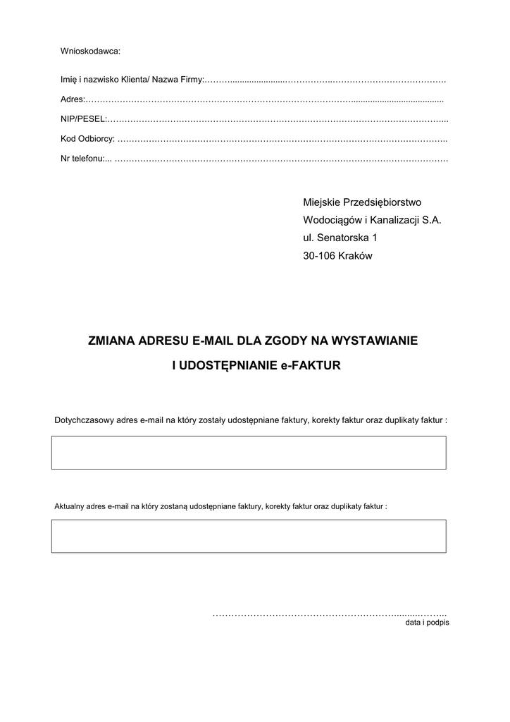 Wnioskodawca: Imię i nazwisko Klienta/ Nazwa Firmy:……….......................……………..…………………………………. Adres:…………………………………………………………………………………....................................... NIP/PESEL:………………………………………………………………………………………………………... Kod Odbiorcy: …………………………………………………………………………………………………….. Nr telefonu:... ……………………………………………………………………………………………………… Miejskie Przedsiębiorstwo Wodociągów i Kanalizacji S.A. ul. Senatorska 1 30-106 Kraków ZMIANA ADRESU E-MAIL DLA ZGODY NA WYSTAWIANIE I UDOSTĘPNIANIE e-FAKTUR Dotychczasowy adres e-mail na który zostały udostępniane faktury, korekty faktur oraz duplikaty faktur : Aktualny adres e-mail na który zostaną udostępniane faktury, korekty faktur oraz duplikaty faktur : ………………………………………….………..........……... data i podpis