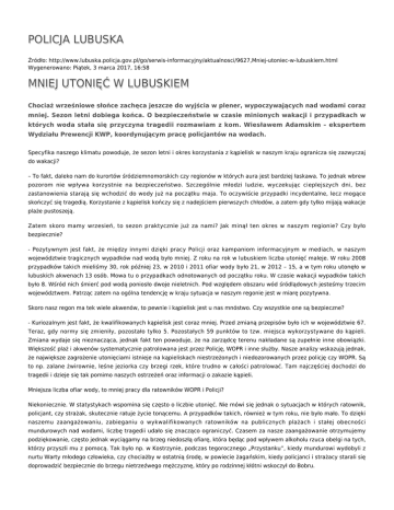 POLICJA LUBUSKA Źródło: http://www.lubuska.policja.gov.pl/go/serwis-informacyjny/aktualnosci/9627,Mniej-utoniec-w-lubuskiem.html Wygenerowano: Piątek, 3 marca 2017, 16:58 MNIEJ UTONIĘĆ W LUBUSKIEM Chociaż wrześniowe słońce zachęca jeszcze do wyjścia w plener, wypoczywających nad wodami coraz mniej. Sezon letni dobiega końca. O bezpieczeństwie w czasie minionych wakacji i przypadkach w których woda stała się przyczyna tragedii rozmawiam z kom. Wiesławem Adamskim – ekspertem Wydziału Prewencji KWP, koordynującym pracę policjantów na wodach. Specyfika naszego klimatu powoduje, że sezon letni i okres korzystania z kąpielisk w naszym kraju ogranicza się zazwyczaj do wakacji? – To fakt, daleko nam do kurortów śródziemnomorskich czy regionów w których aura jest bardziej łaskawa. To jednak wbrew pozorom nie wpływa korzystnie na bezpieczeństwo. Szczególnie młodzi ludzie, wyczekując cieplejszych dni, bez zastanowienia starają się wchodzić do wody już na początku maja. To oczywiście przypadki incydentalne, lecz mogące skończyć się tragedią. Korzystanie z kąpielisk kończy się z nadejściem pierwszych chłodów, a zatem gdy tylko mijają wakacje plaże pustoszeją. Zatem skoro mamy wrzesień, to sezon praktycznie już za nami? Jak minął ten okres w naszym regionie? Czy było bezpiecznie? - Pozytywnym jest fakt, że między innymi dzięki pracy Policji oraz kampaniom informacyjnym w mediach, w naszym województwie tragicznych wypadków nad wodą było mniej. Z roku na rok w lubuskiem liczba utonięć maleje. W roku 2008 przypadków takich mieliśmy 30, rok później 23, w 2010 i 2011 ofiar wody było 21, w 2012 – 15, a w tym roku utonęło w lubuskich akwenach 13 osób. Mowa tu o przypadkach odnotowanych od początku roku. W czasie wakacji wypadków takich było 8. Wśród nich śmierć pod wodą poniosło dwoje nieletnich. Pod względem obszaru wód śródlądowych jesteśmy trzecim województwem. Patrząc zatem na ogólna tendencję w kraju sytuacja w naszym regonie jest w miarę pozytywna. Skoro nasz regon ma tek wiele akwenów, to pewnie i kąpielisk jest u nas mnóstwo. Czy wszystkie one są bezpieczne? - Kuriozalnym jest fakt, że kwalifikowanych kąpielisk jest coraz mniej. Przed zmianą przepisów było ich w województwie 67. Teraz, gdy normy się zmieniły, pozostało tylko 5. Pozostałych 59 punktów to tzw. miejsca wykorzystywane do kąpieli. Zmiana wydaje się nieznacząca, jednak fakt ten powoduje, że na zarządcę terenu nakładane są zupełnie inne obowiązki. Większość plaż i akwenów systematycznie patrolowana jest przez Policję, WOPR i inne służby. Nasze analizy wskazują jednak, że największe zagrożenie utonięciami istnieje na kąpieliskach niestrzeżonych i niedozorowanych przez policję czy WOPR. Są to np. zalane żwirownie, leśne jeziorka czy brzegi rzek, które trudno w całości patrolować. Tam najczęściej dochodzi do tragedii i dzieje się tak pomimo naszych ostrzeżeń oraz informacji o zakazie kąpieli. Mniejsza liczba ofiar wody, to mniej pracy dla ratowników WOPR i Policji? Niekoniecznie. W statystykach wspomina się często o liczbie utonięć. Nie mówi się jednak o sytuacjach w których ratownik, policjant, czy strażak, skutecznie ratuje życie tonącemu. A przypadków takich, również w tym roku, nie było mało. To dzięki naszemu zaangażowaniu, zabieganiu o wykwalifikowanych ratowników na publicznych plażach i stałej obecności mundurowych nad wodami, liczbę tragedii udało się znacząco ograniczyć. Czasem za nasze zaangażowanie otrzymujemy podziękowanie, często jednak wyciągamy na brzeg niedoszłą ofiarę, która będąc pod wpływem alkoholu rzuca obelgi na tych, którzy przyszli mu z pomocą. Tak było np. w Kostrzynie, podczas tegorocznego „Przystanku”, kiedy mundurowi wydobyli z nurtu Warty młodego człowieka, czy chociażby w ostatnią środę, w powiecie żagańskim, kiedy policjanci i strażacy starali się doprowadzić bezpiecznie do brzegu nietrzeźwego mężczyznę, który po rodzinnej kłótni wskoczył do Bobru. Co najczęściej stanowi przyczyny tragedii? Czy okoliczności utonięć są niezmienne? - Przyczyny utonięć z reguły są podobne. Przede wszystkim mogę wśród nich wskazać łączenie wypoczynku nad wodą z piciem alkoholu, brawurę i przecenianie własnych umiejętności oraz brak nadzoru nad dziećmi, które wchodzą do wody nie umiejąc pływać. Trudno usprawiedliwiać sytuację, w której młodzi ludzie, bez wcześniejszego przygotowania, decydują się by przepłynąć duże jezioro i po kilkuset metrach jeden z nich słabnie. Lub kiedy w środku nocy, po suto zakrapianej alkoholem imprezie, towarzystwo decyduje się by skakać z pomostu do wody, albo zachowanie wędkarza, który chcąc się ochłodzić w czasie upału zanurza się w nurcie rzeki. W takich przypadkach opamiętanie przychodzi zbyt późno. Czasem dopiero wtedy, gdy już nie ma ratunku. Czy patrząc na ten problem obiektywnie jesteśmy w stanie stan ten poprawić? - Niebagatelną rolę odgrywa świadomość. Z tego powodu przed sezonem letnim pojawia się mnóstwo informacji medialnych, których zadaniem jest zapobieganie utonięciom. Coraz więcej młodzieży korzysta z bezpłatnej nauki pływania, którą objęto znaczną część uczniów. Ze swojej strony, jako lubuska Policja, będziemy zabiegać o jeszcze większa liczbę patroli wykonywanych wspólnie z WOPR i Strażą Rybacką. To wszystko jednak przyniesie skutek, gdy wchodzący do wody liczyć się będą z zagrożeniem. Kiedy zdrowego rozsądku i rozwagi zabraknie, zdani będziemy na samego siebie, a wówczas o tragedię nietrudno. Dziękuję za rozmowę Rozmawiał podkom. Sławomir konieczny Rzecznik Prasowy KWP w Gorzowie Wlkp. tel. 519 534 647 Mniej utonięć w lubuskiem Mniej utonięć w lubuskiem Mniej utonięć w lubuskiem Ocena: 0/5 (0) Tweetnij