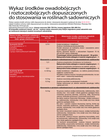 1 Wykaz środków owadobójczych i roztoczobójczych dopuszczonych do stosowania w roślinach sadowniczych Nazwa środka, zawartość substancji czynnej, określenie toksyczności dla ludzi i grupa chemiczna Polecana dawka na 1 ha Właściwości środka, zwalczane szkodniki oraz sposób użycia środka 1 2 3 0,75 l Działa kontaktowo i żołądkowo. Zwalcza miodówkę gruszową plamistą. Środek stosować po kwitnieniu drzew i zauważeniu pierwszych objawów uszkodzeń. Można stosować łącznie z adiuwantem Superam 10 AL (50 ml/100 l cieczy użytkowej). Przestrzegać okresu prewencji dla pszczół – 96 godzin. Maksymalna liczba zabiegów w sezonie wegetacyjnym – 1. Acaramik 018 EC 18 g abamektyny w 1 l szkodliwy produkt naturalny z grupy makrocyklicznych laktonów Stosowanie w uprawach małoobszarowych na odpowiedzialność użytkownika 1,2 l 0,5 l Acetamip 20 SP 20% acetamiprydu szkodliwy związek z grupy neonikotynoidów 0,125 kg Zwalcza przędziorka chmielowca na truskawce. Maksymalna liczba zabiegów w sezonie wegetacyjnym – 1. Zwalcza przędziorka chmielowca na malinie i jeżynie. Maksymalna liczba zabiegów w sezonie wegetacyjnym – 2. Działa kontaktowo i żołądkowo, na roślinie powierzchniowo, wgłębnie i systemicznie. Na jabłoni zwalcza mszyce i toczyka gruszkowiaczka, na czereśni i wiśni – nasionnicę trześniówkę. 0,2 kg Zwalcza owocówkę jabłkóweczkę. 0,3 kg Zwalcza opuchlaki na plantacjach truskawki. Zabieg wykonywać po zbiorze owoców opryskując rośliny i glebę pod nimi. Stosowanie w uprawach małoobszarowych na odpowiedzialność użytkownika 0,2 kg Na gruszy zwalcza zwójkę bukóweczkę, siatkóweczkę, różóweczkę oraz inne zwójki i młode gąsienice zjadające liście, miodówkę gruszową plamistą, czerwoną, żółtą, śluzownicę ciemną, kwieciaka gruszowca, pryszczarka gruszowca. Na śliwie zwalcza misecznika śliwowego, zwójkę bukóweczkę, siatkóweczkę, różóweczkę i inne zwójki oraz inne młode gąsienice zjadające liście. Na wiśni i czereśni zwalcza śluzownicę ciemną, licinka tajniaczka, kwieciaka pestkowca, zwójkę bukóweczkę, siatkóweczkę, różóweczkę i inne zwójki oraz inne młode gąsienice zjadające liście. Na moreli i brzoskwini zwalcza mszyce, zwójkę bukóweczkę, siatkóweczkę, różóweczkę i inne zwójki oraz inne młode gąsienice zjadające liście. Na winorośli zwalcza mszyce, ogrodnicę niszczylistkę, zwójkę bukóweczkę, siatkóweczkę, różóweczkę i inne zwójki oraz inne młode gąsienice zjadające liście. Na borówce amerykańskiej zwalcza mszyce, ogrodnicę niszczylistkę, pryszczarka borówkowa, zwójkę bukóweczkę, siatkóweczkę, różóweczkę i inne zwójki oraz inne młode gąsienice zjadające liście. Program Ochrony Roślin Sadowniczych | 2016 SZ KODNI K I/w yk a z Zooc yd ó w Wykaz zawiera środki ochrony roślin dopuszczone do obrotu i stosowania decyzjami wydanymi do dnia 30.04.2016 r. (rejestr środków ochrony roślin dopuszczonych do obrotu i stosowania zezwoleniem Ministra Rolnictwa i Rozwoju Wsi: http://www.bip.minrol.gov.pl). Najczęściej stosowana ilość cieczy: drzewa owocowe 500–750 l/ha, krzewy jagodowe 500–900 l/ha. W przypadku podanych dawek „od–do”, wyższą należy stosować przy dużym zagrożeniu przez szkodniki oraz do zwalczania starszych stadiów larwalnych szkodników. 2 1 SZ KOD NI K I/w yk a z Zooc yd ó w cd. – Acetamip 20 SP Acetamipryd 20 SP 20% acetamiprydu neonikotynoidy 2 3 0,2 kg Na leszczynie zwalcza mszyce, zwójka siatkóweczka, różóweczka i inne zwójki oraz inne młode gąsienice zjadające liście. Na malinie zwalcza krzywika maliniaczka, kwieciaka malinowca, kostnika malinowca, pryszczarka namalinka łodygowego, przeziernika malinowca, mszyce, zwójka siatkóweczka, różóweczka i inne zwójki oraz inne młode gąsienice zjadające liście. Na porzeczkach zwalcza krzywika porzeczkowiaczka, przyszczarka porzeczkowiaczka liściowego, owocnicę porzeczkową, przeziernika porzeczkowiaczka, mszyce, zwójkę siatkóweczkę, różóweczkę i inne zwójki oraz inne młode gąsienice zjadające liście. Na agreście zwalcza przeziernika porzeczkowiaczka, mszyce, zwójkę siatkóweczkę, różóweczkę i inne zwójki oraz inne młode gąsienice zjadające liście. Na truskawce zwalcza kwieciaka malinowca i zmieniki. 0,125–0,4 kg Działa kontaktowo i żołądkowo, przeznaczony do zwalczania szkodników ssących i gryzących w uprawie jabłoni, wiśni, czereśni, gruszy, śliwy, truskawki. Stosowanie w uprawach małoobszarowych na odpowiedzialność użytkownika 0,2 kg Program Ochrony Roślin Sadowniczych | 2016 Na gruszy zwalcza zwójkę bukóweczkę, siatkóweczkę, różóweczkę oraz inne zwójki i młode gąsienice zjadające liście, miodówkę gruszową plamistą, miodówkę gruszową czerwoną, miodówkę gruszową żółtą, śluzownicę ciemną, kwieciaka gruszowca, pryszczarka gruszowca. Na śliwie zwalcza misecznika śliwowego, zwójkę bukóweczkę, zwójkę siatkóweczkę, zwójkę różóweczkę i inne zwójki oraz inne młode gąsienice zjadające liście. Na wiśni i czereśni zwalcza śluzownicę ciemną, licinka tajniaczka, kwieciaka pestkowca, zwójkę bukóweczkę, zwójkę siatkóweczkę, zwójkę różóweczkę i inne zwójki oraz inne młode gąsienice zjadające liście. Na moreli i brzoskwini zwalcza mszyce, zwójkę bukóweczkę, zwójkę siatkóweczkę, zwójkę różóweczkę i inne zwójki oraz inne młode gąsienice zjadające liście. Na winorośli zwalcza mszyce, ogrodnicę niszczylistkę, zwójkę bukóweczkę, zwójkę siatkóweczkę, zwójkę różóweczkę i inne zwójki oraz inne młode gąsienice zjadające liście. Na borówce amerykańskiej zwalcza mszyce, ogrodnicę niszczylistkę, pryszczarka borówkowa, zwójkę bukóweczkę, zwójkę siatkóweczkę, zwójkę różóweczkę i inne zwójki oraz inne młode gąsienice zjadające liście. Na leszczynie zwalcza mszyce, zw
