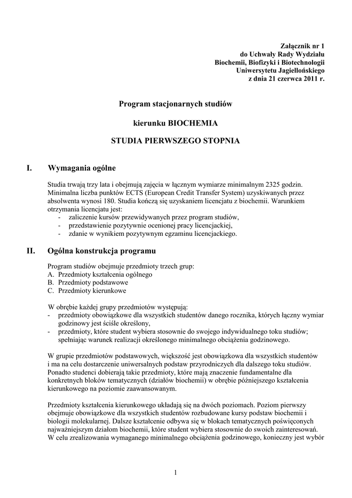 Załącznik nr 1 do Uchwały Rady Wydziału Biochemii, Biofizyki i Biotechnologii Uniwersytetu Jagiellońskiego z dnia 21 czerwca 2011 r. Program stacjonarnych studiów kierunku BIOCHEMIA STUDIA PIERWSZEGO STOPNIA I. Wymagania ogólne Studia trwają trzy lata i obejmują zajęcia w łącznym wymiarze minimalnym 2325 godzin. Minimalna liczba punktów ECTS (European Credit Transfer System) uzyskiwanych przez absolwenta wynosi 180. Studia kończą się uzyskaniem licencjatu z biochemii. Warunkiem otrzymania licencjatu jest: - zaliczenie kursów przewidywanych przez program studiów, - przedstawienie pozytywnie ocenionej pracy licencjackiej, - zdanie w wynikiem pozytywnym egzaminu licencjackiego. II. Ogólna konstrukcja programu Program studiów obejmuje przedmioty trzech grup: A. Przedmioty kształcenia ogólnego B. Przedmioty podstawowe C. Przedmioty kierunkowe W obrębie kaŜdej grupy przedmiotów występują: - przedmioty obowiązkowe dla wszystkich studentów danego rocznika, których łączny wymiar godzinowy jest ściśle określony, - przedmioty, które student wybiera stosownie do swojego indywidualnego toku studiów; spełniając warunek realizacji określonego minimalnego obciąŜenia godzinowego. W grupie przedmiotów podstawowych, większość jest obowiązkowa dla wszystkich studentów i ma na celu dostarczenie uniwersalnych podstaw przyrodniczych dla dalszego toku studiów. Ponadto studenci dobierają takie przedmioty, które mają znaczenie fundamentalne dla konkretnych bloków tematycznych (działów biochemii) w obrębie późniejszego kształcenia kierunkowego na poziomie zaawansowanym. Przedmioty kształcenia kierunkowego układają się na dwóch poziomach. Poziom pierwszy obejmuje obowiązkowe dla wszystkich studentów rozbudowane kursy podstaw biochemii i biologii molekularnej. Dalsze kształcenie odbywa się w blokach tematycznych poświęconych najwaŜniejszym działom biochemii, które student wybiera stosownie do swoich zainteresowań. W celu zrealizowania wymaganego minimalnego obciąŜenia godzinowego, konieczny jest wybór 1 trzech bloków tematycznych. Tym samym system ten nie generuje wąskiej specjalizacji, która byłaby niepoŜądana na szczeblu studiów pierwszego stopnia. KaŜdy blok tematyczny otwierają dwa duŜe kursy wiodące, obowiązkowe dla studentów, którzy wybrali dany blok. Bloki zawierają ponadto kursy uzupełniające, które student, uczestniczący w danym bloku tematycznym, wybiera tak, aby zrealizować wymagane dla danego bloku minimalne obciąŜenie godzinowe. Modułowa organizacja programu studiów pozwala w sposób przejrzysty przypisać określone cele dydaktyczne konkretnym latom i semestrom (patrz p. VI). a jednocześnie oferuje studentom moŜliwość indywidualnego, zgodnego z zainteresowaniami doboru zajęć. III. Grupy przedmiotów i minimalne obciąŜenia godzinowe A. Przedmioty kształcenia ogólnego B. Przedmioty podstawowe C. Przedmioty kierunkowe Razem Praca licencjacka Razem 300 godz./ 15 ECTS 975 godz./ 78 ECTS 1050 godz./ 78 ECTS 2325 godz. /171 ECTS 9 ECTS 180 ECTS IV. Wykaz przedmiotów w grupach A. Przedmioty kształcenia ogólnego ECTS 210 godz. 9 5 2 2 ≥ 90 godz. ≥6 4 3 2 1 Obowiązkowe 855 godz. Matematyka, fizyka i przedmioty pokrewne 270 godz. Matematyka 75 godz. Informatyka 45 godz. Statystyka 30 godz. Fizyka 60 godz. Biofizyka 60 godz. 68 23 6 4 3 5 5 - Obowiązkowe Lektorat 1 Wychowanie fizyczne Filozofia 120 godz. 60 godz. 30 godz. - Do wyboru Lektorat 2 60 godz. Zarys ekonomii 45 godz. UŜytkowe programy komputerowe 30 godz. Ochrona własności intelektualnej 15 godz. Inne kursy z oferty programowej UJ (studiów I stopnia lub 1–3 roku studiów jednolitych) B. Przedmioty podstawowe - 2 Chemia Chemia ogólna i nieorganiczna Chemia organiczna Chemia fizyczna Biologia Biologia komórki Genetyka Biologia ewolucyjna Ekologia Mikrobiologia Bioinformatyka Bioetyka - Do wyboru Fizjologia roślin Fizjologia zwierząt i człowieka Immunologia Analityka chemiczna Podstawy chemii kwantowej 285 godz. 23 9 9 5 22 8 2 2 2 3 3 2 105 godz. 105 godz. 75 godz. 225 godz. 90 godz. 30 godz. 30 godz. 30 godz. 45 godz. 45 godz. 30 godz. 60 godz. 60 godz. 60 godz. 60 godz. 90 godz. ≥ 120 godz. ≥ 10 5 5 5 5 10 C. Przedmioty kierunkowe - Poziom I (obowiązkowy) Podstawy biochemii Podstawy biologii molekularnej Kierunki współczesnej biochemii 300 godz. 27 17 8 2 ≥ 750 godz. 51 180 godz. 90 godz. 30 godz. - Poziom II (do wyboru) Blok 1 (ZM + ZI): Biochemia i genetyka molekularna mikroorganizmów Kursy wiodące (obowiązkowe): Biochemia i fizjologia mikroorganizmów Biologia molekularna prokariontów Kursy uzupełniające (do wyboru): Wirusologia molekularna Mikrobiologia ekologiczna Mikrobiologia przemysłowa Praktikum z genetyki molekularnej bakterii Mikrobiologia komórkowa Bakteryjne choroby infekcyjne i ich modele Molekularne metody diagnostyczne chorób infekcyjnych Pracownia licencjacka 3 ≥ 250 godz. ≥ 17 75 godz. 60 godz. 6 4 30 godz. 15 godz. 15 godz. 2 1 1 60 godz. 15 godz. 3 1 30 godz. 2 15 godz. 30 godz. 1 2 Blok 2 (ZBchF + ZBchA, ZBf, ZFBchR, PBfK, ZBBO): Biochemia fizyczna i strukturalna ≥ 250 godz. ≥ 17 Kursy wiodące (obowiązkowe): Biochemia fizyczna 105 godz. 8 Chemia i struktura kwasów nukleinowych 30 godz. 2 Kursy uzupełniające (do wyboru): Enzymologia molekularna 60 godz. 4 Chemia białek 30 godz. 2 Biofizyka białek 60 godz. 4 Biofizyka lipidów i błon biologicznych 30 godz. 2 Biofizyka komórki 45 godz. 3 Bioenergetyka molekularna 60 godz. 3 Modelowanie molekularne 60 godz. 4 Pracownia licencjacka 30 godz. 2 Blok 3 (ZBchA + ZBf, ZFBchR): Biochemia analityczna i stosowana Kursy wiodące (obowiązkowe): Biochemia analityczna Preparatyka i analityka białek Kursy uzupełniające (do wyboru): Bioelektrochemia Chromatografia gazowa Proteomika Białka immobilizowane Wstęp do bionanotechnologii Biosensory Białka rekombinowane Pracownia licencjacka ≥ 250 godz. ≥ 17 75 godz. 60 godz. 6 4 30 god