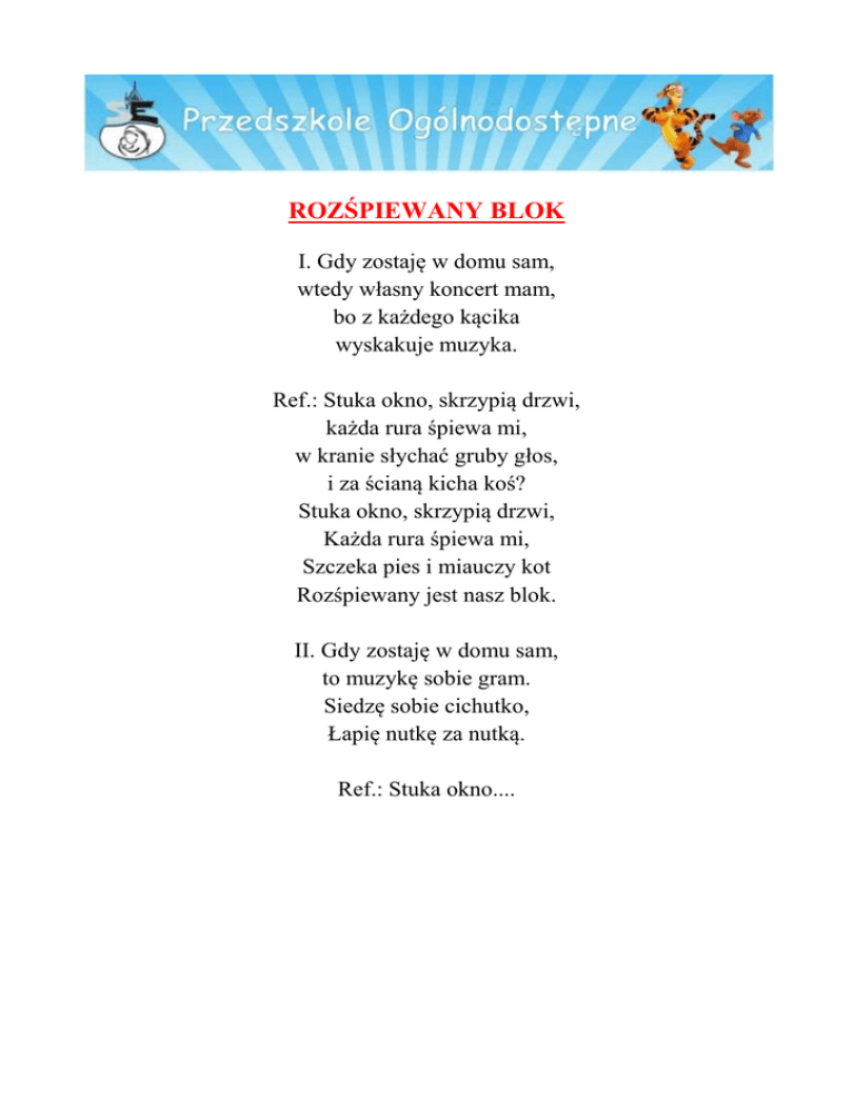 ROZŚPIEWANY BLOK I. Gdy zostaję w domu sam, wtedy własny koncert mam, bo z każdego kącika wyskakuje muzyka. Ref.: Stuka okno, skrzypią drzwi, każda rura śpiewa mi, w kranie słychać gruby głos, i za ścianą kicha koś? Stuka okno, skrzypią drzwi, Każda rura śpiewa mi, Szczeka pies i miauczy kot Rozśpiewany jest nasz blok. II. Gdy zostaję w domu sam, to muzykę sobie gram. Siedzę sobie cichutko, Łapię nutkę za nutką. Ref.: Stuka okno.... ,,NIEDŹWIADKI – NIEJADKI” "Żyły w lesie małe misie A tych misiów było sześć Siadły raz przy pełnej misie Ale żaden nie chciał jeść Ref. Co tu robić? 2x Nie chcą misie jeść Co tu robić 2x Nie chcą misie jeść Prosi mama niedźwiedziowa Prosi tata, duży miś ,,Moi mili jedzcie obiad Dobry miodek mamy dziś” Ref. Co tu robić........ Zjadła mama, zjadł i tata A niedźwiadki – hopsa – w las ,,Co tam obiad, mała strata Tysiąc przygód czeka nas” Ref. Co tu robić........ Wyhasały się niedźwiadki Jeść wołają wszystkie sześć – ,, Wielka szkoda” – mówi mama ,,Ale nie ma już co jeść?” – Mówią misie: ,,Oj chce mi się, oj chce mi się jeść” – Biedne misie, głodne misie Co nie chciały jeść"