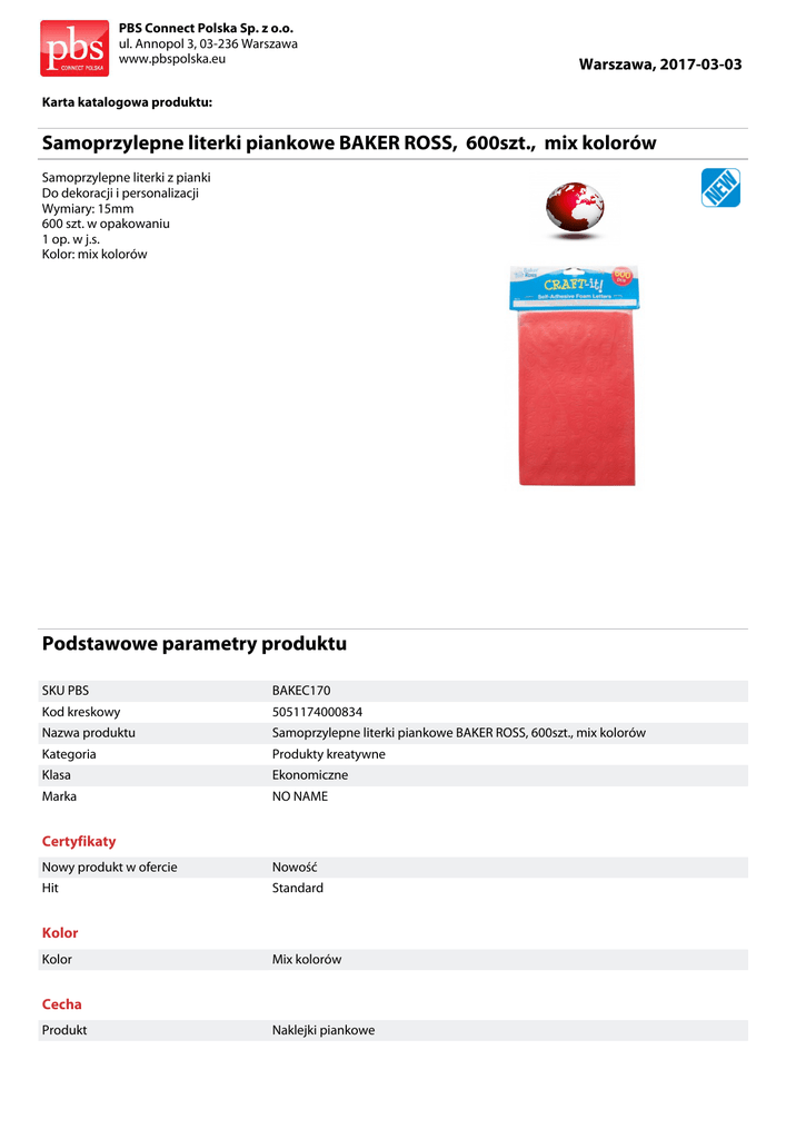 PBS Connect Polska Sp. z o.o. ul. Annopol 3, 03-236 Warszawa www.pbspolska.eu Warszawa, 2017-03-03 Karta katalogowa produktu: Samoprzylepne literki piankowe BAKER ROSS, 600szt., mix kolorów Samoprzylepne literki z pianki Do dekoracji i personalizacji Wymiary: 15mm 600 szt. w opakowaniu 1 op. w j.s. Kolor: mix kolorów Podstawowe parametry produktu SKU PBS BAKEC170 Kod kreskowy 5051174000834 Nazwa produktu Samoprzylepne literki piankowe BAKER ROSS, 600szt., mix kolorów Kategoria Produkty kreatywne Klasa Ekonomiczne Marka NO NAME Certyfikaty Nowy produkt w ofercie Nowość Hit Standard Kolor Kolor Mix kolorów Cecha Produkt Naklejki piankowe PBS Connect Polska Sp. z o.o. ul. Annopol 3, 03-236 Warszawa www.pbspolska.eu Warszawa, 2017-03-03 Karta katalogowa produktu cd. Samoprzylepne literki piankowe BAKER ROSS, 600szt., mix kolorów Podstawowe parametry produktu Typ Dekoracja Rodzaj Literki Materiał Pianka W ofercie od 2016-10 Wymiary Wymiary (mm) 15 Jednostki logistyczne Opakowanie 1 24 szt Opakowanie 2 50 szt