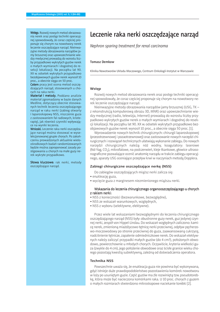 Wspó³czesna Onkologia (2005) vol. 9; 3 (84–88) Wstêp. Rozwój nowych metod obrazowania nerek oraz postêp techniki operacyjnej spowodowa³y, ¿e coraz czêœciej proponuje siê chorym na nowotwory nerek leczenie oszczêdzaj¹ce narz¹d. Nieinwazyjne metody obrazowania narz¹dów jamy brzusznej oraz upowszechnianie wiedzy medycznej prowadz¹ do wzrostu liczby przypadkowo wykrytych guzów nerek o ma³ych wymiarach i dogodnej do resekcji lokalizacji. Na pocz¹tku lat 90. XX w. odsetek wykrytych przypadkowo bezobjawowych guzów nerek wynosi³ 10 proc., a obecnie siêga on 50 proc. Celem pracy jest ocena metod oszczêdzaj¹cych narz¹d, stosowanych u chorych na raka nerki. Materia³ i metody. Poddano analizie materia³ zgromadzony w bazie danych Medline, dotycz¹cy obecnie stosowanych technik leczenia oszczêdzaj¹cego narz¹d w raku nerki (zabieg otwarty i laparoskopowy NSS, niszczenie guza z zastosowaniem fal radiowych, krioterapiê), jak równie¿ czynniki wp³ywaj¹ce na wyniki leczenia. Wnioski. Leczenie raka nerki oszczêdzaj¹ce narz¹d mo¿na stosowaæ w wyselekcjonowanej grupie chorych. Po zakoñczeniu prowadzonych aktualnie wielooœrodkowych badañ randomizowanych bêdzie mo¿na zaproponowaæ zasady postêpowania u chorych na ma³e guzy nerek wykryte przypadkowo. S³owa kluczowe: rak nerki, metody oszczêdzaj¹ce narz¹d. Leczenie raka nerki oszczêdzaj¹ce narz¹d Nephron sparing treatment for renal carcinoma Tomasz Demkow Klinika Nowotworów Uk³adu Moczowego, Centrum Onkologii-Instytut w Warszawie Wstêp Rozwój nowych metod obrazowania nerek oraz postêp techniki operacyjnej spowodowa³y, ¿e coraz czêœciej proponuje siê chorym na nowotwory nerek leczenie oszczêdzaj¹ce narz¹d. Nieinwazyjne metody obrazowania narz¹dów jamy brzusznej (USG, TK – z rekonstrukcj¹ komputerow¹ obrazu 3D, MNR) oraz upowszechnianie wiedzy medycznej (radio, telewizja, Internet) prowadz¹ do wzrostu liczby przypadkowo wykrytych guzów nerek o ma³ych wymiarach i dogodnej do resekcji lokalizacji. Na pocz¹tku lat 90. XX w. odsetek wykrytych przypadkowo bezobjawowych guzów nerek wynosi³ 10 proc., a obecnie siêga 50 proc. [1]. Wprowadzenie nowych technik chirurgicznych: chirurgii laparoskopowej (przezotrzewnowej i pozaotrzewnowej) oraz zastosowanie nowych narzêdzi chirurgicznych i rozwi¹zañ technicznych u³atwiaj¹ wykonanie zabiegu. Do nowych narzêdzi chirurgicznych nale¿¹: nó¿ wodny, koagulatory: laserowe (Nd-Yag, CO2), mikrofalowe, na podczerwieñ, kleje tkankowe, g³owice ultrasonograficzne pozwalaj¹ce oceniæ anatomiê narz¹du w trakcie zabiegu operacyjnego, aparaty USG oceniaj¹ce przep³yw krwi w naczyniach metod¹ Dopplera. Zabiegi chirurgiczne oszczêdzaj¹ce nerkê (NSS) Do zabiegów oszczêdzaj¹cych mi¹¿sz nerki zalicza siê: • enukleacjê guza, • wyciêcie guza z marginesem niezmienionego mi¹¿szu nerki. Wskazania do leczenia chirurgicznego organooszczêdzaj¹cego u chorych z rakiem nerki: • NSS z koniecznoœci (bezwarunkowe, bezwzglêdne), • NSS ze wskazañ warunkowych, wzglêdnych, • NSS z wyboru (selektywne, elektywne). Przez wiele lat wskazaniami bezwzglêdnymi do leczenia chirurgicznego oszczêdzaj¹cego narz¹d (NSS) by³y: obustronne guzy nerek, guz jedynej czynnej nerki, zespó³ von Hippel-Lindau. Do wskazañ wzglêdnych zaliczono: kamicê nerek, zmienion¹ mia¿d¿ycowo têtnicê nerki przeciwnej, odp³yw pêcherzowo-moczowodowy po stronie przeciwnej do guza, zaawansowan¹ cukrzycê, nadciœnienie têtnicze, zapalenie odmiedniczkowe nerek. Do wskazañ elektywnych nale¿y zaliczyæ przypadki ma³ych guzów (do 4 cm?), po³o¿onych obwodowo, powierzchownie u m³odych chorych. Oczywiœcie, kryteria wielkoœci guza (zwykle do 4 cm), jego po³o¿enie obwodowe oraz œcis³e granice wieku chorego pozostaj¹ kwesti¹ subiektywn¹, zale¿n¹ od doœwiadczenia operatora. Technika NSS Powszechnie uwa¿a siê, ¿e enukleacja guza nie powinna byæ wykonywana, gdy¿ istnieje du¿e prawdopodobieñstwo pozostawienia komórek nowotworu w lo¿y po usuniêtym guzie. Czêœæ guzów ma Ÿle rozwiniêt¹ tzw. pseudotorebkê, która mo¿e byæ nacieczona komórkami raka. U 10 proc. chorych z guzem o ma³ych rozmiarach stwierdzono mikroskopowe naciekanie torebki [2]. Wspó³czesna Onkologia (2005) vol. 9; 3 (84–88) Introduction. The growing number of kidney cancer patients treated by nephron sparing methods can be explained by the improvement of surgical technique and diagnostic methods. Imaging of the abdomen organs using the non invasive methods and making the medical knowledge more common lead to increase number of the new diagnose tumor cases in small size, low stage and easy to removed by surgery. In the beginning of the 90’s the percentage of the randomly diagnosed asymptomatic kidney tumor cases was at the level of 10% and now reached the level of the 50%. Purpose. The aim of the study is assessment of the nephron sparing treatment methods in renal cancer patients. Material and methods. Medline computerized literature searches were performed to identify methods of the nephron sparing treatments in renal cancer patients (surgical procedure and laparoscopy and tumor removing using the radiofrequency ablation r and cryotherapy) as well as the factors influencing on the final treatment results. Conclusions. Nephron sparing treatment provides effective therapy in selective group of renal cancer patients. Atfter the end of the currently caring multicentre randomised trials could be possible to propose a new treatment standards in small size tumors patient cases randomly diagnosed. Key words: renal cell carcinoma, nephron sparing methods. Tab. 1. Powik³ania po NSS (proc.) [3] Table 1. Complications of NSS Zgony Uszkodzenia œledziony Przetoki moczowe Dializoterapia Krwawienie Reperacja 14 (1,6) 3 (0,6) 78 (7,4) 18 (4,9) 27 (2,8) 22 (1,9) Tab. 2. Wyniki leczenia NSS ze wskazañ bezwzglêdnych, wzglêdnych i elektywnych [3] Table 2. Outcome of NSS for any indicati