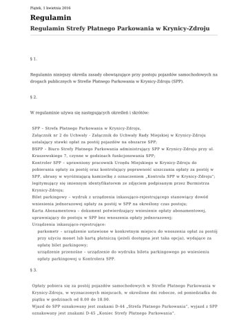Piątek, 1 kwietnia 2016 Regulamin Regulamin Strefy Płatnego Parkowania w Krynicy-Zdroju § 1. Regulamin niniejszy określa zasady obowiązujące przy postoju pojazdów samochodowych na drogach publicznych w Strefie Płatnego Parkowania w Krynicy-Zdroju (SPP). § 2. W regulaminie używa się następujących określeń i skrótów: SPP – Strefa Płatnego Parkowania w Krynicy-Zdroju, Załącznik nr 2 do Uchwały - Załącznik do Uchwały Rady Miejskiej w Krynicy-Zdroju ustalający stawki opłat za postój pojazdów na obszarze SPP; BSPP – Biuro Strefy Płatnego Parkowania administrujący SPP w Krynicy-Zdroju przy ul. Kraszewskiego 7, czynne w godzinach funkcjonowania SPP; Kontroler SPP – uprawniony pracownik Urzędu Miejskiego w Krynicy-Zdroju do pobierania opłaty za postój oraz kontrolujący poprawność uiszczania opłaty za postój w SPP, ubrany w wyróżniającą kamizelkę z oznaczeniem „Kontrola SPP w Krynicy-Zdroju”; legitymujący się imiennym identyfikatorem ze zdjęciem podpisanym przez Burmistrza Krynicy-Zdroju; Bilet parkingowy – wydruk z urządzenia inkasująco-rejestrującego stanowiący dowód wniesienia jednorazowej opłaty za postój w SPP na określony czas postoju; Karta Abonamentowa – dokument potwierdzający wniesienie opłaty abonamentowej, uprawniający do postoju w SPP bez wnoszenia opłaty jednorazowej; Urządzenia inkasująco-rejestrujące: parkometr – urządzenie ustawione w konkretnym miejscu do wnoszenia opłat za postój przy użyciu monet lub kartą płatniczą (jeżeli dostępna jest taka opcja), wydające za opłatę bilet parkingowy; urządzenie przenośne – urządzenie do wydruku biletu parkingowego po wniesieniu opłaty parkingowej u Kontrolera SPP. § 3. Opłaty pobiera się za postój pojazdów samochodowych w Strefie Płatnego Parkowania w Krynicy-Zdroju, w wyznaczonych miejscach, w określone dni robocze, od poniedziałku do piątku w godzinach od 8.00 do 18.00. Wjazd do SPP oznakowany jest znakami D-44 „Strefa Płatnego Parkowania”, wyjazd z SPP oznakowany jest znakami D-45 „Koniec Strefy Płatnego Parkowania”. SPP obejmuje wszystkie wyznaczone miejsca postojowe na drogach publicznych z wyłączeniem: 1) prawidłowo oznaczonych miejsc postojowych dla osób niepełnosprawnych; 2) wyznaczonych postojów taksówek; 3) wyznaczonych postojów dorożek konnych. W miejscach niewyznaczonych obowiązuje całkowity zakaz parkowania i postoju wszelkich pojazdów. Miejsca postojowe w Strefie Płatnego Parkowania są niestrzeżone. § 4. Obowiązkiem kierowcy pojazdu samochodowego parkującego w SPP jest wniesienie opłaty za postój bez uprzedniego wezwania, niezwłocznie po zaparkowaniu pojazdu za cały przewidziany czas postoju i nie później niż po upływie 5 minut od czasu zajęcia miejsca postojowego. Stawka opłaty za każdą godzinę postoju w SPP oraz zerową stawkę opłaty określa Załącznik nr 2 do Uchwały. Minimalnie opłacony czas postoju wynosi 1/2 godziny. Opłacenie dalszego czasu postoju następuje proporcjonalnie do wartości opłaconej kwoty. Opłaty za jednorazowy postój pojazdów samochodowych w SPP na określony czas uiszcza się poprzez: 1) wykupieniu za gotówkę biletu parkingowego od Kontrolera SPP; 2) wniesieniem opłaty gotówką w automatach do poboru opłat za postój (parkomaty) lub za pomocą karty płatniczej, jeżeli dostępna jest taka opcja w parkomacie. Potwierdzeniem uiszczenia opłaty jest bilet parkingowy wydany przez Kontrolera SPP lub wydruk z parkomatu. Opłacony bilet parkingowy kierujący pojazdem obowiązany jest umieścić awersem w widocznym miejscu za przednią szybą pojazdu samochodowego. Postój przy użyciu nieważnego dowodu wniesienia opłaty jest równoznaczne z nieuiszczeniem opłaty. Postój po upływie 5 minut od upływu czasu określonego na wydruku z parkomatu lub po upływie 5 minut od upływu czasu opłaconego za pomocą innych form płatności jest równoznaczne z nieuiszczeniem opłaty. W przypadku stwierdzenia awarii parkomatu, korzystający z pojazdu jest obowiązany do wykupienia biletu parkingowego w najbliżej zlokalizowanym czynnym parkomacie; Brak możliwości uregulowania opłaty w jednej z form wymienionych w ust. 2 nie zwalnia z obowiązku jej terminowego uregulowania w czasie wskazanym w ust. 1 przy użyciu pozostałych form. Przy pomocy parkomatu można regulować wyłącznie opłaty za postój pojazdu realizowany w danym dniu. Nie można tym sposobem regulować opłat za postój realizowany w dniach poprzedzających postój jak również opłaty dodatkowej za nieuiszczenie opłaty za postój pojazdu samochodowego w SPP. § 5. W SPP wprowadzono następujące opłaty abonamentowe: 1) „abonament mieszkańca”, 2) „abonament przedsiębiorcy”, 3) „abonament zwykły”. Stawki poszczególnych abonamentów określone zostały w Załączniku Nr 2 do Uchwały. Opłaty abonamentowe za postój pojazdów samochodowych w SPP uiszcza się gotówką w kasie Urzędu Miejskiego w Krynicy-Zdroju lub przelewem na rachunek bankowy Urzędu Miejskiego w Krynicy-Zdroju nr 53 8802 0002 2001 0000 1401 0001 – Bank Spółdzielczy Muszyna – Krynica-Zdrój. Uprawnienie do wykupienia „abonamentu mieszkańca” posiada osoba zameldowana w obszarze SPP na pobyt stały lub czasowy, z zastrzeżeniem pkt. 5, będąca właścicielem pojazdu samochodowego lub posiada inny ważny tytuł prawny do użytkowanego przez siebie pojazdu samochodowego. Osoby zameldowane na pobyt czasowy, będące najemcami lokalu mieszkalnego, usytuowanego na obszarze SPP, nabywają uprawnienia do wykupienia „abonamentu mieszkańca”, od chwili zameldowania, pod warunkiem że zamierzony czas trwania pobytu wynosi minimum 3 miesiące, na okres maksymalnie 12 miesięcy, jednak nie dłużej niż na czas zameldowania. Koniecznym do jego nabycia jest przedłożenie zaświadczenia o czasowym zameldowaniu, potwierdzonego przez Urząd Miejski w Krynicy-Zdroju, Wydział Spraw Obywatelskich jako aktualn
