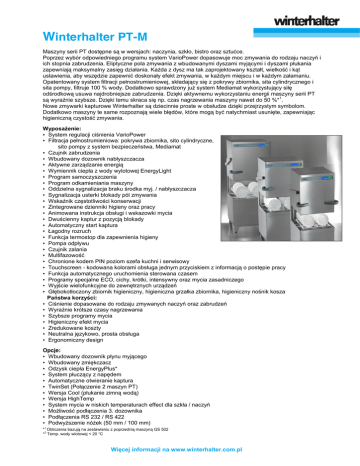 Winterhalter PT-M Maszyny serii PT dostępne są w wersjach: naczynia, szkło, bistro oraz sztućce. Poprzez wybór odpowiedniego programu system VarioPower dopasowuje moc zmywania do rodzaju naczyń i ich stopnia zabrudzenia. Eliptyczne pola zmywania z wbudowanymi dyszami myjącymi i dyszami płukania zapewniają maksymalny zasięg działania. Każda z dysz ma tak zaprojektowany kształt, wielkość i kąt ustawienia, aby wszędzie zapewnić doskonały efekt zmywania, w każdym miejscu i w każdym załamaniu. Opatentowany system filtracji pełnostrumieniowej, składający się z pokrywy zbiornika, sita cylindrycznego i sita pompy, filtruje 100 % wody. Dodatkowo sprawdzony już system Mediamat wykorzystujący siłę odśrodkową usuwa najdrobniejsze zabrudzenia. Dzięki aktywnemu wykorzystaniu energii maszyny serii PT są wyraźnie szybsze. Dzięki temu skraca się np. czas nagrzewania maszyny nawet do 50 %*1. Nowe zmywarki kapturowe Winterhalter są dziecinnie proste w obsłudze dzięki przejrzystym symbolom. Dodatkowo maszyny te same rozpoznają wiele błędów, które mogą być natychmiast usunięte, zapewniając higieniczną czystość zmywania. Wyposażenie: ▪ System regulacji ciśnienia VarioPower ▪ Filtracja pełnostrumieniowa: pokrywa zbiornika, sito cylindryczne, sito pompy z system bezpieczeństwa, Mediamat ▪ Czujnik zabrudzenia ▪ Wbudowany dozownik nabłyszczacza ▪ Aktywne zarządzanie energią ▪ Wymiennik ciepła z wody wylotowej EnergyLight ▪ Program samoczyszczenia ▪ Program odkamieniania maszyny ▪ Oddzielna sygnalizacja braku środka myj. / nabłyszczacza ▪ Sygnalizacja usterki blokady pól zmywania ▪ Wskaźnik częstotliwości konserwacji ▪ Zintegrowane dzienniki higieny oraz pracy ▪ Animowana instrukcja obsługi i wskazowki mycia ▪ Dwuścienny kaptur z pozycją blokady ▪ Automatyczny start kaptura ▪ Łagodny rozruch ▪ Funkcja termostop dla zapewnienia higieny ▪ Pompa odpływu ▪ Czujnik zalania ▪ Multifazowość ▪ Chronione kodem PIN poziom szefa kuchni i serwisowy ▪ Touchscreen - kodowana kolorami obsługa jednym przyciskiem z informacją o postępie pracy ▪ Funkcja automatycznego uruchomienia sterowana czasem ▪ Programy specjalne ECO, cichy, krótki, intensywny oraz mycia zasadniczego ▪ Wyjście wielofunkcyjne do zewnętrznych urządzeń ▪ Głębokotłoczony zbiornik higieniczny, higieniczna grzałka zbiornika, higieniczny nośnik kosza Państwa korzyści: ▪ Ciśnienie dopasowane do rodzaju zmywanych naczyń oraz zabrudzeń ▪ Wyraźnie krótsze czasy nagrzewania ▪ Szybsze programy mycia ▪ Higieniczny efekt mycia ▪ Zredukowane koszty ▪ Neutralna językowo, prosta obsługa ▪ Ergonomiczny design Opcje: ▪ Wbudowany dozownik płynu myjącego ▪ Wbudowany zmiękczacz ▪ Odzysk ciepła EnergyPlus* ▪ System płuczący z napędem ▪ Automatyczne otwieranie kaptura ▪ TwinSet (Połączenie 2 maszyn PT) ▪ Wersja Cool (płukanie zimną wodą) ▪ Wersja HighTemp ▪ System mycia w niskich temperaturach effect dla szkła / naczyń ▪ Możliwość podłączenia 3. dozownika ▪ Podłączenia RS 232 / RS 422 ▪ Podwyższenie nóżek (50 mm / 100 mm) *1 Obliczenia bazują na zestawieniu z poprzednią maszyną GS 502 *2 Temp. wody wlotowej < 20 °C Więcej informacji na www.winterhalter.com.pl Winterhalter PT-M Wymiary Szer. x głęb.: Wys. z zamkniętym kapturem: Wys. z otwartym kapturem: Wys. EnergyPlus: Kosz: Wys. wejścia: Podłączenie wody: Podłączenie odpływu: 635 x 750 mm 1.515 mm 1.995 mm 2.195 mm 500 x 500 mm 440 mm G ¾” 18,5 / 22,2 / 39,7 mm (podłączenie stopniowane) Wartości ogólne A = 635 mm B = 585 mm C = 1.515 mm G = 2.195 mm H = 610 mm Waga standard (netto / brutto): Waga EnergyPlus (netto / brutto): Wielkość zbiornika: Pompa myjąca (zależnie od programu): Emisja hałasu 134 / 159 kg 157 / 185 kg 35 l 190 - 240 l/min (zależnie od programu): < 66 dB(A) IPX5 Ochrona przeciwbryzgowa: Maksymalna teoretyczna wydajność Cykl Maszyna do naczyń: Maszyna do szkła: Maszyna bistro: Maszyna do sztućców: 72 / 44 / 32 / 22 (koszy/h) 77 / 22 / 32 / 48 (koszy/h) 72 / 28 / 32 / 40 (koszy/h) 21 / 11 (koszy/h) Maszyna do naczyń: Maszyna do szkła: Maszyna bistro: Maszyna do sztućców: Talerzy/h: Szkła/h: 1.296 / 792 / 576 / 396 1.232 / 352 / 512 / 768 Podłączenie wody Ilość wody płuczącej (w zależności od wybranego programu) Maszyna do szkła, naczyń i bistro: Maszyna do sztućców: Maszyna do szkła Cool : 2,4 l na kosz 4,0 l na kosz 4,0 l na kosz Minimalne ciśnienie: Minimalne ciśnienie EnergyPlus: Ilość wody przepływającej: Ilość wody przepł. EnergyPlus: Temp. wody wlotowej.: Temp wody wlotowej EnergyPlus & Cool: 50 – 164 Sek. 47 – 163 Sek. 50 – 129 Sek. 171 – 327 Sek. 1,0 bar 1,5 bar min. 4 l/min min. 4 l/min max. 60 °C max. 20 °C Emisja ciepła z maszyny (w zależności od wybranego programu) Właściwe / Utajone (EnergyPlus) 0,8 / 0,3 (0,6 / 0,2) kW Właściwe / Utajone (EnergyPlus) sztućce: 0,7 / 0,2 (0,6 / 0,1) kW Naczynia / Szkło / Bistro: Deklaracja zgodności CB, SVGW, WRAS Obciążenie na 1 nóżkę Standard / EnergyPlus: 43,75 / 49,5 kg Ilość pary Metry sześcienne/h (naczynia / bistro): Metry sześcienne /h (szkło): Metry sześcienne /h (sztućce): Wilgotność względna: Wilgotność wzgl. EnergyPlus: Temperatura (naczynia / szkło / bistro): Temperatura (sztućce): Temperatura EnergyPlus: 28 30 8 100 % 75 % 60 °C 69 °C 35 °C Wartości elektryczne Napięcie 380 V / 3 N~ / 50 – 60 Hz 400 V / 3 N~ / 50 – 60 Hz 415 V / 3 N~ / 50 – 60 Hz 200 V / 3 N~ / 50 – 60 Hz 230 V / 3 N~ / 50 – 60 Hz 230 V / 1 N~ / 50 – 60 Hz 240 V / 1 N~ / 50 – 60 Hz Całkowita moc przyłączeniowa z grzałką bojlera 6,4 kW Całkowita moc przyłączeniowa z grzałką bojlera 10,8 kW 16 A 16 A 25 A 32 A 15 A 16 A / 20 A 25 A 32 A 25 A 32 A 25 A 32 A 50 A 7,1 kW 7,9 kW 10,2 kW – 6,9 kW 8,4 kW 10,9 kW – 6,6 kW 8,0 kW 7,8 kW 10,1 kW – 8,3 kW 9,1 kW 13,2 